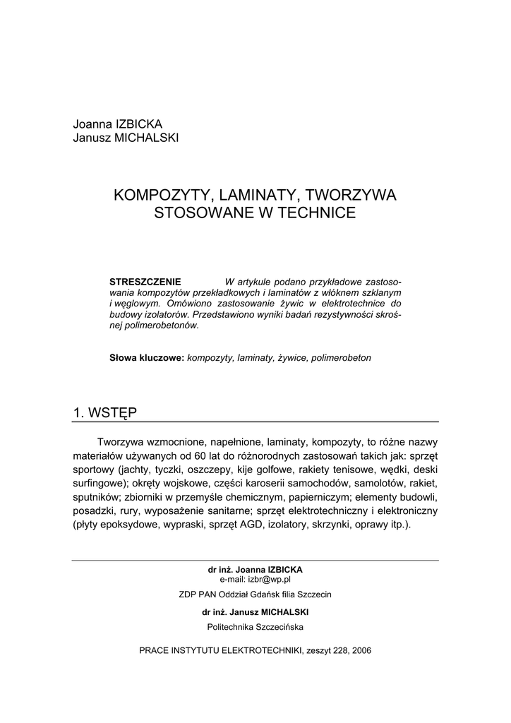 KOMPOZYTY, LAMINATY, TWORZYWA STOSOWANE W TECHNICE