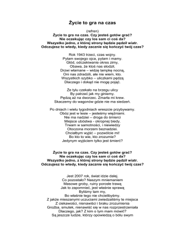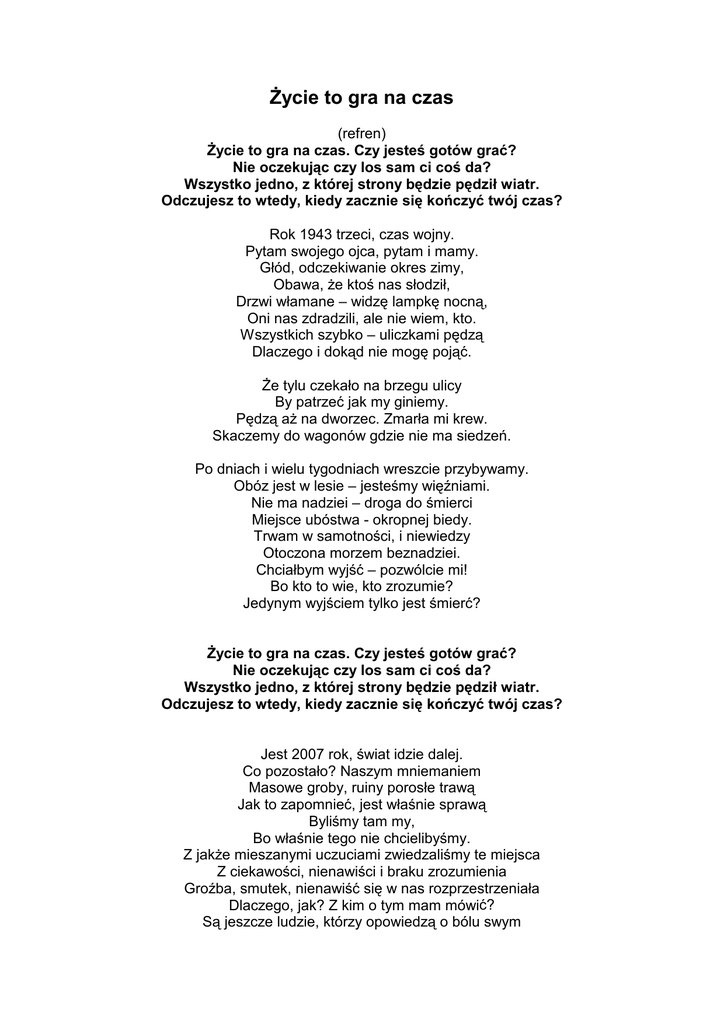 śycie to gra na czas (refren) śycie to gra na czas. Czy jesteś gotów grać? Nie oczekując czy los sam ci coś da? Wszystko jedno, z której strony będzie pędził wiatr. Odczujesz to wtedy, kiedy zacznie się kończyć twój czas? Rok 1943 trzeci, czas wojny. Pytam swojego ojca, pytam i mamy. Głód, odczekiwanie okres zimy, Obawa, Ŝe ktoś nas słodził, Drzwi włamane – widzę lampkę nocną, Oni nas zdradzili, ale nie wiem, kto. Wszystkich szybko – uliczkami pędzą Dlaczego i dokąd nie mogę pojąć. śe tylu czekało na brzegu ulicy By patrzeć jak my giniemy. Pędzą aŜ na dworzec. Zmarła mi krew. Skaczemy do wagonów gdzie nie ma siedzeń. Po dniach i wielu tygodniach wreszcie przybywamy. Obóz jest w lesie – jesteśmy więźniami. Nie ma nadziei – droga do śmierci Miejsce ubóstwa - okropnej biedy. Trwam w samotności, i niewiedzy Otoczona morzem beznadziei. Chciałbym wyjść – pozwólcie mi! Bo kto to wie, kto zrozumie? Jedynym wyjściem tylko jest śmierć? śycie to gra na czas. Czy jesteś gotów grać? Nie oczekując czy los sam ci coś da? Wszystko jedno, z której strony będzie pędził wiatr. Odczujesz to wtedy, kiedy zacznie się kończyć twój czas? Jest 2007 rok, świat idzie dalej. Co pozostało? Naszym mniemaniem Masowe groby, ruiny porosłe trawą Jak to zapomnieć, jest właśnie sprawą Byliśmy tam my, Bo właśnie tego nie chcielibyśmy. Z jakŜe mieszanymi uczuciami zwiedzaliśmy te miejsca Z ciekawości, nienawiści i braku zrozumienia Groźba, smutek, nienawiść się w nas rozprzestrzeniała Dlaczego, jak? Z kim o tym mam mówić? Są jeszcze ludzie, którzy opowiedzą o bólu swym Słucham ich i właśnie nadszedł czas Dla podjęcia sensownego działania. By sprawy w dobro przekształcić Jesteśmy gotowi tego się nauczyć. Mamy idee, które nie za długo Zapewnią naszą przyszłość. śycie to gra na czas. Czy jesteś gotów grać? Nie oczekując czy los sam ci coś da? Wszystko jedno, z której strony będzie pędził wiatr. Odczujesz to wtedy, kiedy zacznie się kończyć twój czas? Jesteśmy odpowiedzialni, przyszłość w naszych rękach Wszyscy idą do środka, nikogo nie ma na poboczach. KaŜdy swym marzeniem lepszego świata Z respektem, tolerancją swoje Ŝycie splata. Spoglądamy naprzód, ale nigdy wstecz. Chcemy pokoju, bo to jest nasz cel. Który osiągniemy wszyscy razem. Zmuszeni do pracy traktowani jak śmieć Jeśli się nie poruszają, odrzucani precz. Zabijani, do masowych grobów porzucani. Korpus zamiera pozostaje ich duch. I dlatego nie chcemy więcej cierpień! I dlatego jest czas by pokazać! śe nie chcemy więcej murów i kolczastych drutów! śadnych ludzi bez radości i bez marzeń. A miast tego przyjaźń, tolerancja, wolność! Zamiast nienawiści, dyskryminacji i nierówności! śadnych ludzi bez jedzenia i okrycia śadnych prześladowań z racji innych poglądów Niewinnych ludzi prześladowała SS Pozbawieni współczucia i respektu. Dlatego dziś im mówimy – Koniec! Pogardy, nigdy więcej faszyzmu! śycie to gra na czas. Czy jesteś gotów grać? Nie oczekując czy los sam ci coś da? Wszystko jedno, z której strony będzie pędził wiatr. Odczujesz to wtedy, kiedy zacznie się kończyć twój czas? Widziałem ten pomnik i myślałem o nim. O tym jak dawniej wybuchła wojna. Nie moŜna zapomnieć, jak to było dawniej O wszystkim, co stało się w tym czasie Tak to było i to właśnie jest faktem. Nie chcemy Ŝadnych przeproszeń od tych w mundurach. Tego nie zapomina się. Więcej integracji zamiast polityki prawicowej! śycie to gra na czas. Czy jesteś gotów grać? Nie oczekując czy los sam ci coś da? Wszystko jedno, z której strony będzie pędził wiatr. Odczujesz to wtedy, kiedy zacznie się kończyć twój czas? Józef Kuźba