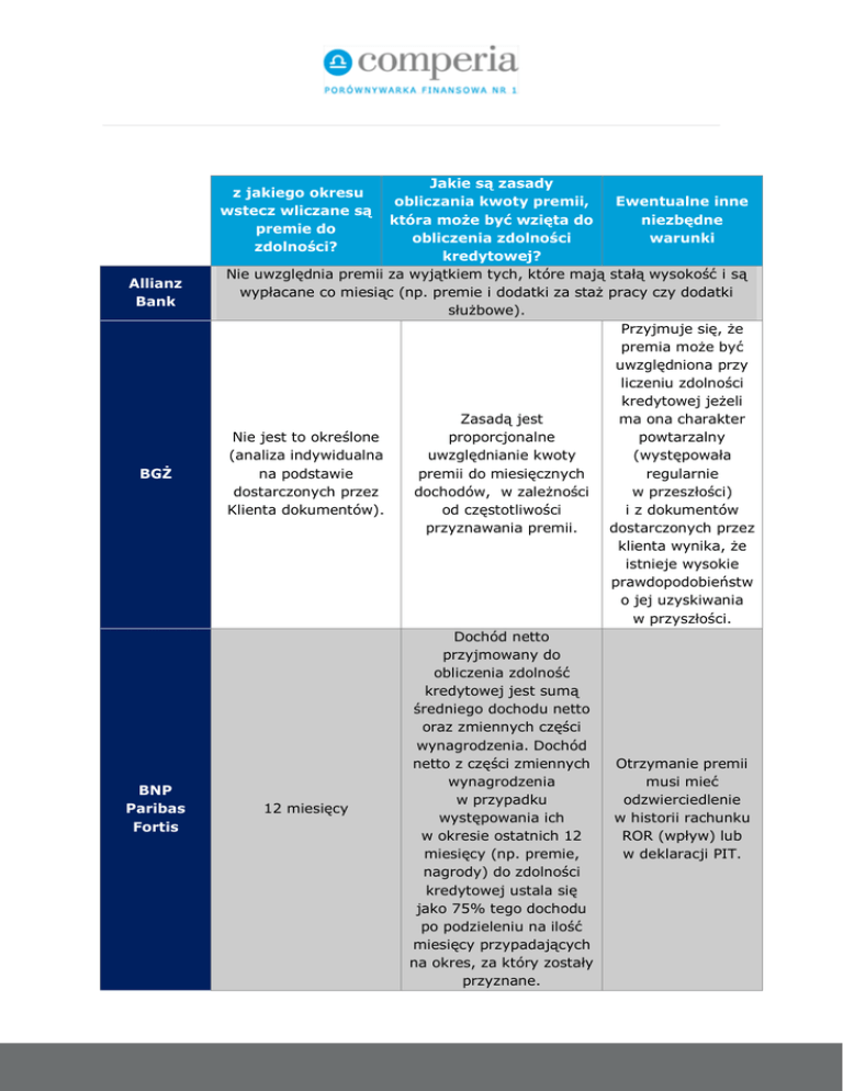 Jakie są zasady obliczania kwoty premii, Ewentualne inne która może być wzięta do niezbędne obliczenia zdolności warunki kredytowej? Nie uwzględnia premii za wyjątkiem tych, które mają stałą wysokość i są wypłacane co miesiąc (np. premie i dodatki za staż pracy czy dodatki służbowe). Przyjmuje się, że premia może być uwzględniona przy liczeniu zdolności kredytowej jeżeli Zasadą jest ma ona charakter Nie jest to określone proporcjonalne powtarzalny (analiza indywidualna uwzględnianie kwoty (występowała na podstawie premii do miesięcznych regularnie dostarczonych przez dochodów, w zależności w przeszłości) Klienta dokumentów). od częstotliwości i z dokumentów przyznawania premii. dostarczonych przez klienta wynika, że istnieje wysokie prawdopodobieństw o jej uzyskiwania w przyszłości. Dochód netto przyjmowany do obliczenia zdolność kredytowej jest sumą średniego dochodu netto oraz zmiennych części wynagrodzenia. Dochód netto z części zmiennych Otrzymanie premii wynagrodzenia musi mieć w przypadku odzwierciedlenie 12 miesięcy występowania ich w historii rachunku w okresie ostatnich 12 ROR (wpływ) lub miesięcy (np. premie, w deklaracji PIT. nagrody) do zdolności kredytowej ustala się jako 75% tego dochodu po podzieleniu na ilość miesięcy przypadających na okres, za który zostały przyznane. z jakiego okresu wstecz wliczane są premie do zdolności? Allianz Bank BGŻ BNP Paribas Fortis BPS Deutsche Bank DnB NORD Getin Noble Bank ING Bank Śląski Kredyt Bank Do oceny zdolności kredytowej Klienta brany jest jego wyciąg z konta za ostatnie 3 miesiące przed złożeniem wniosku kredytowego. Nie występują oddzielne zasady wyliczania kwoty premii. Klient musi przedstawić nie zaświadczenie o dochodach z ostatnich 3 miesięcy. Jeśli premia jest regulaminowa: W przypadku dochodów miesięczna lub kwartalna uzyskiwanych na – bank przyjmuje 100% podstawie umowy o wysokości premii pracę bank bierze pod obliczonej jako średnia uwagę średni dochód z 12 ostatnich mies. Jeśli z okresu 6 miesięcy jest przyznawana (kredyty hipoteczne) lub nieregularnie nie 3 miesięcy (pozostałe (uznaniowa) - bierze pod kredyty) - premie są uwagę 50% wysokości brane pod uwagę jeżeli premii obliczonej jako zostały uzyskane średnia z 12 ostatnich w badanym okresie (3mies. w innych lub 6-miesięcznym) przypadkach - na indywidualnych warunkach. Do wyliczenia zdolności kredytowej brany pod Standardowo za 6 uwagę jest dochód nie miesięcy z premii - 50% średniej z okresu uzyskiwania. Zależy, za jaki okres Średnia z ostatnich X premie zostaną podane miesięcy (z na zaświadczeniu od zaświadczenia nie pracodawcy. min. 3 pracodawcy, min. 3 miesiące miesiące) Do wyliczenia dochodu przyjmowane są płace o charakterze powtarzalnym i przewidywalnym, w tym płace z tytułu podstawy wynagrodzenia a także premie. Natomiast szczegółowe sposoby wyliczenia dochodu są uregulowane wewnętrznymi przepisami banku i mają charakter zastrzeżony. Do wyliczenia zdolności Bank opiera się na kredytowej dostarczonym przez przyjmowane jest klienta zaświadczeniu o Nie średnie miesięczne wysokości wynagrodzenie z okresu wynagrodzenia. Jeżeli ostatnich 3 miesięcy. w prezentowanych Lukas Bank mBank Bank Millennium MultiBank Nordea Bank kwotach zostały uwzględnione premie (np. roczne), to bank przyjmuje ten dochód bez dodatkowej analizy. Dochód z tytułu premii jest przyjmowany w całości (jako dodatkowy dochód w analizowanym okresie). Do liczenia zdolności kredytowej bank bierze pod uwagę dochód podany przez pracodawcę na zaświadczeniu o zarobkach, jeżeli jest tam wliczona premia, to także ją uwzględnia. Kredyt jest udzielany na podstawie zaświadczenia o zatrudnieniu i wynagrodzeniu, a dokładniej kwoty, jaka się tam znajduje. Premia może być Okres, za jaki średni uwzględniona poziom premii jest w trakcie oceny badany, a także zasady, Premie są uwzględniane zdolności na jakich jest wyliczany w wysokości średniej kredytowej pod zależą od tego, w jakim z okresu, w którym warunkiem, że jest trybie wypłacana jest zostały otrzymane. uzyskiwana premia – tj. co regularnie, miesiąc/kwartał/półrocz przynajmniej raz e, czy rok. w roku. Standardowo, bank prosi o udokumentowanie całości dochodów klienta. Dotyczy to zarówno dochodu podstawowego, jak i premii. Decyzja dot. tego, czy i w jakim stopniu premia może zostać uwzględniona do wyliczenia zdolności kredytowej jest podejmowana w wyniku indywidualnej analizy. w tym procesie liczy się m.in. to, czy premia jest wypłacana regularnie, czy ma charakter incydentalny oraz jak często świadczenia z tego tytułu wpływają na rachunek. w większości przypadków fakt otrzymywania premii może znaleźć odzwierciedlenie w kalkulacjach dot. zdolności kredytowej. w przypadku dochodów uzyskiwanych Bank premie Jeżeli premie uzyskiwane na podstawie umowy o wlicza, pod są co miesiąc, to bank pracę bank bierze pod warunkiem uwzględnia średnią uwagę średni dochód udokumentowania, z badanego okresu (3z okresu 6 miesięcy że są uzyskiwane lub 6-miesięcznego), (kredyty hipoteczne) lub regularnie (np. jeżeli nie, to uwzględnia 3 miesięcy (pozostałe premie roczne 1/12 premii uzyskanej kredyty) - premie są porównanie w badanym okresie brane pod uwagę jeżeli z rokiem ubiegłym). zostały uzyskane Polbank Toyota Bank w badanym okresie (3lub 6-miesięcznym) Bank przyjmuje dochód netto z zaświadczenia na druku Banku za ostatnie 6 miesięcy. W Toyota Bank do zdolności kredytowej wymagana jest średnia z trzech miesięcy w tym premii, dodatków, nagród (cały dochód brutto z trzech miesięcy).