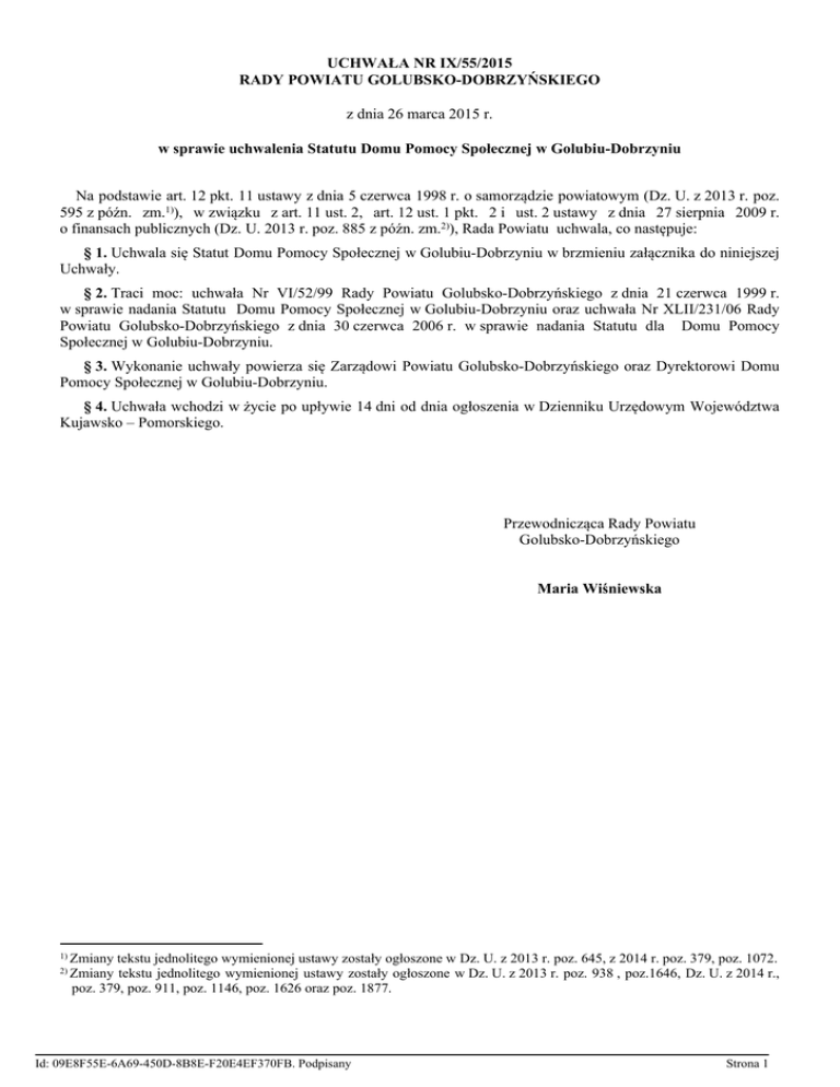UCHWAŁA NR IX/55/2015 RADY POWIATU GOLUBSKO-DOBRZYŃSKIEGO z dnia 26 marca 2015 r. w sprawie uchwalenia Statutu Domu Pomocy Społecznej w Golubiu-Dobrzyniu Na podstawie art. 12 pkt. 11 ustawy z dnia 5 czerwca 1998 r. o samorządzie powiatowym (Dz. U. z 2013 r. poz. 595 z późn. zm.1)), w związku z art. 11 ust. 2, art. 12 ust. 1 pkt. 2 i ust. 2 ustawy z dnia 27 sierpnia 2009 r. o finansach publicznych (Dz. U. 2013 r. poz. 885 z późn. zm.2)), Rada Powiatu uchwala, co następuje: § 1. Uchwala się Statut Domu Pomocy Społecznej w Golubiu-Dobrzyniu w brzmieniu załącznika do niniejszej Uchwały. § 2. Traci moc: uchwała Nr VI/52/99 Rady Powiatu Golubsko-Dobrzyńskiego z dnia 21 czerwca 1999 r. w sprawie nadania Statutu Domu Pomocy Społecznej w Golubiu-Dobrzyniu oraz uchwała Nr XLII/231/06 Rady Powiatu Golubsko-Dobrzyńskiego z dnia 30 czerwca 2006 r. w sprawie nadania Statutu dla Domu Pomocy Społecznej w Golubiu-Dobrzyniu. § 3. Wykonanie uchwały powierza się Zarządowi Powiatu Golubsko-Dobrzyńskiego oraz Dyrektorowi Domu Pomocy Społecznej w Golubiu-Dobrzyniu. § 4. Uchwała wchodzi w życie po upływie 14 dni od dnia ogłoszenia w Dzienniku Urzędowym Województwa Kujawsko – Pomorskiego. Przewodnicząca Rady Powiatu Golubsko-Dobrzyńskiego Maria Wiśniewska 1) Zmiany tekstu jednolitego wymienionej ustawy zostały ogłoszone w Dz. U. z 2013 r. poz. 645, z 2014 r. poz. 379, poz. 1072. tekstu jednolitego wymienionej ustawy zostały ogłoszone w Dz. U. z 2013 r. poz. 938 , poz.1646, Dz. U. z 2014 r., poz. 379, poz. 911, poz. 1146, poz. 1626 oraz poz. 1877. 2) Zmiany Id: 09E8F55E-6A69-450D-8B8E-F20E4EF370FB. Podpisany Strona 1 Załącznik do Uchwały Nr IX/55/2015 Rady Powiatu Golubsko-Dobrzyńskiego z dnia 26 marca 2015 r. Statut Domu Pomocy Społecznej w Golubiu-Dobrzyniu Rozdział 1. Postanowienia ogólne § 1. 1. Dom Pomocy Społecznej w Golubiu-Dobrzyniu zwany dalej Domem jest jednostką organizacyjną Powiatu Golubsko-Dobrzyńskiego, nieposiadającą osobowości prawnej, działającą w formie jednostki budżetowej. 2. Dom używa nazwy Dom Pomocy Społecznej w Golubiu-Dobrzyniu. 3. Siedzibą Domu jest miejscowość Golub-Dobrzyń. 4. Obszarem działania Domu jest Powiat Golubsko-Dobrzyński. 5. Dom jest pracodawcą w rozumieniu przepisów prawa. 6. Nadzór nad Domem i jego działalnością sprawuje Starosta Golubsko-Dobrzyński. § 2. Dom działa na podstawie: 1. ustawy z dnia 12 marca 2004 r. o pomocy społecznej (Dz. U. z 2015 r. poz. 1631 z późn. zm.), 2. ustawy z dnia 27 sierpnia 2009 r. o finansach publicznych (Dz. U. 2013 r. poz. 885 z późn. zm.), 3. ustawy z dnia 5 czerwca 1998 r. o samorządzie powiatowym (Dz. U. 2013, poz. 595), 4. ustawy z dnia 19 sierpnia 1994 r. o ochronie zdrowia psychicznego (Dz. U. z 2011 r. Nr 231, poz. 1375), 5. rozporządzenia Ministra Pracy i Polityki Społecznej z dnia 27 sierpnia 2012 r. w sprawie domów pomocy społecznej (Dz. U. z 2012 r. poz. 964), 6. niniejszego Statutu, 7. innych ustaw, stosownych rozporządzeń, a także odpowiednich uchwał i decyzji właściwych organów powiatu. Rozdział 2. Przedmiot działania Domu § 3. 1. Dom jest miejscem stałego pobytu, przeznaczonym dla dorosłych mężczyzn niepełnosprawnych intelektualnie. 2. Dom zapewnia mieszkańcom całodobową opiekę oraz zaspokaja niezbędne potrzeby bytowe, opiekuńcze i wspomagające na poziomie obowiązującego standardu, w zakresie i formach wynikających z indywidualnych potrzeb mieszkańców. 3. Organizacja Domu, zakres i poziom usług świadczonych przez dom uwzględnia w szczególności wolność, intymność, godność i poczucie bezpieczeństwa mieszkańców oraz stopień ich fizycznej i psychicznej sprawności. 4. Dom umożliwia mieszkańcom korzystanie z przysługujących według odrębnych przepisów świadczeń zdrowotnych. Rozdział 3. Organizacja i zarządzanie § 4. 1. Domem kieruje jednoosobowo i reprezentuje go na zewnątrz Dyrektor. Id: 09E8F55E-6A69-450D-8B8E-F20E4EF370FB. Podpisany Strona 1 2. Dyrektora zatrudnia Zarząd Powiatu Golubsko-Dobrzyńskiego, zgodnie z wymogami określonymi w art. 122 ust. 1 o pomocy społecznej, po zasięgnięciu opinii Kierownika Powiatowego Centrum Pomocy Rodzinie w Golubiu-Dobrzyniu. 3. Dyrektor Domu wykonuje czynności pracodawcy w stosunku do pracowników. § 5. Dyrektora w czasie jego nieobecności zastępuje pracownik socjalny. § 6. 1. Kierując Domem Dyrektor odpowiada za jego działalność i realizację zadań statutowych oraz prawidłowe gospodarowanie jego mieniem i środkami finansowymi. 2. W celu realizacji zadań Domu Dyrektor jest upoważniony do wydawania zarządzeń, regulaminów i instrukcji. § 7. Szczegółową organizację i zasady funkcjonowania określa Regulamin Organizacyjny uchwalony przez Zarząd Powiatu Golubsko-Dobrzyńskiego. Rozdział 4. Mienie i gospodarka finansowa § 8. 1. Dom zarządza mieniem stanowiącym własność Powiatu Golubsko-Dobrzyńskiego przekazanym w trwały zarząd. 2. Dom jako powiatowa jednostka budżetowa prowadzi gospodarkę finansową zgodnie z zasadami określonymi dla jednostek budżetowych. 3. Podstawą gospodarki finansowej Domu jest roczny plan dochodów i wydatków zwany planem finansowym jednostki budżetowej. 4. Pobyt w Domu jest odpłatny, zasady ustalania i wysokość opłat regulują odrębne przepisy. Rozdział 5. Postanowienia końcowe § 9. Dom podlega wpisowi do prowadzonego przez Wojewodę Kujawsko – Pomorskiego rejestru Domów Pomocy Społecznej. § 10. Zmiany Statutu następują w formie właściwej dla jego uchwalenia. Id: 09E8F55E-6A69-450D-8B8E-F20E4EF370FB. Podpisany Strona 2 UZASADNIENIE Obecnie Dom Pomocy Społecznej w Golubiu-Dobrzyniu działa na podstawie Statutu nadanego Uchwałą XLII/231/06 Rady Powiatu Golubsko-Dobrzyńskiego z dnia 30 czerwca 2006 r. Zmiany w przepisach dotyczących pomocy społecznej oraz nowelizacja dotychczas obowiązujących przepisów prawa spowodowały konieczność wprowadzenia zmian i nadania n