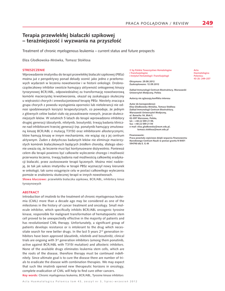 praca poglądowa / review 249 Terapia przewlekłej białaczki szpikowej – teraźniejszość i wyzwania na przyszłość Treatment of chronic myelogenous leukemia – current status and future prospects Eliza Głodkowska-Mrówka, Tomasz Stokłosa Streszczenie Wprowadzenie imatynibu do terapii przewlekłej białaczki szpikowej (PBSz) można już z perspektywy ponad dekady ocenić jako jedno z przełomowych wydarzeń w leczeniu nowotworów i w historii onkologii. Drobnocząsteczkowy inhibitor swoiście hamujący aktywność onkogennej kinazy tyrozynowej BCR/ABL, odpowiedzialnej za transformację nowotworową komórki macierzystej krwiotworzenia, okazał się zaskakująco skuteczny u większości chorych i zrewolucjonizował terapię PBSz. Niestety znacząca grupa chorych z powodu wystąpienia oporności lub nietolerancji nie odnosi spodziewanych korzyści terapeutycznych, co powoduje, że jednym z głównych celów badań stało się poszukiwanie nowych, jeszcze skuteczniejszych leków. W ostatnich 5 latach do terapii wprowadzono inhibitory drugiej generacji (dasatynib, nilotynib, bosutynib), trwają badania kliniczne nad inhibitorami trzeciej generacji (np. ponatynib hamujący zmutowaną kinazę BCR/ABL z mutacją T315I) oraz inhibitorami allosterycznymi, które hamują kinazę w innym mechanizmie, nie wiążąc się z jej centrum aktywnym. Żaden z dotychczas badanych leków nie eliminuje macierzystych komórek białaczkowych będących źródłem choroby, dlatego obecnie uważa się, że leczenie musi być kontynuowane dożywotnio. Ponieważ celem dla terapii powinno być całkowite wyleczenie chorego i możliwość przerwania leczenia, trwają badania nad możliwością całkowitej eradykacji białaczki, przez zastosowanie terapii łączonych. Można mieć nadzieję, że tak jak sukces imatynibu w terapii PBSz wyznaczył nowy kierunek w onkologii, tak samo osiągnięcie celu w postaci całkowitego wyleczenia pomoże w znalezieniu skutecznej terapii w innych nowotworach. © by Polskie Towarzystwo Hematologów i Transfuzjologów i Instytut Hematologii i Transfuzjologii Otrzymano: 29.08.2012 Zaakceptowano: 12.09.2012 Zakład Immunologii Centrum Biostruktury, Warszawski Uniwersytet Medyczny, Polska Autorzy nie zgłaszają konfliktu interesu Autor do korespondencji: Eliza Głodkowska-Mrówka, Tomasz Stokłosa Zakład Immunologii Centrum Biostruktury, Warszawski Uniwersytet Medyczny, ul. Banacha 1A, Blok F, 02-097 Warszawa, Polska, tel.: +48 22 599 21 99, fax: +48 22 599 21 94 e-mail: [email protected], [email protected] Finansowanie: Praca powstała częściowo dzięki wsparciu finansowemu Narodowego Centrum Nauki w postaci grantu N N401 594740 dla E. G-M Słowa kluczowe: przewlekła białaczka szpikowa, BCR/ABL, inhibitory kinaz tyrozynowych Abstract Introduction of imatinib to the treatment of chronic myelogenous leukemia (CML) more than a decade ago may be considered as one of the milestones in the history of cancer treatment and oncology. Small molecule inhibitor, which specifically inhibits BCR/ABL oncogenic tyrosine kinase, responsible for malignant transformation of hematopoietic stem cell proved to be unexpectedly effective in the majority of patients and has revolutionized CML therapy. Unfortunately, a significant group of patients develops resistance or is intolerant to the drug which necessitate search for new better drugs. In the last 5 years 2nd generation inhibitors have been approved (dasatinib, nilotinib and bosutinib), clinical trials are ongoing with 3rd generation inhibitors (among them ponatinib, active against BCR/ABL with T315I mutation) and allosteric inhibitors. None of the available drugs eliminates leukemia stem cells, which are the roots of the disease, therefore therapy must be continued indefinitely. Since ultimate goal is to cure the disease there are number of trials to eradicate the disease with combination therapies. We may expect that such like imatinib opened new therapeutic horizons in oncology, complete eradication of CML will help to find cure other cancers. Key words: Chronic myelogenous leukemia, BCR/ABL, Tyrosine kinase inhibitors Ac t a H aemato l og ic a Po l o nic a to m 43, ze s z y t nr 3, l ipie c-wr ze s ie ń 2012 Acta Haematologica Polonica; 43 (3): 249–257 250 praca poglądowa / review Ryc. 1. Najważniejsze odkrycia w badaniach nad patogenezą i terapią przewlekłej białaczki szpikowej Fig. 1. Timeline of the major discoveries on CML pathogenesis and therapy Przewlekła białaczka szpikowa (PBSz) jest wprawdzie chorobą rzadką, jednak od momentu, kiedy to przed ponad 50 laty po raz pierwszy powiązano zmianę genetyczną (w tej chorobie zwaną chromosomem Filadelfia) z procesem nowotworowym, często bywa ona określana jako modelowa choroba nowotworowa [1, 2]. Również w tej chorobie nowotworowej po raz pierwszy zastosowano skuteczną terapię celowaną, wprowadzając do leczenia drobnocząsteczkowy inhibitor swoisty wobec onkogennej kinazy BCR/ ABL – imatynib. Historię najważniejszych odkryć związanych z PBSz i terapią tej choroby przedstawia rycina 1. Imatynib W latach 90. XX wieku Brian Druker we współpracy z naukowcami z firmy Ciba-Geigy rozpoczęli prace nad poszukiwaniem doustnej pochodnej 2-fenylaminopirymidyny, która mogłaby hamować kinazę BCR/ ABL. Wyniki badań przedklinicznych związku nazwanego roboczo STI571 zostały po raz pierwszy opublikowane w 1996 roku i były na tyle obiecujące [3, 4], że już dwa lata później rozpoczęto próby kliniczne nowego leku, a w 2001 roku FDA zarejestrowała pierwszy inhibitor kinazy tyrozynowej – imatynib (Ryc.1). Imatynib nie tylko zrewolucjonizował terapię PBSz, ale zmienił podejście do leczenia innych typów nowotworów, rozpoczynając ekspansję inhibitorów kinaz tyrozynowych jako nowej grupy leków onkologicznych. Przed wprowadzeniem imatynibu skuteczne leczenie PBSz było dostępne tylko dla niewielkiego odsetka pacjentów, u których możliwe było przepro