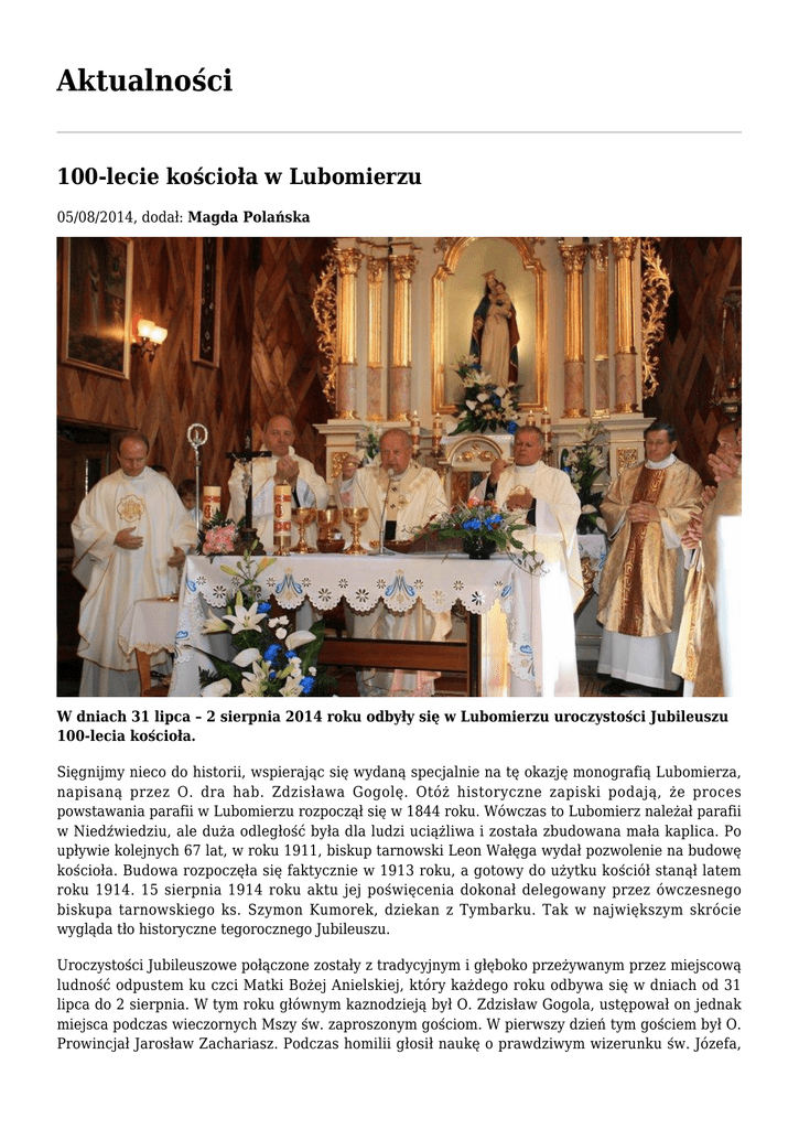 Aktualności 100-lecie kościoła w Lubomierzu 05/08/2014, dodał: Magda Polańska W dniach 31 lipca – 2 sierpnia 2014 roku odbyły się w Lubomierzu uroczystości Jubileuszu 100-lecia kościoła. Sięgnijmy nieco do historii, wspierając się wydaną specjalnie na tę okazję monografią Lubomierza, napisaną przez O. dra hab. Zdzisława Gogolę. Otóż historyczne zapiski podają, że proces powstawania parafii w Lubomierzu rozpoczął się w 1844 roku. Wówczas to Lubomierz należał parafii w Niedźwiedziu, ale duża odległość była dla ludzi uciążliwa i została zbudowana mała kaplica. Po upływie kolejnych 67 lat, w roku 1911, biskup tarnowski Leon Wałęga wydał pozwolenie na budowę kościoła. Budowa rozpoczęła się faktycznie w 1913 roku, a gotowy do użytku kościół stanął latem roku 1914. 15 sierpnia 1914 roku aktu jej poświęcenia dokonał delegowany przez ówczesnego biskupa tarnowskiego ks. Szymon Kumorek, dziekan z Tymbarku. Tak w największym skrócie wygląda tło historyczne tegorocznego Jubileuszu. Uroczystości Jubileuszowe połączone zostały z tradycyjnym i głęboko przeżywanym przez miejscową ludność odpustem ku czci Matki Bożej Anielskiej, który każdego roku odbywa się w dniach od 31 lipca do 2 sierpnia. W tym roku głównym kaznodzieją był O. Zdzisław Gogola, ustępował on jednak miejsca podczas wieczornych Mszy św. zaproszonym gościom. W pierwszy dzień tym gościem był O. Prowincjał Jarosław Zachariasz. Podczas homilii głosił naukę o prawdziwym wizerunku św. Józefa, patrona tutejszej parafii. W koncelebrze towarzyszyli mu O. Jan Szewek, O. Andrzej Pasiut, O. Czesław Gniecki oraz O. gwardian Piotr Głód. Na zakończenie Liturgii mieszkańcy Lubomierza złożyli na ręce O. Prowincjała podziękowanie za 80 lat pracy franciszkanów w Lubomierzu. Drugiego dnia głównym celebransem wieczornej Eucharystii był ks. Edward Nieckul, proboszcz i dziekan z Tymbarku. Jego zaproszenie było odniesieniem do wydarzenia sprzed wieku, kiedy to ówczesny proboszcz Tymbarku dokonał poświęcenia nowowybudowanego kościoła. Należy dodać, że zarówno w pierwszy jak i drugi dzień przygotowań trwała całodzienna Adoracja Najświętszego Sakramentu, a parafianie bardzo licznie trwali na modlitwie i przystępowali do Sakramentu Pokuty. Piątkowy późny wieczór był czasem modlitwy różańcowej. Pomiędzy godz. 20.00, a 24.00 odśpiewane zostały trzy części Różańca świętego. Pomimo długości tego nabożeństwa kościół ciągle był pełny wiernych. Maryjną Pasterkę odprawił O. Stanisław Kozyra, a koncelebrujący wraz z nim O. Czesław Gniecki, OFM wygłosił homilię. Trzeci i centralny dzień uroczystości to sobota, 2 sierpnia. Od rana wyczuwało się atmosferę radosnego oczekiwania. Wieś była wyjątkowo pięknie wystrojona. Ponad dwa i pół kilometra drogi wiodącej od tabliczki „Lubomierz” do kościoła było ubrane w ozdobne dekoracje. W kilku najlepiej widocznych miejscach postawiono tradycyjne bramy, a kolorowe banery oznajmiały parafianom i przejezdnym o Uroczystości. Ubrani w piękne, ludowe stroje parafianie gromadzili się wzdłuż drogi i przy kościele. O godz. 10.30 na granicę wsi, od strony Mszany Górnej, przyjechał samochód, który przywiózł długo oczekiwanego dostojnego Gościa. Ksiądz Kardynał Stanisław Dziwisz przesiadł się do zdobnej bryczki do której zaprosił O. Proboszcza, i w towarzystwie muzykantów i banderii udali się w stronę kościoła. Przed świątynią Pasterz Diecezji został powitany chlebem i solą, witał się z duchowieństwem i wiernymi, szczególnie z życzliwością błogosławiąc małym dzieciom. Rozpoczęcie Mszy św. poprzedziły powitania dzieci i dorosłych. Wypowiedziane góralskim językiem przez ubranych w ludowe stroje parafian zrobiły, szczególnie na przyjezdnych, wielkie wrażenie. Na początku liturgii ks. Kardynał dokonał poświęcenia dzwonu, który został ufundowany z racji Jubileuszu przez pragnącego zachować anonimowość darczyńcę. Dzwon waży 100 kg i nosi imię: „Matka Boża Anielska”. W homilii ks. Kardynał nawiązywał do treści maryjnego i franciszkańskiego święta i mówił o wartości świątyni. Mszę św. wspólnie z ks. Kard. Stanisławem Dziwiszem koncelebrowało 16 kapłanów, wśród nich byli gwardianowie poprzednich kadencji: O. Andrzej Pasiut i O. Zygmunt Mikołajczyk. Dopełnieniem modlitwy przy ołtarzu była tradycyjna procesja eucharystyczna i Jubileuszowe „Te Deum”. Po zakończonej Eucharystii ks. Kardynał ponownie przez dość długi czas zatrzymywał się przy wiernych, wymieniał z nimi pozdrowienia i błogosławił dzieci. Następnie bryczką udał się do miejscowej remizy, gdzie odbył się obiad dla kapłanów, sióstr zakonnych, przedstawicieli władz samorządowych, członków rady parafialnej i chóru. W radosnej, prawdziwie franciszkańskiej atmosferze dopełniło się wspólne świętowanie. Gminę Mszana Dolna podczas uroczystości reprezentowali: Bolesław Żaba – Wójt i Jan Chorągwicki – Przewodniczący Rady wraz z gronem rajców wsi Lubomierz oraz miejscowym sołtysem. Dla pełni informacji warto dodać, że wspomniana na początku książka O. Zdzisława Gogoli: „Lubomierz szlakami historii” rozchodziła się wśród parafian i gości w błyskawicznym tempie. Także wystawa fotograficzna przygotowana przez O. Tadeusza Pobiedzińskiego wspólnie z O. Piotrem Głodem była bardzo chętnie i przez wiele osób oglądana. „Te Deum laudamus” za sto lat świątyni w Lubomierzu i za 80 lat posługi Franciszkanów w tej zdrowej, pobożnej parafii. O. Tadeusz Pobiedziński