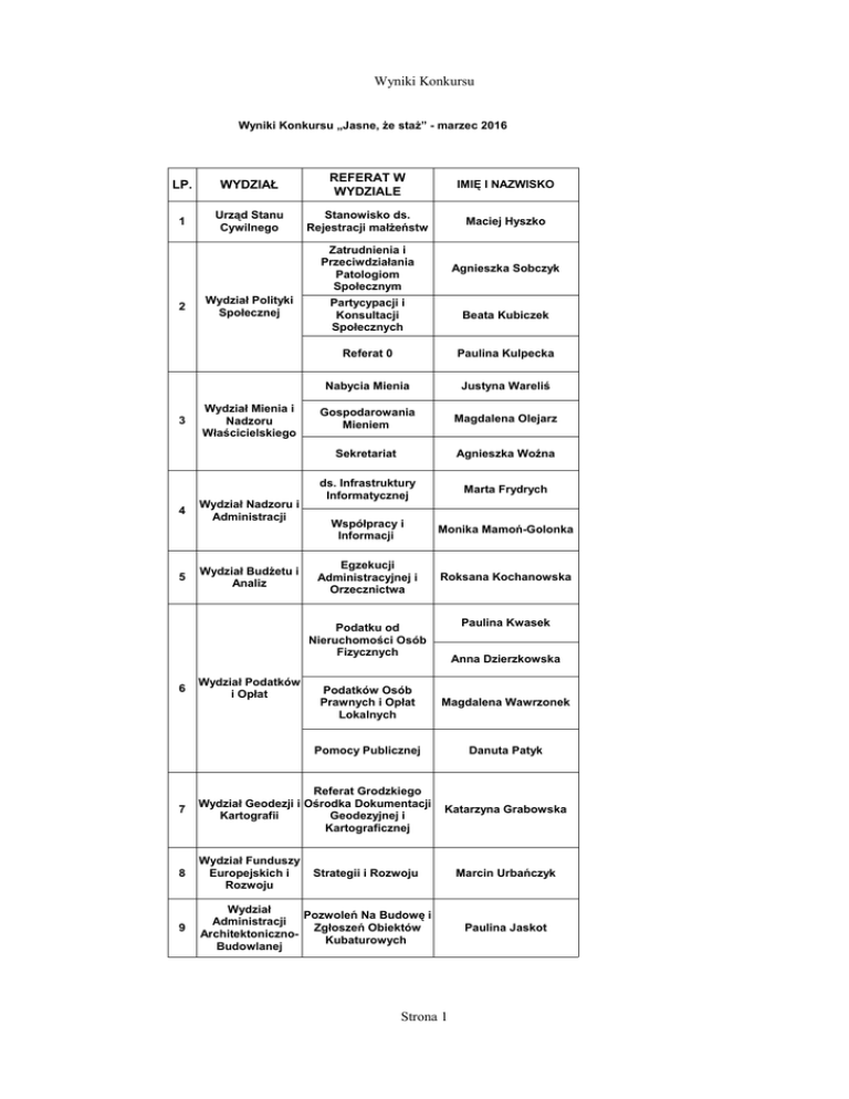 Wyniki Konkursu Wyniki Konkursu „Jasne, że staż” - marzec 2016 LP. WYDZIAŁ REFERAT W WYDZIALE IMIĘ I NAZWISKO 1 Urząd Stanu Cywilnego Stanowisko ds. Rejestracji małżeństw Maciej Hyszko 2 3 4 5 Wydział Polityki Społecznej Wydział Mienia i Nadzoru Właścicielskiego Wydział Nadzoru i Administracji Wydział Budżetu i Analiz Zatrudnienia i Przeciwdziałania Patologiom Społecznym Partycypacji i Konsultacji Społecznych Agnieszka Sobczyk Beata Kubiczek Referat 0 Paulina Kulpecka Nabycia Mienia Justyna Wareliś Gospodarowania Mieniem Magdalena Olejarz Sekretariat Agnieszka Woźna ds. Infrastruktury Informatycznej Marta Frydrych Współpracy i Informacji Monika Mamoń-Golonka Egzekucji Administracyjnej i Orzecznictwa Roksana Kochanowska Paulina Kwasek Podatku od Nieruchomości Osób Fizycznych 6 Wydział Podatków i Opłat Anna Dzierzkowska Podatków Osób Prawnych i Opłat Lokalnych Magdalena Wawrzonek Pomocy Publicznej Danuta Patyk 7 Referat Grodzkiego Wydział Geodezji i Ośrodka Dokumentacji Kartografii Geodezyjnej i Kartograficznej 8 Wydział Funduszy Europejskich i Rozwoju 9 Wydział Pozwoleń Na Budowę i Administracji Zgłoszeń Obiektów ArchitektonicznoKubaturowych Budowlanej Katarzyna Grabowska Strategii i Rozwoju Strona 1 Marcin Urbańczyk Paulina Jaskot
