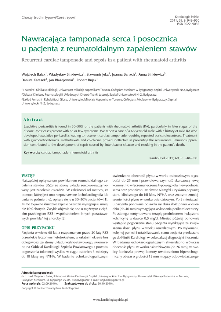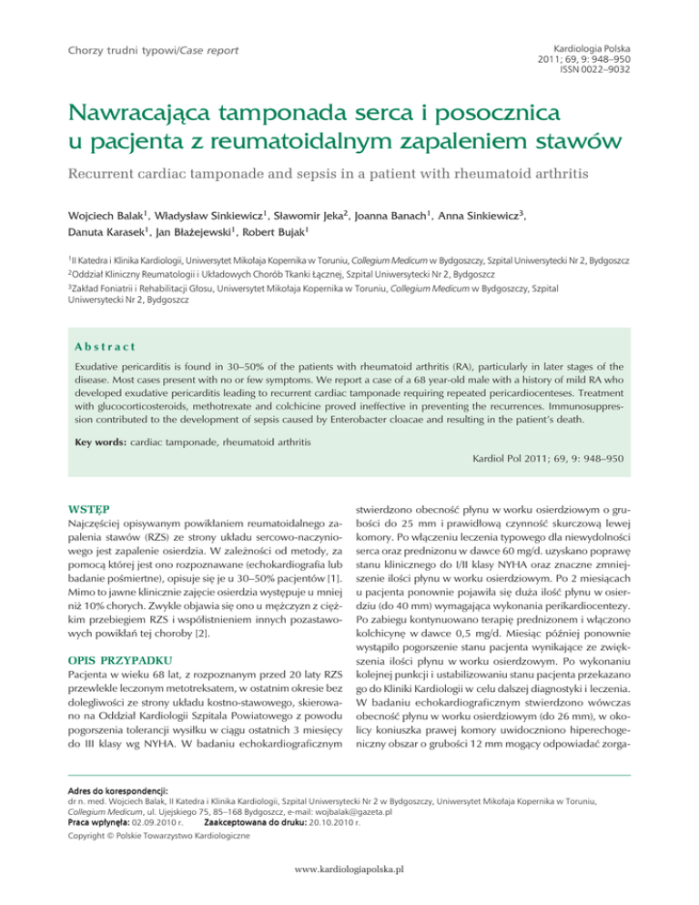 Kardiologia Polska 2011; 69, 9: 948–950 ISSN 0022–9032 Chorzy trudni typowi/Case report Nawracająca tamponada serca i posocznica u pacjenta z reumatoidalnym zapaleniem stawów Recurrent cardiac tamponade and sepsis in a patient with rheumatoid arthritis Wojciech Balak1, Władysław Sinkiewicz1, Sławomir Jeka2, Joanna Banach1, Anna Sinkiewicz3, Danuta Karasek1, Jan Błażejewski1, Robert Bujak1 1II Katedra i Klinika Kardiologii, Uniwersytet Mikołaja Kopernika w Toruniu, Collegium Medicum w Bydgoszczy, Szpital Uniwersytecki Nr 2, Bydgoszcz 2Oddział Kliniczny Reumatologii i Układowych Chorób Tkanki Łącznej, Szpital Uniwersytecki Nr 2, Bydgoszcz 3Zakład Foniatrii i Rehabilitacji Głosu, Uniwersytet Mikołaja Kopernika w Toruniu, Collegium Medicum w Bydgoszczy, Szpital Uniwersytecki Nr 2, Bydgoszcz Abstract Exudative pericarditis is found in 30–50% of the patients with rheumatoid arthritis (RA), particularly in later stages of the disease. Most cases present with no or few symptoms. We report a case of a 68 year-old male with a history of mild RA who developed exudative pericarditis leading to recurrent cardiac tamponade requiring repeated pericardiocenteses. Treatment with glucocorticosteroids, methotrexate and colchicine proved ineffective in preventing the recurrences. Immunosuppression contributed to the development of sepsis caused by Enterobacter cloacae and resulting in the patient’s death. Key words: cardiac tamponade, rheumatoid arthritis Kardiol Pol 2011; 69, 9: 948–950 WSTĘP Najczęściej opisywanym powikłaniem reumatoidalnego zapalenia stawów (RZS) ze strony układu sercowo-naczyniowego jest zapalenie osierdzia. W zależności od metody, za pomocą której jest ono rozpoznawane (echokardiografia lub badanie pośmiertne), opisuje się je u 30–50% pacjentów [1]. Mimo to jawne klinicznie zajęcie osierdzia występuje u mniej niż 10% chorych. Zwykle objawia się ono u mężczyzn z ciężkim przebiegiem RZS i współistnieniem innych pozastawowych powikłań tej choroby [2]. OPIS PRZYPADKU Pacjenta w wieku 68 lat, z rozpoznanym przed 20 laty RZS przewlekle leczonym metotreksatem, w ostatnim okresie bez dolegliwości ze strony układu kostno-stawowego, skierowano na Oddział Kardiologii Szpitala Powiatowego z powodu pogorszenia tolerancji wysiłku w ciągu ostatnich 3 miesięcy do III klasy wg NYHA. W badaniu echokardiograficznym stwierdzono obecność płynu w worku osierdziowym o grubości do 25 mm i prawidłową czynność skurczową lewej komory. Po włączeniu leczenia typowego dla niewydolności serca oraz prednizonu w dawce 60 mg/d. uzyskano poprawę stanu klinicznego do I/II klasy NYHA oraz znaczne zmniejszenie ilości płynu w worku osierdziowym. Po 2 miesiącach u pacjenta ponownie pojawiła się duża ilość płynu w osierdziu (do 40 mm) wymagająca wykonania perikardiocentezy. Po zabiegu kontynuowano terapię prednizonem i włączono kolchicynę w dawce 0,5 mg/d. Miesiąc później ponownie wystąpiło pogorszenie stanu pacjenta wynikające ze zwiększenia ilości płynu w worku osierdzowym. Po wykonaniu kolejnej punkcji i ustabilizowaniu stanu pacjenta przekazano go do Kliniki Kardiologii w celu dalszej diagnostyki i leczenia. W badaniu echokardiograficznym stwierdzono wówczas obecność płynu w worku osierdziowym (do 26 mm), w okolicy koniuszka prawej komory uwidoczniono hiperechogeniczny obszar o grubości 12 mm mogący odpowiadać zorga- Adres do korespondencji: dr n. med. Wojciech Balak, II Katedra i Klinika Kardiologii, Szpital Uniwersytecki Nr 2 w Bydgoszczy, Uniwersytet Mikołaja Kopernika w Toruniu, Collegium Medicum, ul. Ujejskiego 75, 85–168 Bydgoszcz, e-mail: [email protected] Praca wpłynęła: 02.09.2010 r. Zaakceptowana do druku: 20.10.2010 r. Copyright © Polskie Towarzystwo Kardiologiczne www.kardiologiapolska.pl Nawracająca tamponada serca i posocznica u pacjenta z reumatoidalnym zapaleniem stawów Rycina 1. Badanie echokardiograficzne z widocznym płynem w worku osierdziowym i hiperechogenicznym obszarem w okolicy koniuszka prawej komory (strzałka) Rycina 2. Tomografia komputerowa klatki piersiowej z obecnością dużej ilości płynu w worku osierdziowym nizowanemu włóknikowi (ryc. 1). W tomografii komputerowej klatki piersiowej potwierdzono obecność dużej ilości płynu w worku osierdziowym, nie stwierdzono zarazem innych istotnych patologii (ryc. 2). Wykonano RTG rąk i stóp, nie stwierdzając zmian typowych dla RZS. W morfologii krwi zanotowano niewielką leukocytozę rzędu 11–15 G/l. Stężenie bialka C-reaktywnego (CRP) początkowo wynosiło 16,7 mg/l, w trakcie hospitalizacji wzrosło do 122,3 mg/l, a następnie obniżyło się do 4,1 mg/l. Stężenia dsDNA, Ro, La, Jo-1 mieściły sie w zakresie normy. Przeciwciała przeciwko cyklicznemu cytrulinowanemu peptydowi (aCCP) były znamienie podwyższone i wynosiły 124 j./ml (wynik dodatni > 10 j./ml). Test 949 Waaler-Rose przeprowadzony metodą zmodyfikowanego testu hemaglutynacji był także dodatni i wynosił 58 jm./ml. Wykonano punkcję worka osierdziowego, uzyskując 500 ml krwistego płynu. W badanym płynie nie stwierdzono obecności komórek nowotworowych i bakterii. W celu wykluczenia gruźlicy wykonano badanie płynu metodą bekterioskopii AFB, test Probe Tec ET na obecność DNA prątków oraz hodowlę 6-tygodniową, które nie wykazały obecności prątków kwasoopornych. Po kilku dobach u pacjenta pojawiły się zmiany o charakterze rumieniowym na skórze prawego podudzia o cechach zapalenia tkanki podskórnej. Po włączeniu amoksycyliny z kwasem klawulonowym uzyskano regresję tych zmian. Mimo że kontynuowano leczenie metotreksatem i prednizonem zaobserwowano ponowne narastanie ilości płynu w worku osierdziowym, wymagające wykonania kolejnej perikardiocentezy. Ze względu na przebieg choroby podjęto decyzję o zastosowaniu 3 pulsów metylprednizolonu w dawce 500 mg i.v., uzyskując stopniową stabilizację stanu chorego. Po 2-miesięcznej hos