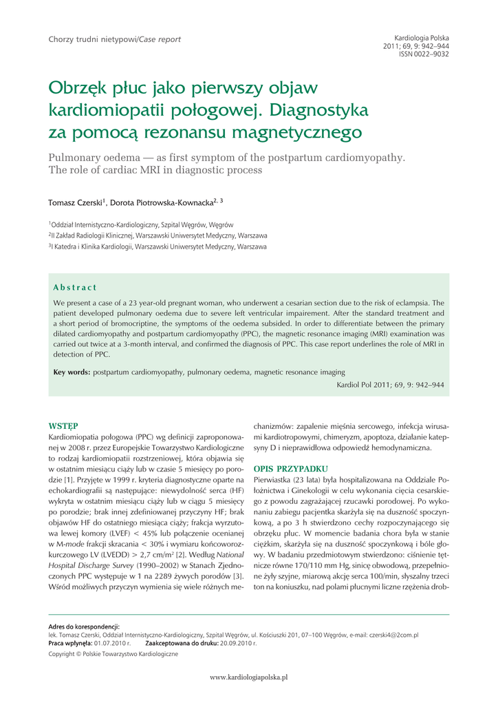 Kardiologia Polska 2011; 69, 9: 942–944 ISSN 0022–9032 Chorzy trudni nietypowi/Case report Obrzęk płuc jako pierwszy objaw kardiomiopatii połogowej. Diagnostyka za pomocą rezonansu magnetycznego Pulmonary oedema — as first symptom of the postpartum cardiomyopathy. The role of cardiac MRI in diagnostic process Tomasz Czerski1, Dorota Piotrowska−Kownacka2, 3 1Oddział Internistyczno-Kardiologiczny, Szpital Węgrów, Węgrów 2II Zakład Radiologii Klinicznej, Warszawski Uniwersytet Medyczny, Warszawa 3I Katedra i Klinika Kardiologii, Warszawski Uniwersytet Medyczny, Warszawa Abstract We present a case of a 23 year-old pregnant woman, who underwent a cesarian section due to the risk of eclampsia. The patient developed pulmonary oedema due to severe left ventricular impairement. After the standard treatment and a short period of bromocriptine, the symptoms of the oedema subsided. In order to differentiate between the primary dilated cardiomyopathy and postpartum cardiomyopathy (PPC), the magnetic resonance imaging (MRI) examination was carried out twice at a 3-month interval, and confirmed the diagnosis of PPC. This case report underlines the role of MRI in detection of PPC. Key words: postpartum cardiomyopathy, pulmonary oedema, magnetic resonance imaging Kardiol Pol 2011; 69, 9: 942–944 WSTĘP Kardiomiopatia połogowa (PPC) wg definicji zaproponowanej w 2008 r. przez Europejskie Towarzystwo Kardiologiczne to rodzaj kardiomiopatii rozstrzeniowej, która objawia się w ostatnim miesiącu ciąży lub w czasie 5 miesięcy po porodzie [1]. Przyjęte w 1999 r. kryteria diagnostyczne oparte na echokardiografii są następujące: niewydolność serca (HF) wykryta w ostatnim miesiącu ciąży lub w ciągu 5 miesięcy po porodzie; brak innej zdefiniowanej przyczyny HF; brak objawów HF do ostatniego miesiąca ciąży; frakcja wyrzutowa lewej komory (LVEF) < 45% lub połączenie ocenianej w M-mode frakcji skracania < 30% i wymiaru końcoworozkurczowego LV (LVEDD) > 2,7 cm/m2 [2]. Według National Hospital Discharge Survey (1990–2002) w Stanach Zjednoczonych PPC występuje w 1 na 2289 żywych porodów [3]. Wśród możliwych przyczyn wymienia się wiele różnych me- chanizmów: zapalenie mięśnia sercowego, infekcja wirusami kardiotropowymi, chimeryzm, apoptoza, działanie katepsyny D i nieprawidłowa odpowiedź hemodynamiczna. OPIS PRZYPADKU Pierwiastka (23 lata) była hospitalizowana na Oddziale Położnictwa i Ginekologii w celu wykonania cięcia cesarskiego z powodu zagrażającej rzucawki porodowej. Po wykonaniu zabiegu pacjentka skarżyła się na duszność spoczynkową, a po 3 h stwierdzono cechy rozpoczynającego się obrzęku płuc. W momencie badania chora była w stanie ciężkim, skarżyła się na duszność spoczynkową i bóle głowy. W badaniu przedmiotowym stwierdzono: ciśnienie tętnicze równe 170/110 mm Hg, sinicę obwodową, przepełnione żyły szyjne, miarową akcję serca 100/min, słyszalny trzeci ton na koniuszku, nad polami płucnymi liczne rzężenia drob- Adres do korespondencji: lek. Tomasz Czerski, Oddział Internistyczno-Kardiologiczny, Szpital Węgrów, ul. Kościuszki 201, 07–100 Węgrów, e-mail: [email protected] Praca wpłynęła: 01.07.2010 r. Zaakceptowana do druku: 20.09.2010 r. Copyright © Polskie Towarzystwo Kardiologiczne www.kardiologiapolska.pl Obrzęk płuc jako pierwszy objaw kardiomiopatii połogowej. Diagnostyka za pomocą rezonansu magnetycznego A 943 B Rycina 1. Kolejne przekroje w osi krótkiej od koniuszka do podstawy uzyskane sekwencją kinematograficzną SSFP w fazie późnorozA ), w fazie późnoskurczowej (B B ). Obraz w badaniu wyjściowym — istotnie obniżona globalna kurczliwość z frakcją kurczowej (A wyrzutową 44%, istotnie powiększona lewa komora (EDV 343 ml) nobańkowe. W EKG nie zaobserwowano istotnych nieprawidłowości, a w przyłóżkowym badaniu ECHO uwidoczniono znacznie powiększoną jamę LV, z LVEF ok. 45%, niedomykalność mitralną (IM) oraz aortalną (IA). W leczeniu zastosowano tlenoterapię, stały wlew furosemidu oraz nitrogliceryny, a także morfinę i enoksaparynę. W badaniach laboratoryjnych stwierdzono prawidłowy obraz morfologii i układu krzepnięcia, podwyższone stężenia troponiny I (0,13 mcg/ml) i D-dimeru (5782,6 ng/ml). Po kilku godzinach terapii uzyskano stopniowe ustąpienie objawów. W kolejnej dobie pobytu zastosowano bromokryptynę, perindopril, furosemid i eplerenon, a w następnych torasemid zamiast furosemidu i karwedilolu. W 2. dobie wykonano kolejne badanie ECHO, które potwierdziło istotne powiększenie jamy LV (7,2 cm) z globalnie upośledzoną funkcją skurczową (LVEF 45%) oraz cechy ciężkiej IM, umiarkowanej IA i umiarkowanej niedomykalności trójdzielnej. W 8. dobie wykonano rezonans magnetyczny (MRI) serca, stwierdzając następujące wymiary: LV 70 mm, RV 61 mm, LA 54 ¥ 70 mm, RA 57 mm oraz następujące parametry funkcji skurczowej: EF 44%, EDV 343 ml, ESV 192 ml, SV 150 ml, CO 8620 ml, LVM 205 g (ryc. 1A, B). Na obrazach uzyskanych techniką czarnej krwi T2-zależnych stwierdzono niecharakterystyczny obraz podwyższonego sygnału (obrzęk) w ścianie przedniej i bocznej (ryc. 2A). Podczas podawania środka kontrastowego zawierającego gadolin (Gd-DTPA 0,1 mmol/kg mc.) uwidoczniono prawidłową perfuzję miokardium, a po 15 minutach nie stwierdzono obszarów późnego wzmocnienia kontrastowego. Całość obrazu sugerowała odwracalne uszkodzenie mięśnia sercowego. W 10. dobie po porodzie z powodu działań niepożądanych odstawiono bromokryptynę. W kolejnych miesiącach kontaktowano się z pacjentką telefonicznie — nie zgłaszała dolegliwości. Po 3 miesiącach podczas kontrolnej hospitalizacji wykonano MRI, w którym stwierdzono ustąpienie obrzęku A B Rycina 2. Obraz uzyskany techniką czarnej krwi (black blood), T2-zależny z saturacją sygnału z tkanki tłuszczowej, przekrój w osi krótkiej na granicy segmentów środkowych i podstawnych lewe