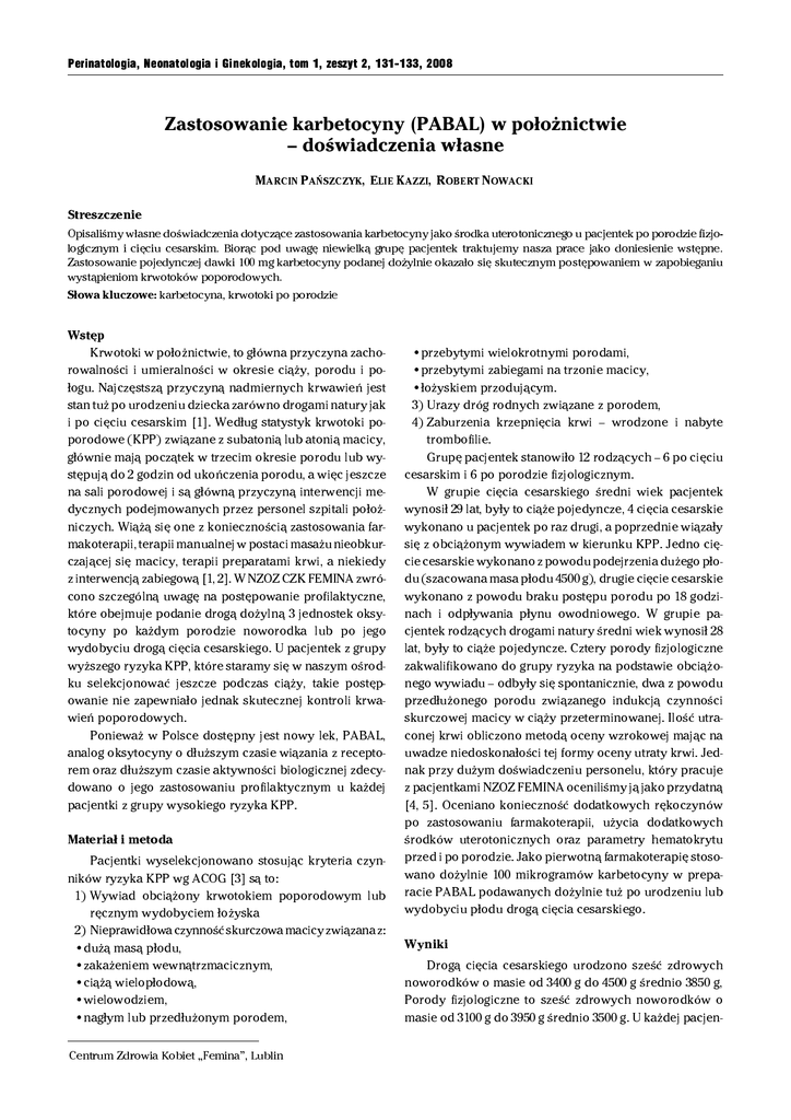 Perinatologia, Neonatologia i Ginekologia, tom 1, zeszyt 2, 131-133, 2008 Zastosowanie karbetocyny (PABAL) w położnictwie – doświadczenia własne MARCIN PAŃSZCZYK, ELIE KAZZI, ROBERT NOWACKI Streszczenie Opisaliśmy własne doświadczenia dotyczące zastosowania karbetocyny jako środka uterotonicznego u pacjentek po porodzie fizjologicznym i cięciu cesarskim. Biorąc pod uwagę niewielką grupę pacjentek traktujemy nasza prace jako doniesienie wstępne. Zastosowanie pojedynczej dawki 100 mg karbetocyny podanej dożylnie okazało się skutecznym postępowaniem w zapobieganiu wystąpieniom krwotoków poporodowych. karbetocyna, krwotoki po porodzie Słowa kluczowe: Wstęp Krwotoki w położnictwie, to główna przyczyna zachorowalności i umieralności w okresie ciąży, porodu i połogu. Najczęstszą przyczyną nadmiernych krwawień jest stan tuż po urodzeniu dziecka zarówno drogami natury jak i po cięciu cesarskim [1]. Według statystyk krwotoki poporodowe (KPP) związane z subatonią lub atonią macicy, głównie mają początek w trzecim okresie porodu lub występują do 2 godzin od ukończenia porodu, a więc jeszcze na sali porodowej i są główną przyczyną interwencji medycznych podejmowanych przez personel szpitali położniczych. Wiążą się one z koniecznością zastosowania farmakoterapii, terapii manualnej w postaci masażu nieobkurczającej się macicy, terapii preparatami krwi, a niekiedy z interwencją zabiegową [1, 2]. W NZOZ CZK FEMINA zwrócono szczególną uwagę na postępowanie profilaktyczne, które obejmuje podanie drogą dożylną 3 jednostek oksytocyny po każdym porodzie noworodka lub po jego wydobyciu drogą cięcia cesarskiego. U pacjentek z grupy wyższego ryzyka KPP, które staramy się w naszym ośrodku selekcjonować jeszcze podczas ciąży, takie postępowanie nie zapewniało jednak skutecznej kontroli krwawień poporodowych. Ponieważ w Polsce dostępny jest nowy lek, PABAL, analog oksytocyny o dłuższym czasie wiązania z receptorem oraz dłuższym czasie aktywności biologicznej zdecydowano o jego zastosowaniu profilaktycznym u każdej pacjentki z grupy wysokiego ryzyka KPP. Materiał i metoda Pacjentki wyselekcjonowano stosując kryteria czynników ryzyka KPP wg ACOG [3] są to: 1) Wywiad obciążony krwotokiem poporodowym lub ręcznym wydobyciem łożyska 2) Nieprawidłowa czynność skurczowa macicy związana z: •dużą masą płodu, •zakażeniem wewnątrzmacicznym, •ciążą wielopłodową, •wielowodziem, •nagłym lub przedłużonym porodem, Centrum Zdrowia Kobiet „Femina”, Lublin •przebytymi wielokrotnymi porodami, •przebytymi zabiegami na trzonie macicy, •łożyskiem przodującym. 3) Urazy dróg rodnych związane z porodem, 4) Zaburzenia krzepnięcia krwi – wrodzone i nabyte trombofilie. Grupę pacjentek stanowiło 12 rodzących – 6 po cięciu cesarskim i 6 po porodzie fizjologicznym. W grupie cięcia cesarskiego średni wiek pacjentek wynosił 29 lat, były to ciąże pojedyncze, 4 cięcia cesarskie wykonano u pacjentek po raz drugi, a poprzednie wiązały się z obciążonym wywiadem w kierunku KPP. Jedno cięcie cesarskie wykonano z powodu podejrzenia dużego płodu (szacowana masa płodu 4500 g), drugie cięcie cesarskie wykonano z powodu braku postępu porodu po 18 godzinach i odpływania płynu owodniowego. W grupie pacjentek rodzących drogami natury średni wiek wynosił 28 lat, były to ciąże pojedyncze. Cztery porody fizjologiczne zakwalifikowano do grupy ryzyka na podstawie obciążonego wywiadu – odbyły się spontanicznie, dwa z powodu przedłużonego porodu związanego indukcją czynności skurczowej macicy w ciąży przeterminowanej. Ilość utraconej krwi obliczono metodą oceny wzrokowej mając na uwadze niedoskonałości tej formy oceny utraty krwi. Jednak przy dużym doświadczeniu personelu, który pracuje z pacjentkami NZOZ FEMINA oceniliśmy ją jako przydatną [4, 5]. Oceniano konieczność dodatkowych rękoczynów po zastosowaniu farmakoterapii, użycia dodatkowych środków uterotonicznych oraz parametry hematokrytu przed i po porodzie. Jako pierwotną farmakoterapię stosowano dożylnie 100 mikrogramów karbetocyny w preparacie PABAL podawanych dożylnie tuż po urodzeniu lub wydobyciu płodu drogą cięcia cesarskiego. Wyniki Drogą cięcia cesarskiego urodzono sześć zdrowych noworodków o masie od 3400 g do 4500 g średnio 3850 g, Porody fizjologiczne to sześć zdrowych noworodków o masie od 3100 g do 3950 g średnio 3500 g. U każdej pacjen- 132 M. Pańszczyk, E. Kazzi, R. Nowacki tki po zastosowaniu karbetocyny zaobserwowano niemal natychmiastowe obkurczenie się macicy. Efekt podania leku utrzymywał się przez 4-6 godzin – u żadnej pacjentki nie spełniły się kryteria krwotoku poporodowego [1, 3], czyli utraty ponad 500 ml krwi po porodzie siłami natury ani ponad 1000 ml po cięciu cesarskim w ciągu 24 godzin. Dodatkowe rękoczyny zastosowano w dwóch przypadkach po porodzie siłami natury u pacjentek z obciążonym wywiadem, jednak do dwóch godzin po porodzie żadna z nich nie wymagała więcej masowania dna macicy ani obłożenia brzucha lodem, co stosujemy niejednokrotnie. Nie stosowano dodatkowych środków uterotonicznych. Nie wykonywano transfuzji krwi ani środków krwiopochodnych, hematokryt w obu grupach wobec wartości wyjściowy obniżył się średnio o 8 % – pacjentki nie wymagały podawanie preparatów żelaza. Grupa 12 pacjentek z grupy ryzyka opuściła ośrodek w czwartej dobie pobytu, co spełnia warunki standardowe. Skutki uboczne zastosowania karbetocyny, jakie zaobserwowaliśmy to wzrost tętna u jednej pacjentki po porodzie fizjologicznym do 100 uderzeń na minutę. Jako efekt przejściowy po iniekcji dożylnej leku oraz przemijający świąd skóry u pacjentki po cięciu cesarskim przy braku zmian skórnych oraz znamion biochemicznych cholestazy. Warto wspomnieć jeszcze o jednej pacjentce, u której zdecydowaliśmy o zastosowaniu kar