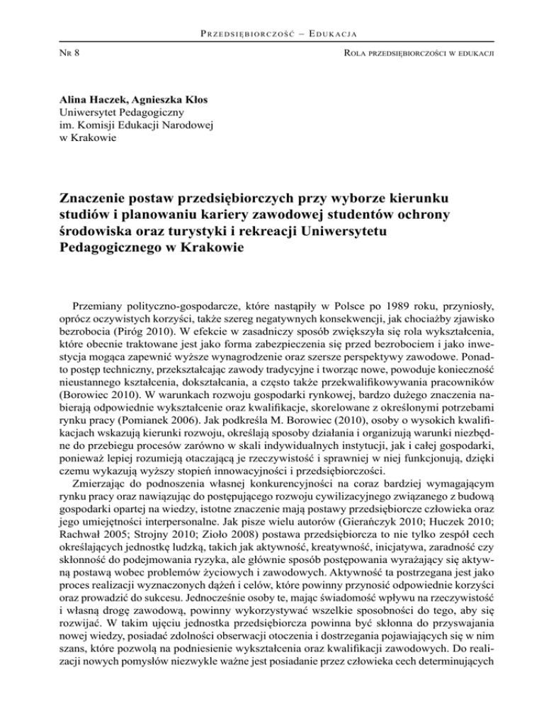 Przedsiębiorczość – Edukacja Nr 8 Rola przedsiębiorczości w edukacji Alina Haczek, Agnieszka Kłos Uniwersytet Pedagogiczny im. Komisji Edukacji Narodowej w Krakowie Znaczenie postaw przedsiębiorczych przy wyborze kierunku studiów i planowaniu kariery zawodowej studentów ochrony środowiska oraz turystyki i rekreacji Uniwersytetu Pedagogicznego w Krakowie Przemiany polityczno-gospodarcze, które nastąpiły w Polsce po 1989 roku, przyniosły, oprócz oczywistych korzyści, także szereg negatywnych konsekwencji, jak chociażby zjawisko bezrobocia (Piróg 2010). W efekcie w zasadniczy sposób zwiększyła się rola wykształcenia, które obecnie traktowane jest jako forma zabezpieczenia się przed bezrobociem i jako inwestycja mogąca zapewnić wyższe wynagrodzenie oraz szersze perspektywy zawodowe. Ponadto postęp techniczny, przekształcając zawody tradycyjne i tworząc nowe, powoduje konieczność nieustannego kształcenia, dokształcania, a często także przekwalifikowywania pracowników (Borowiec 2010). W warunkach rozwoju gospodarki rynkowej, bardzo dużego znaczenia nabierają odpowiednie wykształcenie oraz kwalifikacje, skorelowane z określonymi potrzebami rynku pracy (Pomianek 2006). Jak podkreśla M. Borowiec (2010), osoby o wysokich kwalifikacjach wskazują kierunki rozwoju, określają sposoby działania i organizują warunki niezbędne do przebiegu procesów zarówno w skali indywidualnych instytucji, jak i całej gospodarki, ponieważ lepiej rozumieją otaczającą je rzeczywistość i sprawniej w niej funkcjonują, dzięki czemu wykazują wyższy stopień innowacyjności i przedsiębiorczości. Zmierzając do podnoszenia własnej konkurencyjności na coraz bardziej wymagającym rynku pracy oraz nawiązując do postępującego rozwoju cywilizacyjnego związanego z budową gospodarki opartej na wiedzy, istotne znaczenie mają postawy przedsiębiorcze człowieka oraz jego umiejętności interpersonalne. Jak pisze wielu autorów (Gierańczyk 2010; Huczek 2010; Rachwał 2005; Strojny 2010; Zioło 2008) postawa przedsiębiorcza to nie tylko zespół cech określających jednostkę ludzką, takich jak aktywność, kreatywność, inicjatywa, zaradność czy skłonność do podejmowania ryzyka, ale głównie sposób postępowania wyrażający się aktywną postawą wobec problemów życiowych i zawodowych. Aktywność ta postrzegana jest jako proces realizacji wyznaczonych dążeń i celów, które powinny przynosić odpowiednie korzyści oraz prowadzić do sukcesu. Jednocześnie osoby te, mając świadomość wpływu na rzeczywistość i własną drogę zawodową, powinny wykorzystywać wszelkie sposobności do tego, aby się rozwijać. W takim ujęciu jednostka przedsiębiorcza powinna być skłonna do przyswajania nowej wiedzy, posiadać zdolności obserwacji otoczenia i dostrzegania pojawiających się w nim szans, które pozwolą na podniesienie wykształcenia oraz kwalifikacji zawodowych. Do realizacji nowych pomysłów niezwykle ważne jest posiadanie przez człowieka cech determinujących Znaczenie postaw przedsiębiorczych przy wyborze kierunku studiów i planowaniu kariery... 97 pewien rodzaj postępowania. Do jednych z najważniejszych z punktu widzenia zachowań przedsiębiorczych człowieka należy motywacja (Korpysa 2008). Dlatego też, traktując chęć zdobycia wyższego wykształcenia jako przejaw postawy przedsiębiorczej, warto zastanowić się nad motywami podejmowania studiów wyższych. Pytanie bowiem o motywy kształcenia jest poniekąd poszukiwaniem odpowiedzi na pytanie o wartość wykształcenia we współczesnych realiach (Uwarunkowania rozwoju szkolnictwa wyższego). Wcześniej należy jednak zdefiniować pojęcie motywu. Za W. Jareckim można przyjąć, że samo pojęcie motyw w szerokim znaczeniu może być definiowane jako chęć osiągnięcia określonego celu. Można zatem wyróżnić wiele różnorodnych czynników i determinant, które wpływają na decyzję o podjęciu studiów. Należy jednak pamiętać, iż wybór studiów jest ściśle związany z wyborem konkretnego kierunku. Z tego względu powinien być przemyślany oraz zgodny z zainteresowaniami danej osoby, aby uniknąć w przyszłości niezadowolenia z podjętych studiów oraz mniejszego zaangażowania w zdobywanie wiedzy, skutkujących osiągnięciem niższych kwalifikacji zawodowych (Jarecki 2008). Z kolei z badań przeprowadzonych przez B. Liberską (1974) wynika, iż jednymi z najważniejszych determinant wyboru studiów są chęć pogłębienia wiedzy oraz przyszłe korzyści majątkowe. Również badania prowadzone przez CBOS od 1993 roku wykazują, że najważniejszym powodem kontynuowania nauki na studiach wyższych są szanse na wyższe zarobki (Uwarunkowania rozwoju szkolnictwa wyższego). Można więc przyjąć, iż głównymi motywami wyboru kierunku studiów są rozwój własnych zainteresowań oraz zwiększenie w przyszłości swoich szans na rynku pracy. Cele i metody badań W nawiązaniu do powyższych przesłanek w niniejszym artykule podjęto problematykę motywów wyboru jako kierunku studiów ochrony środowiska oraz turystyki i rekreacji na Uniwersytecie Pedagogicznym w Krakowie. Podjęto decyzję o przebadaniu populacji studentów jednego rocznika wyżej wymienionych kierunków studiów, który był współfinansowany ze środków Unii Europejskiej, z Europejskiego Funduszu Społecznego w ramach Programu Operacyjnego Kapitał Ludzki. W związku z tym, pomimo iż są to studia niestacjonarne, studenci nie ponoszą kosztów czesnego. Można zatem przypuszczać, iż fakt ten był także ważny przy wyborze danego kierunku studiów. W kolejnych latach także uruchamiano studia na kierunkach ochrona środowiska oraz turystyka i rekreacja, jednak już bez pomocy finansowej ze środków unijnych. Dlatego też nie przeprowadzono badań na innych rocznikach studiów, gdyż nie wszystkie realizowane są na tych samych zasadach, co mogłoby mieć zasadniczy wpł