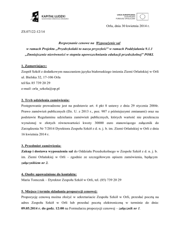 Orla, dnia 30 kwietnia 2014 r. ZS.07122-12/14 Rozpoznanie cenowe na Wyposażenie sal w ramach Projektu „Przedszkolaki to nasza przyszłość” w ramach Poddziałania 9.1.1 „Zmniejszenie nierówności w stopniu upowszechniania edukacji przedszkolnej” POKL 1. Zamawiający: Zespół Szkół z dodatkowym nauczaniem języka białoruskiego imienia Ziemi Orlańskiej w Orli ul. Bielska 32, 17-106 Orla tel/fax 85 739 20 29 e-mail: [email protected] 2. Tryb udzielenia zamówienia: Postępowanie prowadzone jest na podstawie art. 4 pkt 8 ustawy z dnia 29 stycznia 2004r. Prawo zamówień publicznych (Dz. U. z 2013 r., poz. 907 z późniejszymi zmianami) oraz na podstawie Regulaminu udzielania zamówień publicznych, których wartość nie przekracza wyrażonej w złotych równowartości kwoty 30000 euro stanowiącego załącznik do Zarządzenia Nr 7/2014 Dyrektora Zespołu Szkół z d. n. j. b. im. Ziemi Orlańskiej w Orli z dnia 16 kwietnia 2014 r. 3. Przedmiot zamówienia: Zakup i dostawa wyposażenia sal do Oddziału Przedszkolnego w Zespole Szkół z d. n. j. b. im. Ziemi Orlańskiej w Orli - zgodnie ze szczegółowym opisem zamówienia, będącym załącznikiem nr 2. 4. Osoby upoważnione do kontaktu: Maria Tomczuk – Dyrektor Zespołu Szkół w Orli, tel. (85) 739 20 29 5. Miejsce i termin składania propozycji cenowej: Propozycję cenową można złożyć w sekretariacie Zespołu Szkół w Orli, przesłać pocztą na adres Zespołu Szkół w Orli lub przesłać pocztą elektroniczną w terminie do dnia: 09.05.2014 r. do godz. 12:00 na Formularzu propozycji cenowej – załącznik nr 1. 6. Termin wykonania zamówienia: Przedmiot zamówienia Wykonawca ma dostarczyć do 11.07.2014 r. 7. Opis sposobu obliczenia ceny propozycji cenowej: 1) Cena podana w propozycji cenowej winna obejmować wszystkie koszty i składniki związane z wykonaniem zamówienia oraz warunkami stawianymi przez Zamawiającego, w szczególności: należny podatek od towarów i usług. 2) Cena opisana w ust. 1 jest ceną ostateczną, jaką zapłaci Zamawiający. 8. Kryteria oceny propozycji cenowej: 1) Kryterium wyboru jest cena (cena – 100%). 2) Najkorzystniejszą propozycją cenową będzie propozycja z najniższą ceną, spełniająca wymagania Zamawiającego. 9. Unieważnienie postępowania: Zamawiający zastrzega sobie prawo do unieważnienia niniejszego postępowania. Załączniki: 1. Załącznik Nr 1 – Formularz propozycji cenowej. 2. Załącznik Nr 2 – Szczegółowy opis zamówienia. Załącznik Nr 1 FORMULARZ PROPOZYCJI CENOWEJ NA WYPOSAŻENIE SAL Dane dotyczące Wykonawcy Nazwa: ............................................................................................................................. Siedziba: ............................................................................................................................... Numer telefonu/faxu: …………….................................. E-mail: ………………………………………………… Numer REGON: ..................................................... Numer NIP: ………………………………… Zobowiązania Wykonawcy W odpowiedzi na rozpoznanie cenowe oferuję wykonanie przedmiotu zamówienia za cenę: Cena netto …………..……….zł. (słownie: ……………………………………………………………………………..………. ) Podatek VAT ( …….. %) …………….…….zł Cena brutto ………………….zł. (słownie: …………………………………………………………….………………………) Oświadczam, że: Wykonam zamówienie w terminie do dnia:……………………………… Zapoznałem się z warunkami przedmiotu zamówienia i nie wnoszę do nich żadnych zastrzeżeń. Załączniki: - Szczegółowy opis zamówienia. ___________________________ Czytelny podpis ( pieczątka) Załącznik Nr 2 Wyposażenie sal ID Nazwa 27 Dywan 27 B Dywan 28 Tablica korkowa 29 A Zestaw dekoracji 29 B Zestaw dekoracji 30 Przesuwanka drzewo duże 31 Lustro do dekoracji Dekoracja do lustra 32 Szczegółowy opis zamówienia Ilość Dywan Agnella Funky Ugo Limonka. Skład runa: 100% heat-set frise, wysokość runa 8 mm, gęstość runa 208 000 punktów / m²,. Wykonanie runa w technice heat set frise zapobiega wbijaniu się różnych drobin i okruchów oraz zapewnia wysoką odporność na zaplamienie. Produkcja z włóczek syntetycznych zapewnia antyalergiczność. Duży wybór rozmiarów gwarantuje dopasowanie do każdego, nawet dużego pomieszczenia. Dywan Agnella Funky Dom Limonka. Skład runa: 100% heat-set frise, wysokość runa 8 mm, gęstość runa 208 000 punktów / m²,. Wykonanie runa w technice heat set frise zapobiega wbijaniu się różnych drobin i okruchów oraz zapewnia wysoką odporność na zaplamienie. Produkcja z włóczek syntetycznych zapewnia antyalergiczność. Duży wybór rozmiarów gwarantuje dopasowanie do każdego, nawet dużego pomieszczenia. Korkowa tablica z drewnianą ramą, do prezentacji prac lub wywieszania ogłoszeń szkolnych. - wym. 90 x 150 cm Zestaw z motylkiem. Duże dekoracje do samodzielnego zawieszenia na ścianie. Wykonane z twardej tektury, z otworami do mocowania. - motylek o wym. 60 x 48 cm - pszczółka o wym. 54,5 x 48,5 cm - ptaszek o wym. 51,5 x 48,5 cm Duże dekoracje do samodzielnego zawieszenia na ścianie. Wykonane z twardej tektury, z otworami do mocowania. - 2 chmurki o wym. 45 x 68 cm - słoneczko o wym. 53,5 x 49 cm Przesuwanka w kształcie drzewa. Wykonana z lakierowanej sklejki. Do zawieszenia na ścianie. - wym. 62,5 x 80 cm 1 szt Bezpieczne lustro dla dzieci, do którego można zamontować kolorowe aplikacje. - wym. 60 x 120 cm 1 szt. Dekoracje do lustra, wykonane ze sklejki, z barwną aplikacją. - 3 aplikacje: polana, drzewo, ptaszek. 1 szt. 1 szt. 3 szt. 1 szt. 1 szt. 1 szt Cena jedn. brutto Wartość brutto 36 37 38 40 A 40 B Dywan typu w klasy Biała tablica magnetyczna, duża Multikącik Płotek l