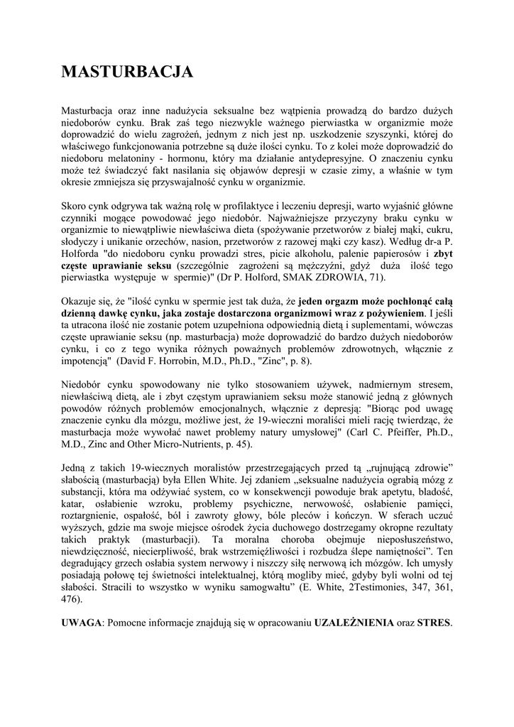 MASTURBACJA Masturbacja oraz inne naduŜycia seksualne bez wątpienia prowadzą do bardzo duŜych niedoborów cynku. Brak zaś tego niezwykle waŜnego pierwiastka w organizmie moŜe doprowadzić do wielu zagroŜeń, jednym z nich jest np. uszkodzenie szyszynki, której do właściwego funkcjonowania potrzebne są duŜe ilości cynku. To z kolei moŜe doprowadzić do niedoboru melatoniny - hormonu, który ma działanie antydepresyjne. O znaczeniu cynku moŜe teŜ świadczyć fakt nasilania się objawów depresji w czasie zimy, a właśnie w tym okresie zmniejsza się przyswajalność cynku w organizmie. Skoro cynk odgrywa tak waŜną rolę w profilaktyce i leczeniu depresji, warto wyjaśnić główne czynniki mogące powodować jego niedobór. NajwaŜniejsze przyczyny braku cynku w organizmie to niewątpliwie niewłaściwa dieta (spoŜywanie przetworów z białej mąki, cukru, słodyczy i unikanie orzechów, nasion, przetworów z razowej mąki czy kasz). Według dr-a P. Holforda "do niedoboru cynku prowadzi stres, picie alkoholu, palenie papierosów i zbyt częste uprawianie seksu (szczególnie zagroŜeni są męŜczyźni, gdyŜ duŜa ilość tego pierwiastka występuje w spermie)" (Dr P. Holford, SMAK ZDROWIA, 71). Okazuje się, Ŝe "ilość cynku w spermie jest tak duŜa, Ŝe jeden orgazm moŜe pochłonąć całą dzienną dawkę cynku, jaka zostaje dostarczona organizmowi wraz z poŜywieniem. I jeśli ta utracona ilość nie zostanie potem uzupełniona odpowiednią dietą i suplementami, wówczas częste uprawianie seksu (np. masturbacja) moŜe doprowadzić do bardzo duŜych niedoborów cynku, i co z tego wynika róŜnych powaŜnych problemów zdrowotnych, włącznie z impotencją" (David F. Horrobin, M.D., Ph.D., "Zinc", p. 8). Niedobór cynku spowodowany nie tylko stosowaniem uŜywek, nadmiernym stresem, niewłaściwą dietą, ale i zbyt częstym uprawianiem seksu moŜe stanowić jedną z głównych powodów róŜnych problemów emocjonalnych, włącznie z depresją: "Biorąc pod uwagę znaczenie cynku dla mózgu, moŜliwe jest, Ŝe 19-wieczni moraliści mieli rację twierdząc, Ŝe masturbacja moŜe wywołać nawet problemy natury umysłowej" (Carl C. Pfeiffer, Ph.D., M.D., Zinc and Other Micro-Nutrients, p. 45). Jedną z takich 19-wiecznych moralistów przestrzegających przed tą „rujnującą zdrowie” słabością (masturbacją) była Ellen White. Jej zdaniem „seksualne naduŜycia ograbią mózg z substancji, która ma odŜywiać system, co w konsekwencji powoduje brak apetytu, bladość, katar, osłabienie wzroku, problemy psychiczne, nerwowość, osłabienie pamięci, roztargnienie, ospałość, ból i zawroty głowy, bóle pleców i kończyn. W sferach uczuć wyŜszych, gdzie ma swoje miejsce ośrodek Ŝycia duchowego dostrzegamy okropne rezultaty takich praktyk (masturbacji). Ta moralna choroba obejmuje nieposłuszeństwo, niewdzięczność, niecierpliwość, brak wstrzemięźliwości i rozbudza ślepe namiętności”. Ten degradujący grzech osłabia system nerwowy i niszczy siłę nerwową ich mózgów. Ich umysły posiadają połowę tej świetności intelektualnej, którą mogliby mieć, gdyby byli wolni od tej słabości. Stracili to wszystko w wyniku samogwałtu” (E. White, 2Testimonies, 347, 361, 476). UWAGA: Pomocne informacje znajdują się w opracowaniu UZALEśNIENIA oraz STRES. Sławomir Gromadzki [email protected] UWAGA! Informacje o wymienionych w opracowaniu ziołolekach oraz sposób ich zaŜywania znajdują się w dziale ARTYKUŁY w temacie ZIOLOŁEKI. Środki te moŜna nabyć w niektórych sklepach zielarskich bądź zamówić za pobraniem pocztowym (płatne przy odbiorze) w sklepie zielarsko-medycznym "Leki z BoŜej Apteki" (Szczecin): EMAIL: [email protected] TEL: 091 433 85 38 Aby leczenie opisanej tutaj dolegliwości było kompletne naleŜy koniecznie dodatkowo przeczytać treść wszystkich opracowań na temat zdrowia (znajdujących się w dziale ARTYKUŁY) a przynajmniej artykuł pt. ZASADY ZDROWIA, gdyŜ realizując podane tam zalecenia oraz odŜywiając się wyłącznie według zawartych tam przepisów kulinarnych z czasem usunięta zostanie prawdziwa przyczyna dolegliwości a nie jedynie jej objawy. Nie mniej istotne jest uwaŜne wysłuchanie znajdujących się równieŜ na tej stronie cyklu wszystkich wykładów (audio) na temat zdrowia, gdyŜ w wyniku ich wysłuchania oraz zastosowania podanych podczas tych prelekcji zaleceń wiele osób uwolniło się od roŜnych często opornych na wcześniejsze próby leczenia - dolegliwości. Zachęcam do uwaŜnego wysłuchania wszystkich tych wykładów bez względu na temat, gdyŜ w kaŜdym z nich znajduje się wiele cennych informacji dotyczących zdrowia. Niezwykle waŜne jest codziennie powierzanie swojego Ŝycia i zdrowia Bogu, który jest w stanie dokonać o wiele więcej niŜ jakiekolwiek kuracje. Szczegóły na ten temat wyjaśnia we wspaniały sposób ksiąŜeczka Droga do Chrystusa, którą gorąco polecam, i którą moŜna znaleźć pod niŜej podanym adresem internetowym: http://nadzieja.pl/ksiazki/droga/01_bezwarunkowa_milosc.html Serdecznie zachęcam do uwaŜnej lektury tej ksiąŜki, gdyŜ właściwe zrozumienie i akceptacja przedstawionych tam prawd doprowadzi do nowonarodzenia, a tym samym do uzyskania odpowiedniej motywacji oraz sił niezbędnych do przeprowadzenia radykalnych zmian w stylu Ŝycia, co jest podstawą, bez której nie ma mowy o trwałym uwolnieniu się od chorób. Serdecznie zachęcam takŜe do zapoznania się z lekturą ksiąŜki Wielki Bój, po przeczytaniu której w moim Ŝyciu doszło do nowonarodzenia i przemian, których wcześniej o własnych silach nie byłem w stanie osiągnąć: http://www.czasdecyzji.pl/viewpage.php?page_id=7 KORESPONDENCYJNA SZKOŁA „KSB” POLECA BEZPŁATNY KURS „ZDROWIE i RODZINA” Bezpłatne lekcje KSB otrzymasz podając swój adres na stronie http://www.kursybiblijne.pl/index.php?ot=ksboff