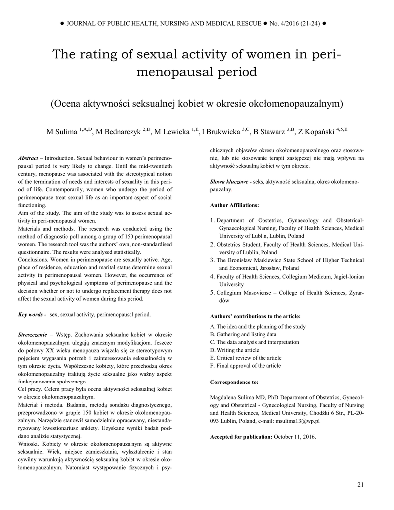 ● JOURNAL OF PUBLIC HEALTH, NURSING AND MEDICAL RESCUE ● No.4/2016 ● ● JOURNAL OF PUBLIC HEALTH, NURSING AND MEDICAL RESCUE ● No. 4/2016 (21-24) ● The rating of sexual activity of women in perimenopausal period (Ocena aktywności seksualnej kobiet w okresie okołomenopauzalnym) M Sulima 1,A,D, M Bednarczyk 2,D, M Lewicka 1,E, I Brukwicka 3,C, B Stawarz 3,B, Z Kopański 4,5,E Abstract – Introduction. Sexual behaviour in women’s perimenopausal period is very likely to change. Until the mid-twentieth century, menopause was associated with the stereotypical notion of the termination of needs and interests of sexuality in this period of life. Contemporarily, women who undergo the period of perimenopause treat sexual life as an important aspect of social functioning. Aim of the study. The aim of the study was to assess sexual activity in peri-menopausal women. Materials and methods. The research was conducted using the method of diagnostic poll among a group of 150 perimenopausal women. The research tool was the authors’ own, non-standardised questionnaire. The results were analysed statistically. Conclusions. Women in perimenopause are sexually active. Age, place of residence, education and marital status determine sexual activity in perimenopausal women. However, the occurrence of physical and psychological symptoms of perimenopause and the decision whether or not to undergo replacement therapy does not affect the sexual activity of women during this period. Key words - sex, sexual activity, perimenopausal period. Streszczenie – Wstęp. Zachowania seksualne kobiet w okresie okołomenopauzalnym ulegają znacznym modyfikacjom. Jeszcze do połowy XX wieku menopauza wiązała się ze stereotypowym pojęciem wygasania potrzeb i zainteresowania seksualnością w tym okresie życia. Współczesne kobiety, które przechodzą okres okołomenopauzalny traktują życie seksualne jako ważny aspekt funkcjonowania społecznego. Cel pracy. Celem pracy była ocena aktywności seksualnej kobiet w okresie okołomenopauzalnym. Materiał i metoda. Badania, metodą sondażu diagnostycznego, przeprowadzono w grupie 150 kobiet w okresie okołomenopauzalnym. Narzędzie stanowił samodzielnie opracowany, niestandaryzowany kwestionariusz ankiety. Uzyskane wyniki badań poddano analizie statystycznej. Wnioski. Kobiety w okresie okołomenopauzalnym są aktywne seksualnie. Wiek, miejsce zamieszkania, wykształcenie i stan cywilny warunkują aktywnością seksualną kobiet w okresie okołomenopauzalnym. Natomiast występowanie fizycznych i psy- chicznych objawów okresu okołomenopauzalnego oraz stosowanie, lub nie stosowanie terapii zastępczej nie mają wpływu na aktywność seksualną kobiet w tym okresie. Słowa kluczowe - seks, aktywność seksualna, okres okołomenopauzalny. Author Affiliations: 1. Department of Obstetrics, Gynaecology and ObstetricalGynaecological Nursing, Faculty of Health Sciences, Medical University of Lublin, Lublin, Poland 2. Obstetrics Student, Faculty of Health Sciences, Medical University of Lublin, Poland 3. The Bronisław Markiewicz State School of Higher Technical and Economical, Jarosław, Poland 4. Faculty of Health Sciences, Collegium Medicum, Jagiel-lonian University 5. Collegium Masoviense – College of Health Sciences, Żyrardów Authors’ contributions to the article: A. The idea and the planning of the study B. Gathering and listing data C. The data analysis and interpretation D. Writing the article E. Critical review of the article F. Final approval of the article Correspondence to: Magdalena Sulima MD, PhD Department of Obstetrics, Gynecology and Obstetrical - Gynecological Nursing, Faculty of Nursing and Health Sciences, Medical University, Chodźki 6 Str., PL-20093 Lublin, Poland, e-mail: [email protected] Accepted for publication: October 11, 2016. 21 ● JOURNAL OF PUBLIC HEALTH, NURSING AND MEDICAL RESCUE ● No.4/2016 ● I. INTRODUCTION ex life is an integral part of health. According to the World Health Organization, sexual health is a state of physical, emotional, mental and social well-being in relation to sexuality. It is not only the absence of disease, dysfunction, or infirmity. Sexual health requires a positive and respectful approach to sexuality and sexual relationships, as well as the possibility of enjoyment and safe sexual experiences, free of coercion, discrimination, or violence [1,2]. Perimenopausal period is the time covering several years before the onset of menopause when clinical, endocrine, and biological features of the upcoming termination of menstruation appear. It is called pre-menopause. Also, menopause is followed by post-menopause [3,4]. Hormonal changes during perimenopause lead to a decline in fertility, but this does not mean that a woman does not experience sexual needs. The literature observes that women in this period often feel the desire to increase the number of sexual contacts and to diversify their sex lives. However, the sexual activity of women is dependent on their individual biological, psychological, and social circumstances [5,6,7,8]. Sexual behaviour in women’s perimenopausal period undergoes significant changes. Until the mid-twentieth century, menopause was associated with the stereotypical notion of the termination of needs and interests of sexuality in this period of life. Contemporarily, women who undergo the period of perimenopause treat sexual life as an important aspect of social functioning [9,10]. S The aim of the study was to assess sexual activity in women’s perimenopausal period. II. MATERIALS AND METHODS The research, based on the diagnostic poll method, was carried out in the OVEA Gynaecology and Obstetrics Centre in Lublin and the Centre for Health in Niedrzwica Duża. The authors’ own questionnaire was used in the study. The study group consisted of 150 women aged 40 to 55 years. The highest percentage of women 38.7% (n=58) was between the ages of 46 to 50, while 34.0% (n=51) of 