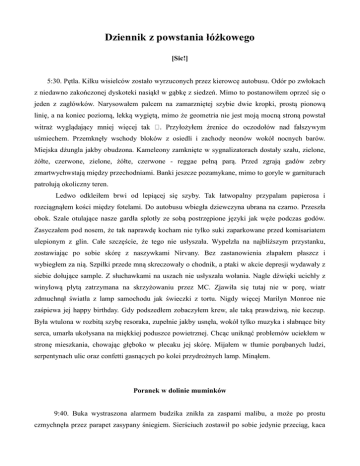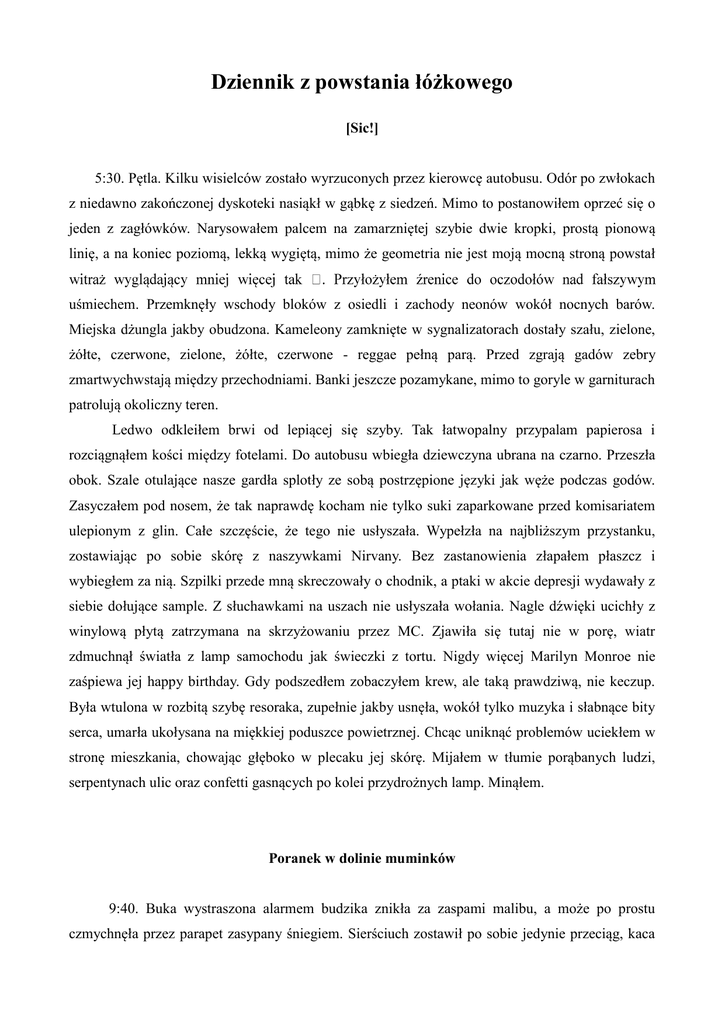 Dziennik z powstania łóżkowego [Sic!] 5:30. Pętla. Kilku wisielców zostało wyrzuconych przez kierowcę autobusu. Odór po zwłokach z niedawno zakończonej dyskoteki nasiąkł w gąbkę z siedzeń. Mimo to postanowiłem oprzeć się o jeden z zagłówków. Narysowałem palcem na zamarzniętej szybie dwie kropki, prostą pionową linię, a na koniec poziomą, lekką wygiętą, mimo że geometria nie jest moją mocną stroną powstał uśmiechem. Przemknęły wschody bloków z osiedli i zachody neonów wokół nocnych barów. Miejska dżungla jakby obudzona. Kameleony zamknięte w sygnalizatorach dostały szału, zielone, żółte, czerwone, zielone, żółte, czerwone - reggae pełną parą. Przed zgrają gadów zebry zmartwychwstają między przechodniami. Banki jeszcze pozamykane, mimo to goryle w garniturach patrolują okoliczny teren. Ledwo odkleiłem brwi od lepiącej się szyby. Tak łatwopalny przypalam papierosa i rozciągnąłem kości między fotelami. Do autobusu wbiegła dziewczyna ubrana na czarno. Przeszła obok. Szale otulające nasze gardła splotły ze sobą postrzępione języki jak węże podczas godów. Zasyczałem pod nosem, że tak naprawdę kocham nie tylko suki zaparkowane przed komisariatem ulepionym z glin. Całe szczęście, że tego nie usłyszała. Wypełzła na najbliższym przystanku, zostawiając po sobie skórę z naszywkami Nirvany. Bez zastanowienia złapałem płaszcz i wybiegłem za nią. Szpilki przede mną skreczowały o chodnik, a ptaki w akcie depresji wydawały z siebie dołujące sample. Z słuchawkami na uszach nie usłyszała wołania. Nagle dźwięki ucichły z winylową płytą zatrzymana na skrzyżowaniu przez MC. Zjawiła się tutaj nie w porę, wiatr zdmuchnął światła z lamp samochodu jak świeczki z tortu. Nigdy więcej Marilyn Monroe nie zaśpiewa jej happy birthday. Gdy podszedłem zobaczyłem krew, ale taką prawdziwą, nie keczup. Była wtulona w rozbitą szybę resoraka, zupełnie jakby usnęła, wokół tylko muzyka i słabnące bity serca, umarła ukołysana na miękkiej poduszce powietrznej. Chcąc uniknąć problemów uciekłem w stronę mieszkania, chowając głęboko w plecaku jej skórę. Mijałem w tłumie porąbanych ludzi, serpentynach ulic oraz confetti gasnących po kolei przydrożnych lamp. Minąłem. Poranek w dolinie muminków 9:40. Buka wystraszona alarmem budzika znikła za zaspami malibu, a może po prostu czmychnęła przez parapet zasypany śniegiem. Sierściuch zostawił po sobie jedynie przeciąg, kaca oraz przerażającą pustkę pod poduszką. I jak w martioszce nie mam pojęcia, ile jeszcze niej może we mnie siedzieć i straszyć prześcieradłem udającym ducha. Bałem się wstać na samą myśl o kosmatych pająkach wyłażących z sieci razem z newsami na portalach internetowych. Postanowiłem jednak zmienić pozycję z leżącej na stojącą. Strzepałem kurz z kołdry i powstałem z sarkofagu. Siku. Następnie kuchnia, szybki rzut okiem na grypsy i hieroglify przypięte na magnes do lodówki. Otwieram. Wyciągam dłoń po mleko - jedyna rzecz, która nie potrafi jeszcze tutaj chodzić i nie zabija odorem. Przyzwyczaiłem się do przegranych na kuchennej szachownicy. Próbuję szarad tabletek, jednak wiem, że nie króluję i nie wierzę w siebie. Zupełnie jak te durne króliki z reklamy baterii lub ten palant ze stumilowego lasu, który udaje, że ma bez liku krewnych i znajomych. Z niezdarstwa zahaczyłem o szklankę, zalałem ceratę i podłogę. Pewnie kot rano uciekał gdzieś przez tą drogę mleczną. Właściwie nie potrafię mieć mu tego za złe. Oboje jesteśmy włóczykijami i przynosimy sobie jedynie pecha. Wzeszło słońce. Zakładam klapki i chowam się w ich kondukcie, prosto do łóżka. Arytmia 13:50. Dzień z góry skazany na porażkę. Wycieczka do marketu. Jak Lord Vader z glanami na nogach otworzyłem drzwi mocami Jedi. Nigdy nie dam sobie wmówić tych bredni o fotokomórce i automatycznym otwieraniu. Podszedłem do stoiska DVD z horrorami, gdzie przypadkiem wystraszyłem Hitchcocka, o mało co staruszek nie dostał zawału. Przy słodyczach wypuściłem z paczek na wolność żelowe misie, by pogryzły w akcie zemsty dzieci za stracone, młodzieńcze lata. Pięć minut później schowany za regałem rzuciłem w warzywa popcornowy granat rozpryskowy, krzycząc jak smerf zgrywus - niespodzianka! Booom! Podniecony nie mogłem odróżnić papryki od pulsującego serca, mózgu od resztek kalafiora rozbryzganego na podłodze. Zza rogu wybiegli ochroniarze. Bez zastanowienia uciekałem byle gdzie. Potrąciłem hostessę, ale pomogłem wstać dziewczynie jak dżentelmen, nie przejąłem się nawet jej atakiem padaczki. Skorzystałem z okazji, spytałem czy zatańczymy. Odzewu brak. Wycieńczony wygibasami wsiadłem w wózek i do kasy, po drodze minąłem watahę pogujących mopów oraz kotsiarkę skracającą o głowę wszystko, co czarne i przebiega drogę. Traumatyczne przeżycie. Odpocząłem chwilę w dziale AGD, dla haju wciągnąłem ze znajomym odkurzaczem po kresce mąki i oranżady. Nerwowo po śliskiej posadzce z dłonią w kieszeni wykonywałem onaniczne ruchy. Ulga. Znalazłem listę. Nieczytelna, więc z zakupów nici. Niespodziewanie zastałem kolejkę do bramki dla klientów opuszczających sklep bez zakupów. Pięć minut, dziesięć, pół godziny. Zacząłem modlić się, aby helikopter spadł mi na głowę lub chociaż sufit z impetem przywitał podłogę, ubijając lastryko jak tłuczek karbujący skórę sąsiadki. Obok kolejka do kasy, zerknąłem. Torby, torby pełne zakupów. Dziury z sera - bezcenne. Biegunka po przeterminowanym piwie bez wątpienia - bezcenna. Rzeź węża wijącego się przede mną od niemal godziny - warta własnej ceny. Czułem każdy z podrobów, krwistą wątrobę od mamy dla zdrowo wyżywionych dzieci. Nawet oddech astmatyków kaszlących w kark z coraz mniejszą natarczywością. Klient nasz Pan. W myślach zabijam wszystkich. 