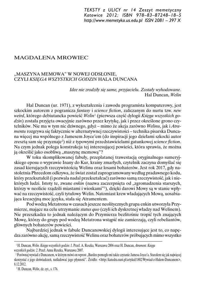 TEKSTY z ULICY nr 14 Zeszyt memetyczny Katowice 2012; ISBN 978–83–87248–18–5 http://www.memetyka.us.edu.pl ISSN 2081 – 397 X MAGDALENA MROWIEC „MASZYNA MEMOWA” W NOWEJ ODSŁONIE, CZYLI KSIĘGA WSZYSTKICH GODZIN HALA DUNCANA Idee nie zrodziły się same, przyjacielu. Zostały wyhodowane. Hal Duncan, Welin Hal Duncan (ur. 1971), z wykształcenia i zawodu programista komputerowy, jest szkockim autorem z pogranicza fantasy i science fiction, zaliczanym do nurtu tzw. new weird, którego debiutancka powieść Welin1 (pierwsza część dylogii Księga wszystkich godzin) została przyjęta owacyjnie zarówno przez krytykę, jak i przez określone grono czytelników. Nie ma w tym nic dziwnego, gdyż – mimo że akcja zarówno Welinu, jak i Atramentu rozgrywa się faktycznie w alternatywnej rzeczywistości – technika pisarska Duncana więcej ma wspólnego z Jamesem Joyce’em (do inspiracji jego dziełami szkocki autor zresztą sam się przyznaje2) niż z typowymi przedstawicielami gatunkowej science fiction. Na czym jednak polega konstrukcja tej interesującej powieści, która sprawia, że można ją określić jako osobliwą „maszynę memową”? W toku skomplikowanej fabuły, przeplatanej trawestacją oryginalnego sumeryjskiego eposu o wyprawie Inany do Kur, krainy zmarłych, czytelnik zaczyna domyślać się zasad kierujących rzeczywistością Welinu oraz losami bohaterów. Jest rok 2017, gdy nastoletnia Phreedom odkrywa, że świat został zaprogramowany według pradawnego kodu, który przekształcił (i pozwala nadal przekształcać) zarówno samą rzeczywistość, jak i niektórych ludzi. Istoty te, zwane enkin (nazwa zaczerpnięta od „zgromadzenia starszych, którzy w neolicie rządzili miastami i wioskami”3), dzięki darowi Mowy są w stanie wpływać na rzeczywistość, czyli tytułowy Welin. Natomiast krew władających Mową, uosabiająca kreacyjną moc języka, stała się Atramentem. Pod wodzą Metatrona w czasach jeszcze neolitycznych grupa enkin utworzyła Przymierze, mające na celu utrzymanie status quo (czyli ich dyskretnej władzy nad Welinem). Nie przeszkadza to jednak należącym do Przymierza bezlitośnie tropić tych znających Mowę, którzy do grupy pod wodzą Metatrona wstąpić nie zamierzają, czyli rebeliantów, głównych bohaterów powieści. Najbardziej jednak w fabule Duncanowskiej dylogii interesujące jest to, co napędza zarówno akcję, samą rzeczywistość Welinu oraz bohaterów próbujących mimo wszystko 1 H. Duncan, Welin. Księga wszystkich godzin: 1. Przeł. A. Reszka, Warszawa 2006 oraz H. Duncan, Atrament. Księga wszystkich godzin: 2. Przeł. Anna Reszka, Warszawa 2007. 2 Porównaj wywiad z Duncanem, w którym mówi on wprost „Bardzo pomogło mi także czytanie Jamesa Joyce’a. Starałem się jak najwięcej skorzystać z jego doświadczeń, naśladować jego płynność”. Źródło: <http://katedra.nast.pl/artykul/1802/Wywiad-z-Halem-Duncanem>, 8.12.2012. 3 H. Duncan, Welin, dz. cyt., s. 176. 8 TEKSTY z ULICY nr 14 Zeszyt memetyczny wziąć swe losy we własne ręce. A motorem tym są… memy, stare jak świat, stare jak „szympans snujący opowieści”4. W pierwszej części Księgi wszystkich godzin ich podstawową matrycą jest świat mitów starożytnego Sumeru, a także opowieści o Prometeuszu i Io, w części drugiej – przede wszystkim Bachantki Eurypidesa oraz Bukoliki Wergiliusza (lecz by oddać sprawiedliwość Duncanowi, trzeba przyznać, że – być może wzorem m.in. Joyce’a – przywołuje on prawdziwy ocean memetycznych wzorców i nawiązań, od kultury wysokiej poprzez popularną, legendę miejską, a nawet witryny internetowe5). Jednak jego celem jest nie tyle przepisanie mitu na nowo, jak miało to miejsce w Ulissesie Joyce’a, który napisał swoją monumentalną opowieść, by ukazać zdegradowaną podróż nowoczesnego, antyheroicznego Odyseusza jako „jeden dzień z życia” Leopolda i Molly Bloom6. U Duncana mamy do czynienia ze stworzeniem z mitu swoistego algorytmu, który generuje zarówno bohaterów książki, jak i samą opowieść. Czytelnik Welinu – także dzięki równolegle prowadzonemu wątkowi zejścia Inany do podziemi, przy konstruowaniu którego Duncan opiera się prawie całkowicie na świetnych przekładach oryginalnego sumeryjskiego eposu – po pewnym czasie orientuje się, że Phreedom i jej brat Thomas nieświadomie powielają mityczno-memetyczny wzorzec Inany zmierzającej do Kur, aby rozszerzyć swą władzę, umierającej tam, a następnie oddającej swego brata Dummuziego/Tammuza, by pozostał w państwie podziemnym zamiast niej. Jednak co ciekawe, gdy Inana-Anna-Phreedom już uświadomi sobie tę symboliczną infekcję, która steruje losami jej i jej umierającego w każdej fałdzie7 Welinu brata, będzie próbowała ze wszystkich sił przejąć kontrolę nad realizowanym przez siebie scenariuszem, by „wygrać z mężczyznami w ich własną grę”8 (podobnie jak robiła to w męskim świcie neolitu ekspansywna bogini wojen i miłości, jaką była sumeryjska Inana). 4 Koncepcje Pan narrans Stewarta i Cohena oraz Edwarda O. Wilsona zestawia D. Wężowicz-Ziółkowska, Moc narrativum. Idee biologii we współczesnym dyskursie humanistycznym, Katowice 2008, s. 225–226. 5 Jedno z odwołań do przestrzeni internetu jest szczególnie interesujące pod kątem memetycznym. Wiąże się ono z zarysowanym soczyście i jednocześnie subtelnie istotnym wątkiem homoerotycznym Księgi wszystkich godzin (sam Hal Duncan otwarcie przyznaje się do swojej orientacji seksualnej). W pewnym momencie Puk, który jest jednocześnie Thomasem z innych warstw Welinu, ginie, bestialsko zamordowany przez dwóch homofobów o aryjskim wyglądzie. W powieści pada taki komentarz: „Ale bigoci zawsze uważali tych, których nienawidzą, za moralnie zepsutych, jakby myląc własną estetykę odrazy i strach z krytyką etyczną, racjonalizowali swoje reakcje emocjonalne i z pasją narzuc
