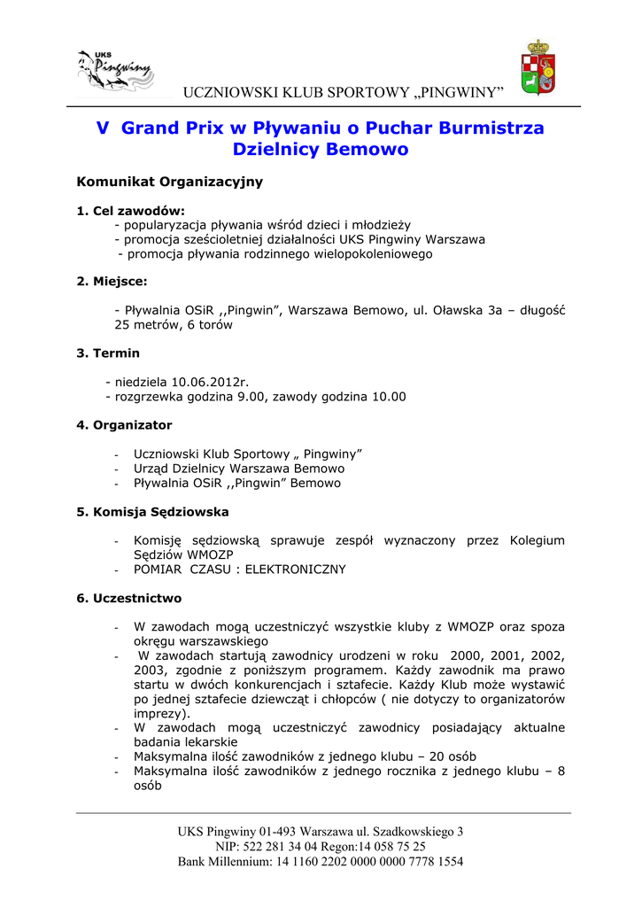 UCZNIOWSKI KLUB SPORTOWY „PINGWINY” V Grand Prix w Pływaniu o Puchar Burmistrza Dzielnicy Bemowo Komunikat Organizacyjny 1. Cel zawodów: - popularyzacja pływania wśród dzieci i młodzieży - promocja sześcioletniej działalności UKS Pingwiny Warszawa - promocja pływania rodzinnego wielopokoleniowego 2. Miejsce: - Pływalnia OSiR ,,Pingwin”, Warszawa Bemowo, ul. Oławska 3a – długość 25 metrów, 6 torów 3. Termin - niedziela 10.06.2012r. - rozgrzewka godzina 9.00, zawody godzina 10.00 4. Organizator - Uczniowski Klub Sportowy „ Pingwiny” Urząd Dzielnicy Warszawa Bemowo Pływalnia OSiR ,,Pingwin” Bemowo 5. Komisja Sędziowska - Komisję sędziowską sprawuje zespół wyznaczony przez Kolegium Sędziów WMOZP POMIAR CZASU : ELEKTRONICZNY 6. Uczestnictwo - - W zawodach mogą uczestniczyć wszystkie kluby z WMOZP oraz spoza okręgu warszawskiego W zawodach startują zawodnicy urodzeni w roku 2000, 2001, 2002, 2003, zgodnie z poniższym programem. Każdy zawodnik ma prawo startu w dwóch konkurencjach i sztafecie. Każdy Klub może wystawić po jednej sztafecie dziewcząt i chłopców ( nie dotyczy to organizatorów imprezy). W zawodach mogą uczestniczyć zawodnicy posiadający aktualne badania lekarskie Maksymalna ilość zawodników z jednego klubu – 20 osób Maksymalna ilość zawodników z jednego rocznika z jednego klubu – 8 osób UKS Pingwiny 01-493 Warszawa ul. Szadkowskiego 3 NIP: 522 281 34 04 Regon:14 058 75 25 Bank Millennium: 14 1160 2202 0000 0000 7778 1554 UCZNIOWSKI KLUB SPORTOWY „PINGWINY” - Liczy się kolejność zgłoszeń, max 250 osób 7. Program zawodów Dziewczęta 1. 4 x 50 m st. dowolny ( po jednej zawodniczce z każdego rocznika ) 3. 50 m st. motylkowym (rocznik , 2000, 2001,2002) 5. 50 m st. grzbietowym ( rocznik 2002, 2003) 7. 100 m st. grzbietowym (rocznik 2000, 2001) 9. 50 m st. dowolnym ( rocznik 2002, 2003) 11. 100 m st. dowolnym (rocznik 2000, 2001) 13. 50 m st. klasycznym ( rocznik 2002, 2003) 15. 100 m st. klasycznym (rocznik 2000, 2001) 17. 100 m st. zmiennym (rocznik 2000, 2001, 2002) Chłopcy 2. 4 x 50 m st. dowolny ( po jednym zawodniku z każdego rocznika ) 4. 50 m st. motylkowym (rocznik 2000, 2001, 2002) 6. 50 m st. grzbietowym ( rocznik 2002, 2003) 8. 100 m st. grzbietowym (rocznik 2000, 2001) 10. 50 m st. dowolnym ( rocznik 2002, 2003) 12. 100 m st. dowolnym (rocznik 2000, 2001) 14. 50 m st. klasycznym ( rocznik 2002, 2003) 16. 100 m st. klasycznym (rocznik 2000, 2001) 18. 100 m st. zmiennym (rocznik 2000, 2001, 2002) Sztafeta wielopokoleniowa rodzinna 19. 3 x 50m st. dowolny dziecko/mama lub tata/babcia lub dziadek; 8. Przepisy techniczne Zawody zostaną rozegrane seriami na czas. Pomiar czasu – elektroniczny. - Zawodnik ma prawo startu w 2-ch konkurencjach indywidualnych oraz w dwóch sztafetach (rodzinnej i międzyrocznikowej) - Zawodnicy będą rozstawieni na podstawie zgłoszonych czasów w seriach od najszybszej do najwolniejszej. - Zawody zostaną przeprowadzone zgodnie z przepisami PZP. - W sprawach nie objętych regulaminem decyduje Sędzia Główny w porozumieniu z organizatorem. - W wyścigach sztafetowych (chłopcy i dziewczęta) w razie braku starszego rocznika dopuszcza się start zawodnika młodszego. - UKS Pingwiny 01-493 Warszawa ul. Szadkowskiego 3 NIP: 522 281 34 04 Regon:14 058 75 25 Bank Millennium: 14 1160 2202 0000 0000 7778 1554 UCZNIOWSKI KLUB SPORTOWY „PINGWINY” Sztafeta wielopokoleniowa rodzinna - Forma startu dowolna - z wody lub ze słupka; - Startujący zawodnicy winni być biologiczną rodziną - Wiek zawodników jest dowolny 9. Nagrody i ocena zawodów - każdy z uczestników dostaje słodką niespodziankę przed zawodami. - Najlepszych sześciu zawodników i zawodniczek w każdym roczniku, w każdej konkurencji otrzyma pamiątkowe dyplomy. - Najlepszych trzech zawodników i zawodniczek otrzyma medale oraz nagrody rzeczowe. - Najlepsze trzy sztafety (chłopców i dziewcząt) otrzymują medale, dyplomy oraz Puchary Burmistrza Dzielnicy Bemowo. - Najlepsza sztafeta chłopców i dziewcząt otrzymuje nagrody rzeczowe - Najlepsze trzy sztafety rodzinne otrzymają puchary, medale i dyplomy - Za najlepszy wynik (jednej konkurencji) zawodów w kategorii dziewcząt i chłopców według tabeli wielobojowej FINA zostaną wręczone statuetki. 10. Opłaty startowe i zasady finansowania - Opłata startowa wynosi 30 złotych od każdego zawodnika – płatna przed zawodami. - Koszty organizacyjne pokrywa Organizator. - Koszty uczestnictwa pokrywają kluby. 11. Zgłoszenie UWAGA: Wszystkie zgłoszenia na zawody należy wypełniać w programie Entry Edytor i wysłać na adres e-mailowy: [email protected] Zgłoszenia proszę nadsyłać do 07.06.2012r. Lista zgłoszonych zawodników ukaże się na stronie internetowej w dniu 09.06.2012r. Zgodnie z regulaminem PZP po opublikowaniu w internecie listy zgłoszonych zawodników zmiany mogą być dokonane wyłącznie pocztą elektroniczną do dnia 08.06.2012r. i dotyczyć: - wycofania zawodnika z konkurencji - wpisania na miejsce wycofanego zawodnika w tej samej konkurencji innego reprezentanta tego samego klubu. Zgłoszenia nadesłane po terminie nie będą włączone do zawodów. UKS Pingwiny 01-493 Warszawa ul. Szadkowskiego 3 NIP: 522 281 34 04 Regon:14 058 75 25 Bank Millennium: 14 1160 2202 0000 0000 7778 1554 UCZNIOWSKI KLUB SPORTOWY „PINGWINY” 13. Dodatkowe informacje - Karol Perl tel. 880 301 882 e-mail: [email protected] UKS Pingwiny 01-493 Warszawa ul. Szadkowskiego 3 NIP: 522 281 34 04 Regon:14 058 75 25 Bank Millennium: 14 1160 2202 0000 0000 7778 1554
