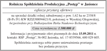 Rolnicza Spółdzielnia Produkcyjna „Postęp” w Jasionce ogłasza przetarg ofertowy na sprzedaż działki rolnej zabudowanej o pow. 1,62 ha nr 2338/8 (B-Ps IV) KW RZlZ/00094621/0, położonej w Wysokiej Głogowskiej, bezpośrednio przy Podkarpackim Parku Naukowo-Technologicznym. Cena wywoławcza: 1.500.000 zł Informacja i przyjmowanie ofert pisemnych do dnia 15.09.2011 r. kontakt: RSP „Postęp”, 36-002 Jasionka, tel. 17-8539566, 600 029 605. Spółdzielnia zastrzega sobie prawo unieważnienia przetargu bez podania przyczyn.