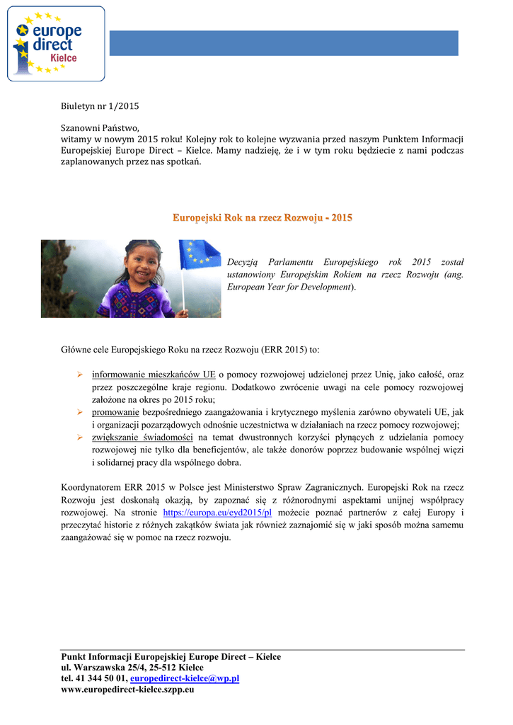 Biuletyn nr 1/2015 Szanowni Państwo, witamy w nowym 2015 roku! Kolejny rok to kolejne wyzwania przed naszym Punktem Informacji Europejskiej Europe Direct – Kielce. Mamy nadzieję, że i w tym roku będziecie z nami podczas zaplanowanych przez nas spotkań. Decyzją Parlamentu Europejskiego rok 2015 został ustanowiony Europejskim Rokiem na rzecz Rozwoju (ang. European Year for Development). Główne cele Europejskiego Roku na rzecz Rozwoju (ERR 2015) to: informowanie mieszkańców UE o pomocy rozwojowej udzielonej przez Unię, jako całość, oraz przez poszczególne kraje regionu. Dodatkowo zwrócenie uwagi na cele pomocy rozwojowej założone na okres po 2015 roku; promowanie bezpośredniego zaangażowania i krytycznego myślenia zarówno obywateli UE, jak i organizacji pozarządowych odnośnie uczestnictwa w działaniach na rzecz pomocy rozwojowej; zwiększanie świadomości na temat dwustronnych korzyści płynących z udzielania pomocy rozwojowej nie tylko dla beneficjentów, ale także donorów poprzez budowanie wspólnej więzi i solidarnej pracy dla wspólnego dobra. Koordynatorem ERR 2015 w Polsce jest Ministerstwo Spraw Zagranicznych. Europejski Rok na rzecz Rozwoju jest doskonałą okazją, by zapoznać się z różnorodnymi aspektami unijnej współpracy rozwojowej. Na stronie https://europa.eu/eyd2015/pl możecie poznać partnerów z całej Europy i przeczytać historie z różnych zakątków świata jak również zaznajomić się w jaki sposób można samemu zaangażować się w pomoc na rzecz rozwoju. Punkt Informacji Europejskiej Europe Direct – Kielce ul. Warszawska 25/4, 25-512 Kielce tel. 41 344 50 01, [email protected] www.europedirect-kielce.szpp.eu Na dobry początek: K ON K U R S Wystarczy, że napiszesz artykuł (max. 1000 słów) na jeden z dwóch tematów dotyczących rozszerzenia Unii Europejskiej, a być może wygrasz 3-dniowy wyjazd studyjny do Brukseli. Komisja Europejska chce poznać Twoją opinię na temat: 1) Jakie masz doświadczenia w rozszerzonej Unii Europejskiej? 2) Jak rozszerzona Unia Europejska odpowiada na wyzwania przyszłości? W konkursie mogą wziąć udział obywatele 28 państw członkowskich w wieku 18-25 lat. Artykuł można nadesłać w dowolnym języku urzędowym Unii Europejskiej. Każdy uczestnik może nadesłać tylko jeden artykuł. Termin nadsyłania artykułów mija 27 lutego br. o godz. 12:00 za pośrednictwem formularza zgłoszeniowego dostępnego online: http://bit.ly/1xOWmKv Serdecznie zachęcamy wszystkich mających choć troszkę smykałki dziennikarskiej Więcej ciekawych konkursów możecie znaleźć tutaj - http://bit.ly/1Djw83N GWIEZDNY KRĄG Dnia 5 stycznia 2015 roku o godzinie 16.00 na Słupskiej Miejskiej Platformie E-Learningowej odbył się II etap Olimpiady. Uczestnicy zmagali się z testem złożonym ze 100 pytań zamkniętych wielokrotnego wyboru. Do finału zakwalifikowało się 11 uczestników, którzy zdobyli największą liczę punktów. W rozgrywkach finałowych, które odbędą się 26 lutego w Słupsku zmierzy się po raz kolejny reprezentant naszego województwa – Andrzej Szulc. Trzymajmy kciuki za Andrzeja Szulca z Liceum im. Świętej Jadwigi Królowej w Zespole Szkół Sióstr Nazaretanek w Kielcach! Łotewska prezydencja w Radzie UE Prezydencja w Radzie UE sprawowana jest kolejno przez wszystkie państwa członkowskie (prezydencja rotacyjna), każdorazowo przez 6 miesięcy, zaczynając od stycznia i od lipca danego roku. Przedstawiciele państwa sprawującego prezydencję w Radzie UE, zarówno na szczeblu ministerialnym jak i eksperckim, są odpowiedzialni za ustalanie porządku obrad posiedzeń oraz prowadzenie negocjacji w gronie państw członkowskich. W celu zapewnienia kontynuacji działań prowadzonych przez 6-miesięczne prezydencje wprowadzony został system trio prezydencji, czyli współpracy trzech kolejno po sobie sprawujących prezydencję państw. Trzy państwa przygotowują wspólnie 18-miesięczny program pracy stanowiący platformę współpracy przygotowaną wspólnie z Komisją Europejską. Polska sprawowała po raz pierwszy prezydencję w Radzie UE w okresie 1 lipca-31 grudnia 2011 r., a wspólny 18-miesięczny program przygotowała z Danią i Cyprem. 1 stycznia 2015 r. po raz pierwszy przewodnictwo w Radzie UE objęła Łotwa (państwo członkowskie UE od 2004 r.). Link do strony łotewskiej prezydencji: https://eu2015.lv/ Punkt Informacji Europejskiej Europe Direct – Kielce ul. Warszawska 25/4, 25-512 Kielce tel. 41 344 50 01, [email protected] www.europedirect-kielce.szpp.eu Eurolekcje dla euro-obywateli Już 10.02.2015 r. w Wojewódzkiej Bibliotece Publicznej w Kielcach odbędzie się pierwsze w tym roku spotkanie z cyklu „Eurolekcje dla euroobywateli”. Prowadzone przez nas zajęcia skierowane są do uczniów szkół podstawowych, gimnazjalnych i ponadgimnazjalnych z regionu województwa świętokrzyskiego. Nauczycieli i opiekunów zainteresowanych przekazywaniem wiedzy o funkcjonowaniu Unii Europejskiej z pasją serdecznie zapraszamy do kontaktu. Chętnie zawitamy w Państwa szkole! Proponowane przez nas zajęcia prowadzone są w oparciu o angażujące metody nauczania, w formie warsztatów. Część lekcji zakłada wykorzystanie prezentacji multimedialnych, a te dla najmłodszych – gry i zabawy. Poniżej próbka tematyki prowadzonych przez nas zajęć: Co to jest Unia Europejska i w jakim celu została stworzona?; Kraje członkowskie UE i ich symbole; Polska w Unii Europejskiej; Ekologia w Unii Europejskiej; Poznaj swoje prawa; Unia Europejska jako drzewo historii dziejów; Kto jest kim w Unii Europejskiej, czyli rzecz o instytucjach; Traktat Lizboński – kolejny etap w rozwoju UE; Stanowienie prawa w Unii Europejskiej; Punkt Informacji Europejskiej Europe Direct – Kielce ul. Warszawska 25/4, Kielce 25-512 tel./fax 41 344 50 01 www.europedirect-kielce.szpp.eu Osoby do kontaktu: Anna Kaczor, Karol Kaczmarski, Krzysztof Filipek Redakcja biuletynu: Katarzyna S