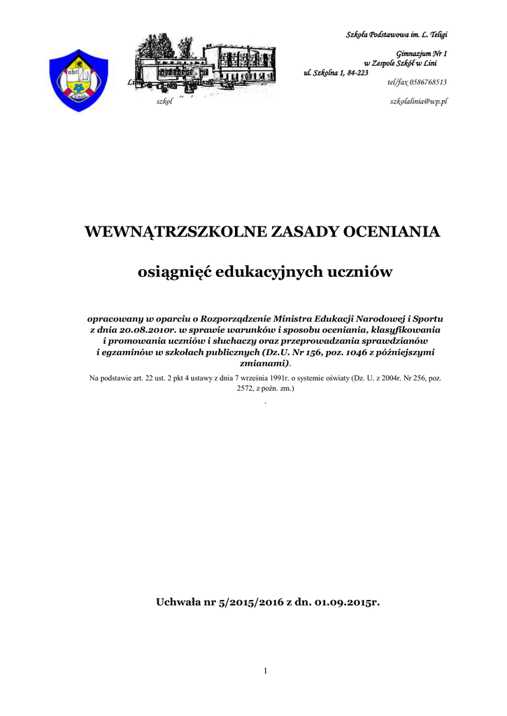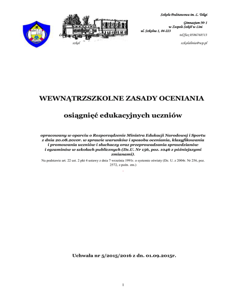 Szkoła Podstawowa im. L. Teligi Gimnazjum Nr 1 w Zespole Szkół w Lini ul. Szkolna 1, 84-223 tel/fax 0586768513 Linia szkol [email protected] WEWNĄTRZSZKOLNE ZASADY OCENIANIA osiągnięć edukacyjnych uczniów opracowany w oparciu o Rozporządzenie Ministra Edukacji Narodowej i Sportu z dnia 20.08.2010r. w sprawie warunków i sposobu oceniania, klasyfikowania i promowania uczniów i słuchaczy oraz przeprowadzania sprawdzianów i egzaminów w szkołach publicznych (Dz.U. Nr 156, poz. 1046 z późniejszymi zmianami). Na podstawie art. 22 ust. 2 pkt 4 ustawy z dnia 7 września 1991r. o systemie oświaty (Dz. U. z 2004r. Nr 256, poz. 2572, z poźn. zm.) . Uchwała nr 5/2015/2016 z dn. 01.09.2015r. 1 WEWNĄTRZSZKOLNE ZASADY OCENIANIA ZESPÓŁ SZKÓŁ W LINI SPIS TREŚCI ROZDZIAŁ I OGÓLNE ZASADY OCENIANIA WEWNĄTRZSZKOLNEGO § 1 POSTANOWIENIA WSPÓLNE § 2 PROCEDURY ROZDZIAŁ II JAWNOŚĆ OCENY §1 POSTANOWIENIA WSPÓLNE §2 PROCEDURY ROZDZIAŁ III DOSTOSOWANIE WYMAGAŃ, ZWOLNIENIE Z ZAJĘĆ, USPRAWIEDLIWIENIA §1 DOSTOSOWANIE, WYMAGAŃ EDUKACYJNYCH §2 ZWOLNIENIE UCNIA Z ZAJĘĆ PRZEZ DYREKTORA §3 ZWOLNIENIE Z ZAJĘĆ, USPRAWIEDLIWIENIA UCZNIA PRZEZ RODZICÓW ROZDZIAŁ IV OCENY BIEŻĄCE, ŚRÓDROCZNE, KLASYFIKACYJNE §1 SZKOLNY SYSTEMY OCENIANIA § 2 WSPÓLNE PROCEDURY OCENIANIA § 3 OCENIANIE KLASY I-III KLASY IV-VI SP i I-III G. ODDZIAŁ PRZEDSZKOLNY §4 PROCEDURA POPRAWY ROCZNEJ OCENY KLASYFIKACYJNEJ Z ZAJĘĆ EDUKACYJNYCH ROZDZIAŁ V OCENA ZACHOWANIA BIEŻĄCA, ŚRÓDROCZNA I ROCZNA §1 POSTANOWIENIA WSPÓLNE §2 SKALA OCEN KLASY I-III KLASY IV-VI SP i I-III G. §3 OGÓLNE KRYTERIA OCENIANIA ZACHOWANIA KLASY I – III SP KLASY IV-VI SP, I-III GIM. §4 WYMAGANIA NA POSZCZEGÓLNĄ OCENĘ ZACHOWANIA W KL. IV-VI SP, I-III GIM. §5 PROCEDURA UZYSKANIA WYŻSZEJ NIŻ PRZEWIDYWANA KOŃCOWOROCZNA OCENY ZACHOWANIA ROZDZIAŁ VI KLASYFIKACJA ŚRÓDROCZNA I ROCZNA §1 POSTANOWIENIA WSPÓLNE §2 PROCEDURY ROZDZIAŁ VII PROMOWANIE § 1 POSTANOWIENIA WSPÓLNE ROZDZIAŁ VIII UKOŃCZENIE SZKOŁY § 1 POSTANOWIENIA WSPÓLNE 2 WEWNĄTRZSZKOLNE ZASADY OCENIANIA ZESPÓŁ SZKÓŁ W LINI ROZDZIAŁ I OGÓLNE ZASADY OCENIANIA WEWNĄTRZSZKOLNEGO §1 POSTANOWIENIA WSPÓLNE Ocenianie wewnątrzszkolne w Szkole Podstawowej im. L.Teligi w Lini i Gimnazjum nr 1 w Lini regulują Wewnątrzszkolne Zasady Oceniania zwane dalej WZO. O wszelkich sprawach dotyczących oceniania wewnątrzszkolnego, których nie regulują odpowiednie rozporządzenia albo WZO decyduje dyrektor. Ocenianiu podlegają: 1) osiągnięcia edukacyjne ucznia; 2) zachowanie ucznia. 4. Ocenianie osiągnięć edukacyjnych i zachowania ucznia ma na celu: 1)informowanie ucznia o poziomie jego osiągnięć edukacyjnych i jego zachowaniu oraz o postępach w tym zakresie; 2) udzielanie uczniowi pomocy w nauce poprzez przekazanie uczniowi informacji o tym, co zrobił dobrze i jak powinien się dalej uczyć; 3) udzielanie wskazówek do samodzielnego planowania własnego rozwoju; 4) motywowanie ucznia do dalszych postępów w nauce i zachowaniu; 5) dostarczanie rodzicom i nauczycielom informacji o postępach i trudnościach w nauce i zachowaniu ucznia oraz o szczególnych uzdolnieniach ucznia; 6) umożliwienie nauczycielom doskonalenia organizacji i metod pracy dydaktyczno-wychowawczej. 5.Ocenianie osiągnięć edukacyjnych ucznia polega na rozpoznawaniu przez nauczycieli poziomu i postępów w opanowaniu przez ucznia wiadomości i umiejętności w stosunku do wymagań edukacyjnych wynikających z podstawy programowej, określonej w odrębnych przepisach, i realizowanych w szkole programów nauczania uwzględniających tę podstawę. 6. Ocenianie zachowania ucznia polega na rozpoznawaniu przez wychowawcę klasy, nauczycieli oraz uczniów danej klasy stopnia respektowania przez ucznia zasad współżycia społecznego i norm etycznych oraz obowiązków ucznia określonych w statucie szkoły. 7.Ocenianie osiągnięć edukacyjnych i zachowania ucznia odbywa się w ramach oceniania wewnątrzszkolnego. 8.Ocenianie wewnątrzszkolne obejmuje : 1)formułowanie przez nauczycieli wymagań edukacyjnych niezbędnych do uzyskania poszczególnych śródrocznych i rocznych ocen klasyfikacyjnych z obowiązkowych i dodatkowych zajęć edukacyjnych oraz śródrocznych i rocznych ocen klasyfikacyjnych z obowiązkowych i dodatkowych zajęć edukacyjnych, 2)ustalenie kryteriów oceniania zachowania, 3 WEWNĄTRZSZKOLNE ZASADY OCENIANIA ZESPÓŁ SZKÓŁ W LINI 3)ocenianie bieżące i ustalenie śródrocznych ocen klasyfikacyjnych z obowiązkowych i dodatkowych zajęć edukacyjnych oraz śródrocznej oceny klasyfikacyjnej zachowania, według skali i w formach przyjętych przez Zespół Szkół w Lini, 4)przeprowadzenie egzaminów klasyfikacyjnych i poprawkowych, 5)ustalanie rocznych i śródrocznych ocen klasyfikacyjnych z obowiązkowych i dodatkowych zajęć edukacyjnych oraz rocznej oceny klasyfikacyjnej zachowania, 6)ustalanie warunków i trybu uzyskania wyższych niż przewidywane rocznych ocen klasyfikacyjnych z obowiązkowych i dodatkowych zajęć edukacyjnych oraz rocznej ocen y klasyfikacyjnej zachowania, 7)ustalanie warunków i sposoby przekazywania rodzicom(prawnym opiekunom) informacji o postępach i trudnościach ucznia w nauce, 8)ustalanie sposobu i kryteriów oceny projektu edukacyjnego. 9.Uczeń ma obowiązek poddawać się ocenie, a nauczyciel ma obowiązek systematycznego oceniania osiągnięć ucznia. 10. Uczniowie gimnazjum biorą udział w realizacji projektu edukacyjnego. 1)Projekt edukacyjny jest zespołowym, planowym działaniem uczniów, mającym na celu rozwiązanie konkretnego problemu, z zastosowaniem różnorodnych metod. 2)Zakres tematyczny projektu edukacyjnego może dotyczyć wybranych treści nauczania określonych w podstawie programowej kształcenia ogólnego dla gimnazjów lub wykraczać poza te treści. 3)Projekt edukacyjny jest realizowany przez zespół uczniów pod opieką nauczyciela i obejmuje działania określone w rozporządzeniu dot. ocen
