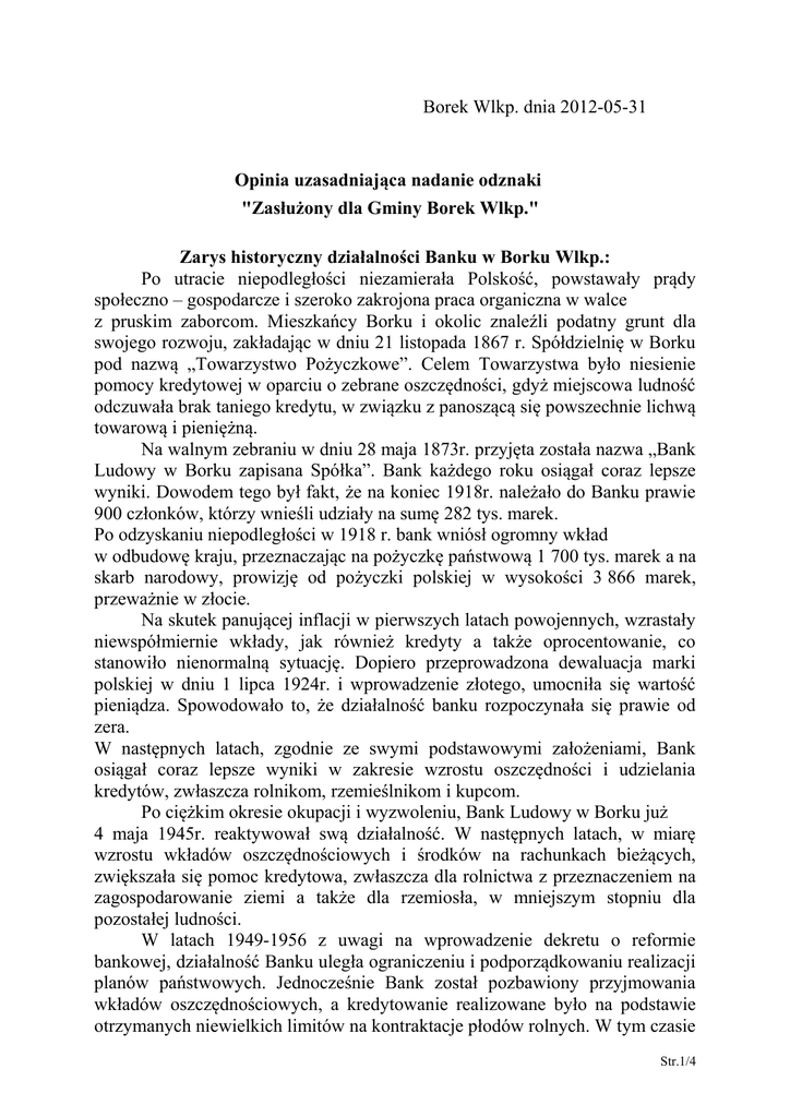 Borek Wlkp. dnia 2012-05-31 Opinia uzasadniająca nadanie odznaki "Zasłużony dla Gminy Borek Wlkp." Zarys historyczny działalności Banku w Borku Wlkp.: Po utracie niepodległości niezamierała Polskość, powstawały prądy społeczno – gospodarcze i szeroko zakrojona praca organiczna w walce z pruskim zaborcom. Mieszkańcy Borku i okolic znaleźli podatny grunt dla swojego rozwoju, zakładając w dniu 21 listopada 1867 r. Spółdzielnię w Borku pod nazwą „Towarzystwo Pożyczkowe”. Celem Towarzystwa było niesienie pomocy kredytowej w oparciu o zebrane oszczędności, gdyż miejscowa ludność odczuwała brak taniego kredytu, w związku z panoszącą się powszechnie lichwą towarową i pieniężną. Na walnym zebraniu w dniu 28 maja 1873r. przyjęta została nazwa „Bank Ludowy w Borku zapisana Spółka”. Bank każdego roku osiągał coraz lepsze wyniki. Dowodem tego był fakt, że na koniec 1918r. należało do Banku prawie 900 członków, którzy wnieśli udziały na sumę 282 tys. marek. Po odzyskaniu niepodległości w 1918 r. bank wniósł ogromny wkład w odbudowę kraju, przeznaczając na pożyczkę państwową 1 700 tys. marek a na skarb narodowy, prowizję od pożyczki polskiej w wysokości 3 866 marek, przeważnie w złocie. Na skutek panującej inflacji w pierwszych latach powojennych, wzrastały niewspółmiernie wkłady, jak również kredyty a także oprocentowanie, co stanowiło nienormalną sytuację. Dopiero przeprowadzona dewaluacja marki polskiej w dniu 1 lipca 1924r. i wprowadzenie złotego, umocniła się wartość pieniądza. Spowodowało to, że działalność banku rozpoczynała się prawie od zera. W następnych latach, zgodnie ze swymi podstawowymi założeniami, Bank osiągał coraz lepsze wyniki w zakresie wzrostu oszczędności i udzielania kredytów, zwłaszcza rolnikom, rzemieślnikom i kupcom. Po ciężkim okresie okupacji i wyzwoleniu, Bank Ludowy w Borku już 4 maja 1945r. reaktywował swą działalność. W następnych latach, w miarę wzrostu wkładów oszczędnościowych i środków na rachunkach bieżących, zwiększała się pomoc kredytowa, zwłaszcza dla rolnictwa z przeznaczeniem na zagospodarowanie ziemi a także dla rzemiosła, w mniejszym stopniu dla pozostałej ludności. W latach 1949-1956 z uwagi na wprowadzenie dekretu o reformie bankowej, działalność Banku uległa ograniczeniu i podporządkowaniu realizacji planów państwowych. Jednocześnie Bank został pozbawiony przyjmowania wkładów oszczędnościowych, a kredytowanie realizowane było na podstawie otrzymanych niewielkich limitów na kontraktacje płodów rolnych. W tym czasie Str.1/4 następuje znaczny rozwój w obsłudze finansowej jednostek uspołecznionych, przede wszystkim Gminnej Spółdzielni oraz innych jednostek skupujących płody rolne. Od 1957r. z uwagi na odnowę życia społeczno-gospodarczego, następował wyraźny rozwój Banku. Przywrócona została możliwość przyjmowania wkładów oszczędnościowych. W działalności kredytowej, obok kredytów obrotowych, udzielane były kredyty średnioterminowe. W 1973 roku Bank Ludowy zmianił nazwę na Bank Spółdzielczy w Borku Wlkp., a od 1975 r. po powstaniu Banku Gospodarki Żywnościowej, Bank przejął pełną obsługę kredytową, w tym kredyty długoterminowe na budownictwo gospodarcze i mieszkaniowe, a także na zakup maszyn rolniczych do mechanizacji upraw polowych i produkcji zwierzęcej. Do poważnych udogodnień w rozliczeniach finansowych należy zaliczyć wprowadzenie rachunków oszczędnościowo-rozliczeniowych, za pośrednictwem, których dokonywany był obrót bezgotówkowy. Rachunki te posiadali prawie wszyscy rolnicy prowadzący gospodarstwa o większej towarowości. Obok działalności gospodarczej Bank prowadził działalność społecznokulturalną, organizując różne imprezy ze wszystkimi organizacjami społecznymi na terenie swego działania. W wyniku zmian politycznych i gospodarczych, jakie nastąpiły w 1989r., Bank uzyskał pełną samodzielność, znacznie zwiększyła się odpowiedzialność samorządu bankowego za gospodarkę Banku. Wejście w życie w 1998 roku uchwały Komisji Nadzoru Bankowego określającej minimum kapitałowe spowodowała, że Zarządy Banków Spółdzielczych w Gostyniu, Pogorzeli i Borku Wlkp. przystąpiły do utworzenia Powiatowego Banku Spółdzielczego w Gostyniu. Bank Spółdzielczy w sposób profesjonalny, kompleksowy i bezpieczny zaspokaja potrzeby finansowe klientów na rynku detalicznym oraz małych i średnich przedsiębiorstw, stymuluje rozwój gospodarczy środowisk lokalnych w naszej gminie. Zapewnia swoim klientom produkty nowoczesne, dobrej jakości, po bardzo konkurencyjnej cenie. Jednocześnie Bank daje swoim klientom poczucie bezpieczeństwa, z jednej strony poprzez ciągły rozwój i wzrost wartości Banku, a z drugiej poprzez dyspozycyjność, szybkość podejmowania decyzji, profesjonalizm pracowników. Wypracowuje zysk, ale nie zatrzymuje go w całości dla siebie, lecz dzieli się nim ze społecznością, w której funkcjonuje. Jednak nie robi tego dla poklasku czy nagród, uważamy że należy zauważyć i docenić działalność tej placówki na rzecz środowiska lokalnego i przyznać mu tytuł „Zasłużony dla Gminy Borek Wlkp.” Bank Spółdzielczy w Borku Wlkp. od wielu lat uczestniczy w życiu społeczności lokalnej i corocznie przeznacza środki na działalność charytatywną, wspierając instytucje dobroczynne, oświatowe, naukowe Str.2/4 i kulturalne oraz sołectwa i różne organizacje. Swoją opieką otacza lokalne placówki szkolnictwa oraz fundacje niosące pomoc najbiedniejszym. Nie pozostaje również obojętny na trudną sytuację wielu osób prywatnych, pomagając przede wszystkim dzieciom, zwłaszcza biednym i niepełnosprawnym, dotkniętym klęskami żywiołowymi i trudną sytuacją losową. 1. Dofinansowuje• Działalność Regionalnego Zespołu Ludowego Borkowiacy. • Współfinansuje spotkania op