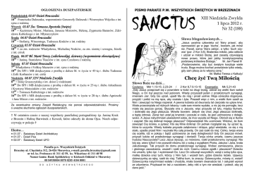 OGŁOSZENIA DUSZPASTERSKIE Poniedziałek 02.07 Dzień Powszedni 1800 Franciszka Daleszaka, wspomnienie Genowefy Daleszak i Wawrzyńca Wójcika z int. syna z rodziną Wtorek 03.07 Św. Tomasza Apostoła (święto) 1800 + Kazimierę Misior, Mariana, Janusza Misiorów, Helenę, Zygmunta Baranów, Zdzisława Kubickiego z int. Młynarczyków Środa 04.07 Dzień Powszedni 1800 + Stefanię, Wincentego, Tadeusza Kruków z int. rodziny Czwartek 05.07 Dzień Powszedni 1800 + za zm. rodziców Władysława, Michalinę Nosków, za zm. siostrę i szwagra, Józefa z int. córek Piątek 06.07 Bł. Marii Teresy Ledóchowskiej, dziewicy (wspomnienie obowiązkowe) 1800 + Janinę, Stanisława Tkaczów z int. syna Czesława z rodziną Sobota 07.07 Dzień Powszedni 700 Władysława i Feliksę Mazurów z int. syna z rodziną 1800 Do SPJ i MB dziękczynna z prośbą o dalsze bł. w życiu w 45-tą r. ślubu Tadeusza i Zofii Korbanów z int. córki Niedziela 08.07 XIV Niedziela Zwykła 800 + Irenę Gruszczyńską z int. dzieci z rodzinami 1000 Do SPJ i MB dziękczynna z prośbą o dalsze bł. w życiu w 25-tą r. ślubu Arkadiusza i Krystyny Matysiaków z int. rodziców 1200 + Tomasza Kubickiego z int. rodziców 1600 Do SPJ i MB dziękczynna z prośbą o dalsze bł. w życiu w 20-tą r. ślubu Agnieszki i Jana Misior z int. rodziców. Za ewentualne zmiany Zespół Redakcyjny nie ponosi odpowiedzialności. Prosimy o uważne słuchanie ogłoszeń duszpasterskich. † W ostatnim czasie z naszej wspólnoty parafialnej pożegnaliśmy śp. Janinę Kruk z Brzezin i Halinę Barwinek z Kowali, które odeszły do domu Ojca. Niech odpoczywają w pokoju † Ekstra… × 01.07 - Światowy Dzień Architektury × 01.07 - Dzień Psa × 02.07 - Światowy Dzień UFO Parafia p.w. Wszystkich Świętych Brzeziny ul. Chęcińska 312, 26-026 Morawica, e-mail: [email protected] nr tel. ks. Proboszcz 41 311 42 59, ks. Wikariusz 41 311 48 98 Numer konta: Bank Spółdzielczy w Kielcach Oddział w Morawicy 08 84930004 0070 0205 4104 0001 D O U Ż Y T K U W E W N Ę T R Z N E G O PISMO PARAFII P.W. WSZYSTKICH ŚWIĘTYCH W BRZEZINACH SANCTUS XIII Niedziela Zwykła 1 lipca 2012 r. Nr 32 (188) Słowa błogosławionych… „Jezus uwalnia człowieka od ‘litery prawa’, aby wprowadzić go w jego ‘ducha’, bowiem, jak mówi św. Paweł, sama ‘litera zabija’, a tylko ‘duch ożywia’ (por. 2 Kor 3,6). Braterska miłość, jako odbicie i udział w miłości Bożej, jest zasadą ożywiającą nowe prawo, które jest jakby konstytucjonalną podstawą królestwa Bożego.” /bł. Jan Paweł II/ „Postanowienie, aby być świętym kosztuje wiele trudu. Boga można kochać prawdziwie tylko wtedy, gdy sam płacę za to własną cenę.” /bł. Matka Teresa z Kalkuty/ Chcę żyć Twą Miłością Słowo Boże na dziś… Czytania: Mdr 1,13-15; 2,23-24 / 2 Kor 8,7.9.13-15 Ewangelia: Mk 5,21-43 „Gdy Jezus przeprawił się z powrotem w łodzi na drugi brzeg, zebrał się wielki tłum wokół Niego, a On był jeszcze nad jeziorem. Wtedy przyszedł jeden z przełożonych synagogi, imieniem Jair. Gdy Go ujrzał, upadł Mu do nóg i prosił usilnie: Moja córeczka dogorywa, przyjdź i połóż na nią ręce, aby ocalała i żyła. Poszedł więc z nim, a wielki tłum szedł za Nim i zewsząd na Niego napierał. A pewna kobieta od dwunastu lat cierpiała na upływ krwi. Wiele przecierpiała od różnych lekarzy i całe swe mienie wydała, a nic jej nie pomogło, lecz miała się jeszcze gorzej. Słyszała ona o Jezusie, więc przyszła od tyłu, między tłumem, i dotknęła się Jego płaszcza. Mówiła bowiem: żebym się choć Jego płaszcza dotknęła, a będę zdrowa. Zaraz też ustał jej krwotok i poczuła w ciele, że jest uzdrowiona z dolegliwości. A Jezus natychmiast uświadomił sobie, że moc wyszła od Niego. Obrócił się w tłumie i zapytał: Kto się dotknął mojego płaszcza? Odpowiedzieli Mu uczniowie: Widzisz, że tłum zewsząd Cię ściska, a pytasz: Kto się Mnie dotknął. On jednak rozglądał się, by ujrzeć tę, która to uczyniła. Wtedy kobieta przyszła zalękniona i drżąca, gdyż wiedziała, co się z nią stało, upadła przed Nim i wyznała Mu całą prawdę. On zaś rzekł do niej: Córko, twoja wiara cię ocaliła, idź w pokoju i bądź uzdrowiona ze swej dolegliwości! Gdy On jeszcze mówił, przyszli ludzie od przełożonego synagogi i donieśli: Twoja córka umarła, czemu jeszcze trudzisz Nauczyciela? Lecz Jezus słysząc, co mówiono, rzekł przełożonemu synagogi: Nie bój się, wierz tylko! I nie pozwolił nikomu iść z sobą z wyjątkiem Piotra, Jakuba i Jana, brata Jakubowego. Tak przyszli do domu przełożonego synagogi. Wobec zamieszania, płaczu i głośnego zawodzenia, wszedł i rzekł do nich: Czemu robicie zgiełk i płaczecie? Dziecko nie umarło, tylko śpi. I wyśmiewali Go. Lecz On odsunął wszystkich, wziął z sobą tylko ojca, matkę dziecka oraz tych, którzy z Nim byli, i wszedł tam, gdzie dziecko leżało. Ująwszy dziewczynkę za rękę, rzekł do niej: Talitha kum, to znaczy: Dziewczynko, mówię ci, wstań! Dziewczynka natychmiast wstała i chodziła, miała bowiem dwanaście lat. I osłupieli wprost ze zdumienia. Przykazał im też z naciskiem, żeby nikt o tym nie wiedział, i polecił, aby jej dano jeść.” A w parafii… Boży człowiek… - bł. Maria Teresa Ledóchowska ▪ Dziś na mszy św. o godz. 10.00 odbędzie się wystawienie Najświętszego Sakramentu i modlitwy na zakończenie roku szkolnego. ▪ 6 lipca przypada pierwszy piątek miesiąca. Zachęcamy do przystąpienia do sakramentu spowiedzi. ▪ W ubiegłą niedzielę o godz. 12.00 w naszym kościele ks. Dariusz Paweł Węgrzyn odprawił Mszę Świętą Prymicyjną. Oprawę muzyczną przygotowała schola parafialna. W czasie kazania ksiądz neoprezbiter nawiązał do postaci św. Jana Chrzciciela, który został powołany do głoszenia prawdy o Bogu. Podobnie zostają powołani kapłani, w tym również i on