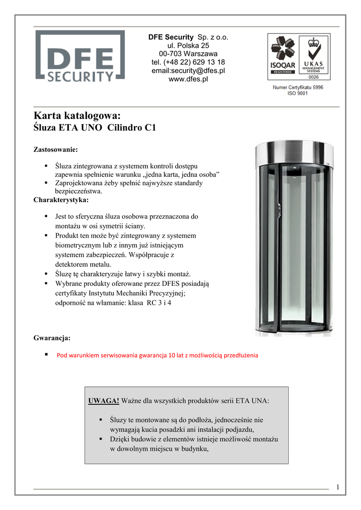 DFE Security Sp. z o.o. ul. Polska 25 00-703 Warszawa tel. (+48 22) 629 13 18 email:[email protected] www.dfes.pl Karta katalogowa: Śluza ETA UNO Cilindro C1 Zastosowanie: Śluza zintegrowana z systemem kontroli dostępu zapewnia spełnienie warunku „jedna karta, jedna osoba” Zaprojektowana żeby spełnić najwyższe standardy bezpieczeństwa. Charakterystyka: Jest to sferyczna śluza osobowa przeznaczona do montażu w osi symetrii ściany. Produkt ten może być zintegrowany z systemem biometrycznym lub z innym już istniejącym systemem zabezpieczeń. Współpracuje z detektorem metalu. Śluzę tę charakteryzuje łatwy i szybki montaż. Wybrane produkty oferowane przez DFES posiadają certyfikaty Instytutu Mechaniki Precyzyjnej; odporność na włamanie: klasa RC 3 i 4 Gwarancja: Pod warunkiem serwisowania gwarancja 10 lat z możliwością przedłużenia UWAGA! Ważne dla wszystkich produktów serii ETA UNA: Śluzy te montowane są do podłoża, jednocześnie nie wymagają kucia posadzki ani instalacji podjazdu, Dzięki budowie z elementów istnieje możliwość montażu w dowolnym miejscu w budynku, 1 DFE Security Sp. z o.o. ul. Polska 25 00-703 Warszawa tel. (+48 22) 629 13 18 email:[email protected] www.dfes.pl Zasilanie: Napięcie na wejściu 100/240 V, 50/60 Hz Zużycie energii: 350 W, 2 A Zasilanie awaryjne: 2 - 4 godzin (nie dotyczy drzwi manualnych) Silniki elektryczne: silnik elektryczny 24 V, wyposażony w hamulec elektromagnetyczny oraz czujnik ciągłości ruchu drzwi Zasilanie: 24 V Maksymalny pobór mocy: 1,2 A/h Zapobieganie wypadkom: drzwi ruchome z elektroniczną kontrolą siły zamykania, funkcją wykrycia przeszkody, laserowy czujnik podczerwieni (opcja dodatkowa) Przepustowość: 240 osób/ godz. dotyczy drzwi bez zintegrowanych systemów A.P.D, detekcji metalu lub innych. Użyte materiały: Stal, szkło, tworzywo sztuczne Sufit: panel wyposażony w oświetlenie halogenowe Podłoga: wewnątrz użyto antypoślizgowej niepalnej gumy o przemysłowej odporności na ścieranie Otwieranie awaryjne: umieszczone na zewnątrz po stronie lewej, pozwala na automatyczne lub manualne otwarcie drzwi. Typ szkła Grubość szkła mm 10-11 Standard Przybliżona waga P1A-UNI EN 356 360 Odporne na akty wandalizmu 13-14 P3A / P4A 400 Odporne na ostrzał z broni typu MAGNUM 0,351 26-27 Standard P6BEN356; BR3-UNI EN 1063 650 2 DFE Security Sp. z o.o. ul. Polska 25 00-703 Warszawa tel. (+48 22) 629 13 18 email:[email protected] www.dfes.pl Wyposażenie: Eta Uno Cilindro – pojedyncze przejście Szyby antywłamaniowe P4, P5, P6 według normy EN356 (BR zależnie od wymogów), System APD uniemożliwiający przejście przez śluzę jednocześnie więcej niż jednej osoby, Dodatkowy czujnik obecności osób, zalecany przy rozpiętości wagi pracowników od 45 -120kg, Czujnik obecności osób stosowany, gdy system APD nie jest konieczny, Integracja z systemem KD z możliwością podłączenia czytników kart, Możliwość współpracy z systemem biometrycznym, Przystosowanie urządzenia do podłączenia do systemu SWiN – 2 linie dozorowe : czujnik drzwiowy, Skrzynka na klucze ewakuacyjne monitorowana przez system SWiN, Konsola do zdalnego blokowania i odblokowania, a także ręcznego sterowania i programowania opcji dodatkowych- do obsługi przez uprawnionego pracownika, System mechaniczny – ręcznego otwierania drzwi na wypadek awarii, System automatycznego otwierania drzwi na wypadek pożaru współpracujący z systemem Ppoż zdublowany sterowaniem ręcznym przy użyciu konsoli, Zasilanie awaryjne z zapasowych baterii ( dwie baterie 12V/ 7Ah) o czasie podtrzymania funkcji, urządzenia 3-4 godziny przy pracy ciągłej, Domofon do komunikacji pomiędzy osobą w śluzie a personelem, Elektroniczny automatyczny syntezator mowy podający komunikaty w języku polskim o przyczynie odmowy dostępu ( np.: wykrycie dwóch osób) - opcja dodatkowa Automatyczne oświetlenie wnętrza śluzy. Pakiet szkolenia pracowników placówki w zakresie obsługi urządzenia. Instrukcja obsługi w języku polskim. Samoprzylepne oznakowania w języku polskim (wejście, instrukcja obsługi dla klientów, wyjście ewakuacyjne, klucz ewakuacyjny). Możliwość współpracy z detektorem metalu 3
