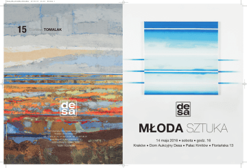 Desa_MS_okladka:Okladka 15 20-04-16 21:14 Strona 1 Stanisław TOMALAK Dom Aukcyjny Desa Dzieła Sztuki i Antyki Kraków, ul. Floriańska 13 tel. 12 422 31 14, 12 422 19 66, fax 12 422 98 91 www.desa.art.pl, [email protected] godziny otwarcia: 11.00 – 19.00 ISSN 1429-6098 MŁODA SZTUKA 14 maja 2016 • sobota • godz. 16 Kraków • Dom Aukcyjny Desa • Pałac Kmitów • Floriańska 13 Desa_MS_okladka:Okladka 51 20-04-16 21:14 Strona 2 David PATARAIA 39 Alicja KAPPA Młoda Sztuka_katalog:Desa 20-04-16 20:58 Strona 1 WSZYSTKIE CENY WYWOŁAWCZE 500 zł MŁODA SZTUKA 14 maja 2016 • sobota • godz. 16 Kraków • Dom Aukcyjny Desa • Pałac Kmitów • Floriańska 13 Wystawa przedaukcyjna od 9 maja w godz. 11-19, w dniu aukcji 10-14 Dom Aukcyjny Desa Dzieła Sztuki i Antyki, Kraków ul. Floriańska 13, tel. +48 12 422 19 66, e-mail: [email protected] katalog dostępny na www.desa.art.pl patronat honorowy: współpraca redakcyjna: Prezydent Miasta Krakowa Jacek Majchrowski patronat medialny: Izba Przemysłowo-Handlowa w Krakowie Młoda Sztuka_katalog:Desa 20-04-16 20:58 Strona 2 DESA Dzieła Sztuki i Antyki sp. z o.o. Prezes zarządu: Małgorzata Lalowicz tel. +48 12 422 27 06 e-mail: [email protected] ul. Floriańska 13 30-019 Kraków Dom Aukcyjny tel. +48 12 422 31 14 fax: +48 12 422 98 91 [email protected] www.desa.art.pl V-ce Prezes, Dyrektor Domu Aukcyjnego: Jerzy Majewski tel. +48 12 422 19 66 e-mail: [email protected] DESA Dzieła Sztuki i Antyki Sp. z o.o. jest najstarszą firmą w Polsce na rynku sztuki nieprzerwanie od 1950 roku. Prowadzi działalność handlową i kulturotwórczą, zabezpiecza cenne dzieła sztuki dla zbiorów muzealnych, prowadzi promocję dzieł sztuki współczesnej i jej twórców poprzez prezentacje wystaw w kraju i za granicą. Posiada doświadczonych i wykwalifikowanych rzeczoznawców, również biegłych sądowych wykonujących ekspertyzy, oceny i wyceny dzieł sztuki. DESA posiada salony antykwaryczne na terenie całego kraju oraz Dom Aukcyjny w Krakowie. Utrzymuje kontakty antykwaryczno kolekcjonerskie z domami aukcyjnymi w kraju i za granicą, zwłaszcza dotyczące poloników m.in. Christie's, Sotheby's, Dorotheum, Nagel, Drouot. Współpracuje w zakresie konsultacji merytorycznych z muzeami krajowymi i zagranicznymi. Firma DESA uczestniczy w programie „Leonardo da Vinci“, utworzonym w oparciu o sieć współpracy obejmującą środowiska akademickie, przedsiębiorstwa, instytucje patronackie na terenie całej Europy. DESA Dzieła Sztuki i Antyki Sp. z o.o. figuruje w wykazie Unii Europejskiej jako firma godna zaufania. Antykwariaty w Krakowie Prezes: ul. Floriańska 13 tel. +48 12 422 27 06 fax +48 12 422 98 91 Rzeczoznawcy: ul. Floriańska 13 tel. +48 12 429 12 51 Dom Aukcyjny: ul. Floriańska 13 tel. +48 12 422 19 66 +48 12 422 31 14 Salony: Salon, ul. Floriańska 13, Salon, ul. Floriańska 13, tel. +48 12 421 89 87 tel. +48 12 422 62 57 e-mail: e-mail: [email protected] [email protected] Antykwariaty w innych miastach 42-200 Częstochowa, Al. NMP 40/42, 81-395 Gdynia, ul. Abrahama 54, 40-014 Katowice, ul. Mariacka 5, 40-012 Katowice, ul. Dworcowa 13, 24-507 Kielce, ul. Sienkiewicza 28, 35-060 Rzeszów, Rynek 4, tel. 34 324-37-26 tel. 58 620-36-63 tel. 32 253-99-22 tel. 32 253-94-70 tel. 41 344-33-51 tel. 17 862-47-82 e-mail: [email protected] e-mail: [email protected] e-mail: [email protected] e-mail: [email protected] e-mail: [email protected] e-mail: [email protected] Wszystkie salony przyjmują dzieła sztuki na kolejne aukcje Młoda Sztuka_katalog:Desa 20-04-16 20:58 Strona 3 Regulamin Aukcji MŁODA SZTUKA 1. Przedmiotem aukcji są dzieła sztuki lub inne obiekty kolekcjonerskie zgłoszone do sprzedaży przez ich właścicieli. Zgodnie z oświadczeniami powierzone obiekty stanowią ich własność, bądź też mają oni prawa do rozporządzania nimi, a ponadto nie są one objęte jakimkolwiek postępowaniem sądowym i skarbowym. 2. Aukcja jest prowadzona zgodnie z polskimi przepisami prawnymi przez osobę upoważnioną zwaną dalej Aukcjonerem. 3. Aukcjoner ma prawo do dowolnego rozdzielania lub łączenia obiektów oraz do ich wycofania z licytacji bez podania przyczyn. 4. Opisy zawarte w katalogu aukcji mogą być uzupełniane lub zmienione przez Aukcjonera lub osobę przez niego wskazaną przed rozpoczęciem licytacji. 5. Do uczestnictwa w licytacji upoważniają tabliczki z numerami aukcyjnymi, które można otrzymać przy stanowisku rejestracyjnym po wypełnieniu formularza udziału w aukcji. Tabliczkę z numerem aukcyjnym należy zwrócić bezpośrednio po zakończeniu aukcji, a w przypadku zakupu odebrać potwierdzenie zawartych transakcji. 6. Dom Aukcyjny może reprezentować klienta na podstawie „zlecenia licytacji“ (formularz dostępny w siedzibie DA DESA i na stronie internetowej www.desa.art.pl). Udział w licytacji przedmiotów możliwy jest telefonicznie po uprzednim zgłoszeniu. W przypadku zlecenia licytacji z limitem, DA DESA dokłada wszelkich starań, by zakupić obiekt w możliwie najniższej cenie. 7. O wysokości postąpienia decyduje Aukcjoner, jednak zwyczajowo nie są one wyższe niż 10%. zakończenie licytacji obiektu następuje w momencie uderzenia młotkiem przez Aukcjonera i jest równoznaczne z zawarciem umowy kupna-sprzedaży między DA DESA a licytantem, który zaoferował najwyższą kwotę. W razie zaistnienia sporu w trakcie licytacji, Aukcjoner rozstrzyga spór lub ponownie przeprowadza licytację obiektu. 8. Wszystkie obiekty na aukcji MŁODA SZTUKA mają cenę wywoławczą 500 zł. Jest to zarazem cena minimalna, ponizej której DA DESA nie może sprzedać obiektu. 9. Do kwoty wylicytowanej Dom Aukcyjny dolicza opłatę aukcyjną w wysokości 15%. Kwota wylicytowana wraz z opłatą aukcyjną zawiera podatek od towarów i usług VAT. Dom aukcyjny wystawia faktury Vat marża. 10. Kupujący jest zobowiązany do zapłaty należności za wylicytowane obiekty w terminie 7 dni od dnia aukcji. Dom Au