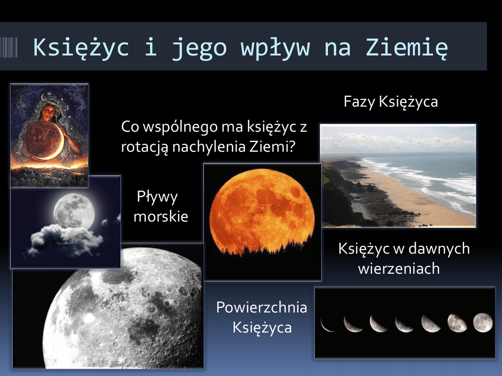 Księżyc i jego wpływ na Ziemię Fazy Księżyca Co wspólnego ma księżyc z rotacją nachylenia Ziemi? Pływy morskie Księżyc w dawnych wierzeniach Powierzchnia Księżyca