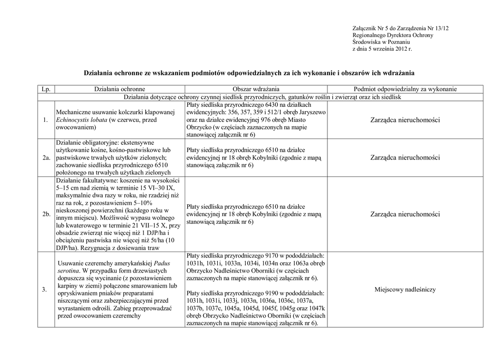Załącznik Nr 5 do Zarządzenia Nr 13/12 Regionalnego Dyrektora Ochrony Środowiska w Poznaniu z dnia 5 września 2012 r. Działania ochronne ze wskazaniem podmiotów odpowiedzialnych za ich wykonanie i obszarów ich wdrażania Lp. Działania ochronne Obszar wdrażania Podmiot odpowiedzialny za wykonanie Działania dotyczące ochrony czynnej siedlisk przyrodniczych, gatunków roślin i zwierząt oraz ich siedlisk Płaty siedliska przyrodniczego 6430 na działkach Mechaniczne usuwanie kolczurki klapowanej ewidencyjnych: 356, 357, 359 i 512/1 obręb Jaryszewo 1. Echinocystis lobata (w czerwcu, przed oraz na działce ewidencyjnej 976 obręb Miasto Zarządca nieruchomości owocowaniem) Obrzycko (w częściach zaznaczonych na mapie stanowiącej załącznik nr 6) Działanie obligatoryjne: ekstensywne użytkowanie kośne, kośno-pastwiskowe lub Płaty siedliska przyrodniczego 6510 na działce 2a. pastwiskowe trwałych użytków zielonych; ewidencyjnej nr 18 obręb Kobylniki (zgodnie z mapą Zarządca nieruchomości zachowanie siedliska przyrodniczego 6510 stanowiącą załącznik nr 6) położonego na trwałych użytkach zielonych Działanie fakultatywne: koszenie na wysokości 5–15 cm nad ziemią w terminie 15 VI–30 IX, maksymalnie dwa razy w roku, nie rzadziej niż raz na rok, z pozostawieniem 5–10% Płaty siedliska przyrodniczego 6510 na działce nieskoszonej powierzchni (każdego roku w 2b. ewidencyjnej nr 18 obręb Kobylniki (zgodnie z mapą Zarządca nieruchomości innym miejscu). Możliwość wypasu wolnego stanowiącą załącznik nr 6) lub kwaterowego w terminie 21 VII–15 X, przy obsadzie zwierząt nie więcej niż 1 DJP/ha i obciążeniu pastwiska nie więcej niż 5t/ha (10 DJP/ha). Rezygnacja z dosiewania traw Płaty siedliska przyrodniczego 9170 w pododdziałach: Usuwanie czeremchy amerykańskiej Padus 1031h, 1031i, 1033n, 1034i, 1034n oraz 1063a obręb serotina. W przypadku form drzewiastych Obrzycko Nadleśnictwo Oborniki (w częściach dopuszcza się wycinanie (z pozostawieniem zaznaczonych na mapie stanowiącej załącznik nr 6). karpiny w ziemi) połączone smarowaniem lub 3. Miejscowy nadleśniczy opryskiwaniem pniaków preparatami Płaty siedliska przyrodniczego 9190 w pododdziałach: niszczącymi oraz zabezpieczającymi przed 1031h, 1031i, 1033j, 1033n, 1036a, 1036c, 1037a, wyrastaniem odrośli. Zabieg przeprowadzać 1037b, 1037c, 1045a, 1045d, 1045f, 1045g oraz 1047k przed owocowaniem czeremchy obręb Obrzycko Nadleśnictwo Oborniki (w częściach zaznaczonych na mapie stanowiącej załącznik nr 6). Lp. Działania ochronne Obszar wdrażania Podmiot odpowiedzialny za wykonanie Płaty siedliska przyrodniczego 91I0 w pododdziałach: 1031h, 1031i, 1035l, 1041a, 1044a, 1044b, 1044f, 1044h, 1045f, 1045h, 1047c, 1047d, 1047h, 1047k, 1063a oraz 1077b obręb Obrzycko Nadleśnictwo Oborniki (w częściach zaznaczonych na mapie stanowiącej załącznik nr 6) Płaty siedliska przyrodniczego 9170 w pododdziałach: 1031h, 1031i, 1063a oraz 1068c obręb Obrzycko Nadleśnictwo Oborniki (w częściach zaznaczonych na mapie stanowiącej załącznik nr 6). 4. Całkowite usunięcie sosny zwyczajnej Pinus sylvestris, świerku pospolitego Picea abies, modrzewi Larix div. sp. oraz robinii akacjowej Robinia pseudoacacia poprzez ich wycięcie. W przypadku robinii akacjowej, po wycięciu zaleca się opryskiwać/smarować pniaki preparatami niszczącymi oraz zabezpieczającymi przed wyrastaniem odrośli. Częściowe usunięcie brzozy brodawkowatej Betula pendula (maksymalny udział 5%) oraz buka zwyczajnego Fagus sylvatica (maksymalny udział 10%) Płaty siedliska przyrodniczego 91E0 w pododdziałach: 1043k, 1044j, 1045i oraz 1046d obręb Obrzycko Nadleśnictwo Oborniki (w częściach zaznaczonych na mapie stanowiącej załącznik nr 6). Płaty siedliska przyrodniczego 91F0 w pododdziałach: 1031b, 1031d oraz 1032a obręb Obrzycko Nadleśnictwo Oborniki (w częściach zaznaczonych na mapie stanowiącej załącznik nr 6). Miejscowy nadleśniczy Płaty siedliska przyrodniczego 91I0 w pododdziałach: 1031h, 1031i, 1031j, 1032i, 1035l, 1044f, 1044h, 1045f, 1045h, 1047c, 1047h, 1047j, 1047k, 1063c, 1063d, 1067c, 1068d, 1068g, 1077b oraz 1077d obręb Obrzycko Nadleśnictwo Oborniki (w częściach zaznaczonych na mapie) 5. Stopniowa przebudowa drzewostanów w kierunku składu zgodnego z potencjalną roślinnością naturalną – odnawianie wyłącznie gatunkami liściastymi. Zalecany docelowy skład gatunkowy drzewostanów: lipa drobnolistna Tilia cordata (10–60%), grab zwyczajny Carpinus betulus (30–70%) i dąb szypułkowy Quercus robur (10–70%) Na wszystkich stanowiskach siedliska przyrodniczego 9170, z wyłączeniem pododdziałów 1032a oraz 1033c obręb Obrzycko Nadleśnictwo Oborniki; zgodnie z mapą stanowiącą załącznik nr 6 – łączna powierzchnia 7,49 ha Miejscowy nadleśniczy 6. Na wszystkich stanowiskach siedliska przyrodniczego Pozostawianie martwego drewna wydzielającego 9170, zgodnie z mapą stanowiącą załącznik nr 6 – się naturalnie łączna powierzchnia 11,99 ha. Miejscowy nadleśniczy Lp. Działania ochronne Obszar wdrażania Podmiot odpowiedzialny za wykonanie Na wszystkich stanowiskach siedliska przyrodniczego 9190, zgodnie z mapą stanowiącą załącznik nr 6 – łączna powierzchnia 46,49 ha. Na wszystkich stanowiskach siedliska przyrodniczego 91E0, zgodnie z mapą stanowiącą załącznik nr 6 – łączna powierzchnia 15,87 ha. 7. 8. Na wszystkich stanowiskach siedliska przyrodniczego 91F0, zgodnie z mapą stanowiącą załącznik nr 6 – łączna powierzchnia 3,6 ha Na wszystkich stanowiskach siedliska przyrodniczego Pozostawianie martwego drewna (nie więcej niż 91I0, zgodnie z mapą stanowiącą załącznik nr 6 – 5% miąższości drzewostanu) łączna powierzchnia 52,00 ha Płaty siedliska przyrodniczego 9170 w pododdziałach: 1032a oraz 1033c obręb Obrzycko Nadleśnictwo Oborniki (w częściach zaznaczonych na mapie stanowiącej załącznik nr