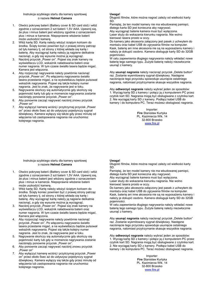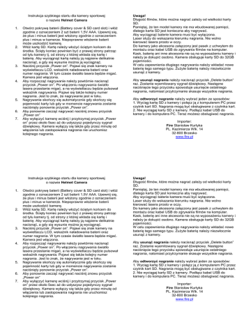 Instrukcja szybkiego startu dla kamery sportowej o nazwie Helmet Camera 1. 2. 3. 4. 5. 6. 7. Otwórz pokrywę baterii (Battery cover & SD card slot) i włóż zgodnie z oznaczeniem 2 szt baterii 1,5V AAA. Upewnij się, że plus i minus baterii jest włożony zgodnie z oznaczeniem plus i minus w kamerze. Niepoprawne włożenie baterii może uszkodzić kamerę. Włóż kartę SD. Kartę należy włożyć ściętym końcem do środka. Ścięty koniec powinien być z prawej strony patrząc od tyłu kamery tj. od strony z której wkłada się kartę i baterię. Aby wyciągnąć kartę należy ją najpierw delikatnie nacisnąć, a gdy się wysunie można ją wyciągnąć. Naciśnij przycisk „Power on”. Pojawi się znak kamery na wyświetlaczu LCD, wskaźnik naładowania baterii oraz numer nagrania. W tym czasie światło lasera będzie migać. Kamera jest włączona. Aby rozpocząć nagrywanie należy powtórnie nacisnąć przycisk „Power on”. Po włączeniu nagrywania światło lasera przestanie migać, a na wyświetlaczu będzie pulsował wskaźnik nagrywania. Pojawi się także kolejny numer nagrania. Jest to znak, że nagrywanie jest w toku. Nagrywanie skończy się automatycznie gdy skończy się pojemność karty lub gdy w momencie nagrywania zostanie naciśnięty ponownie przycisk „Power on”. Aby ponownie zacząć nagrywać naciśnij znowu przycisk „Power on” Aby wyłączyć kamerę wciśnij i przytrzymaj przycisk „Power on” przez około 5sec aż do usłyszysz pojedynczy sygnał dźwiękowy. Kamera wyłączy się także gdy przez minutę od włączenia lub zastopowania nagrania nie uruchomisz kolejnego nagrania. Instrukcja szybkiego startu dla kamery sportowej o nazwie Helmet Camera 1. 2. 3. 4. 5. 6. 7. Otwórz pokrywę baterii (Battery cover & SD card slot) i włóż zgodnie z oznaczeniem 2 szt baterii 1,5V AAA. Upewnij się, że plus i minus baterii jest włożony zgodnie z oznaczeniem plus i minus w kamerze. Niepoprawne włożenie baterii może uszkodzić kamerę. Włóż kartę SD. Kartę należy włożyć ściętym końcem do środka. Ścięty koniec powinien być z prawej strony patrząc od tyłu kamery tj. od strony z której wkłada się kartę i baterię. Aby wyciągnąć kartę należy ją najpierw delikatnie nacisnąć, a gdy się wysunie można ją wyciągnąć. Naciśnij przycisk „Power on”. Pojawi się znak kamery na wyświetlaczu LCD, wskaźnik naładowania baterii oraz numer nagrania. W tym czasie światło lasera będzie migać. Kamera jest włączona. Aby rozpocząć nagrywanie należy powtórnie nacisnąć przycisk „Power on”. Po włączeniu nagrywania światło lasera przestanie migać, a na wyświetlaczu będzie pulsował wskaźnik nagrywania. Pojawi się także kolejny numer nagrania. Jest to znak, że nagrywanie jest w toku. Nagrywanie skończy się automatycznie gdy skończy się pojemność karty lub gdy w momencie nagrywania zostanie naciśnięty ponownie przycisk „Power on”. Aby ponownie zacząć nagrywać naciśnij znowu przycisk „Power on” Aby wyłączyć kamerę wciśnij i przytrzymaj przycisk „Power on” przez około 5sec aż do usłyszysz pojedynczy sygnał dźwiękowy. Kamera wyłączy się także gdy przez minutę od włączenia lub zastopowania nagrania nie uruchomisz kolejnego nagrania. Uwaga! Długość filmów, które można nagrać zależy od wielkości karty SD. Pamiętaj, że ten model kamery nie ma wbudowanej pamięci, dlatego karta SD jest konieczna aby nagrywać. Aby wyciągnąć baterie kamera musi być wyłączona. Laser służy do wskazania kierunku nagrania. Nie wolno kierować lasera prosto w oczy. Do kamery jako akcesoria załączony jest pasek z uchwytem do montażu oraz kabel USB do zgrywania filmów na komputer. Kask, baterię ani inne akcesoria nie są na wyposażeniu kamery i należy je dokupić osobno. Kamera obsługuje karty SD do 32GB pojemności. W celu zapewnienia długiego nagrywania należy wkładać nowe baterię tego samego typu. Zużyte baterię należy niezwłocznie usunąć z kamery. Aby usunąć nagrania należy nacisnąć przycisk „Delete button” raz. Zostanie wyemitowany sygnał dźwiękowy. Następne naciśnięcie tego przycisku spowoduje usunięcie ostatniego nagrania, natomiast przytrzymanie skasuje wszystkie nagrania. Aby odtworzyć nagranie należy wybrać jeden ze sposobów: 1. Wyciąg kartę SD z kamery i połącz ją z komputerem PC przez czytnik kart SD. Nagrania mogą być obsługiwane z czytnika kart. 2. Nie wyciągaj karty SD z kamery. Podłącz kabel USB do kamery i do komputera PC. Teraz możesz obsługiwać nagrania. Importer: Fire Stanisław Kurtyka PL. Kazimierza Wlk. 14 32-800 Brzesko www.fire.pl Uwaga! Długość filmów, które można nagrać zależy od wielkości karty SD. Pamiętaj, że ten model kamery nie ma wbudowanej pamięci, dlatego karta SD jest konieczna aby nagrywać. Aby wyciągnąć baterie kamera musi być wyłączona. Laser służy do wskazania kierunku nagrania. Nie wolno kierować lasera prosto w oczy. Do kamery jako akcesoria załączony jest pasek z uchwytem do montażu oraz kabel USB do zgrywania filmów na komputer. Kask, baterię ani inne akcesoria nie są na wyposażeniu kamery i należy je dokupić osobno. Kamera obsługuje karty SD do 32GB pojemności. W celu zapewnienia długiego nagrywania należy wkładać nowe baterię tego samego typu. Zużyte baterię należy niezwłocznie usunąć z kamery. Aby usunąć nagrania należy nacisnąć przycisk „Delete button” raz. Zostanie wyemitowany sygnał dźwiękowy. Następne naciśnięcie tego przycisku spowoduje usunięcie ostatniego nagrania, natomiast przytrzymanie skasuje wszystkie nagrania. Aby odtworzyć nagranie należy wybrać jeden ze sposobów: 1. Wyciąg kartę SD z kamery i połącz ją z komputerem PC przez czytnik kart SD. Nagrania mogą być obsługiwane z czytnika kart. 2. Nie wyciągaj karty SD z kamery. Podłącz kabel USB do kamery i do komputera PC. Teraz możesz o
