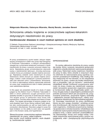 ARCH. MED. SĄD. KRYM., 2006, LVI, 91-94 PRACE ORYGINALNE Małgorzata Mizerska, Katarzyna Mizerska, Maciej Barzdo, Jarosław Berent Schorzenia układu krążenia w orzecznictwie sądowo-lekarskim dotyczącym niezdolności do pracy Cardiovascular diseases in court medical opinions on work disability Z Zakładu Orzecznictwa Sądowo-Lekarskiego i Ubezpieczeniowego Katedry Medycyny Sądowej Uniwersytetu Medycznego w Łodzi Kierownik: dr hab. n. med. Jarosław Berent, prof. nadzw. W pracy przedstawiono wyniki badań, którymi objęto sprawy prowadzone w 2004 roku przez Sąd Okręgowy w Piotrkowie Trybunalskim, w których wnioskodawcy ubiegali się o przyznanie świadczeń rentowych z tytułu niezdolności do pracy z powodu schorzeń układu krążenia. Największą grupę wnioskodawców stanowiły osoby z nadciśnieniem tętniczym, chorobą wieńcową, a także chorzy po przebytym zawale mięśnia sercowego. Największy odsetek osób niezdolnych do pracy stwierdzono wśród chorych po zawale mięśnia sercowego, a także u osób cierpiących z powodu kardiomiopatii oraz zaburzeń rytmu i przewodzenia. Schorzeniami, które w najmniejszym stopniu ograniczały zdolność do pracy były niespecyficzne bóle w klatce piersiowej oraz nadciśnienie tętnicze. In this paper are presented results of a study of cases judged by the District Court in Piotrków Trybunalski in 2004 in which petitioners sought permanent workdisability benefits on grounds of cardiovascular disease. The largest group of petitioners were those with hypertension, coronary artery disease and history of heart attack. The largest percentage of persons judged to be work-disabled were those having suffered heart attack, but also cardiomyopathy as well as heart-rhythm and conduction disturbances. Disorders judged to pose the least limitation on the ability to work were non-specific pain in the thoracic cavity, and hypertension. Słowa kluczowe: orzecznictwo sądowo-lekarskie, niezdolność do pracy, układ krążenia Key words: court medical opinion, work disability, cardiovascular system WPROWADZENIE Za osobę całkowicie niezdolną do pracy uważa się osobę, która z powodu naruszenia sprawności organizmu utraciła zdolność wykonywania jakiejkolwiek pracy. Natomiast osoba częściowo niezdolna do pracy to taka, która utraciła w znacznym stopniu zdolność do wykonywania pracy zgodnej z poziomem posiadanych kwalifikacji. Gdy według wiedzy medycznej nie ma rokowań, co do odzyskania zdolności do pracy, orzeka się trwałą niezdolność, zaś w przypadku, gdy po leczeniu i ewentualnej rehabilitacji istnieje możliwość przywrócenia zdolności do pracy orzeka się niezdolność czasową. Jeżeli naruszenie sprawności organizmu powoduje konieczność stałej lub długotrwałej opieki i pomocy drugiej osoby w zaspokajaniu podstawowych potrzeb życiowych takich jak poruszanie się, przyjmowanie pokarmów, utrzymanie higieny osobistej i załatwianie potrzeb fizjologicznych, należy przyjąć istnienie niezdolności do samodzielnej egzystencji. Oceniając niezdolność do pracy zarobkowej bierze się pod uwagę charakter i przebieg procesów chorobowych, jak również ich wpływ na sprawność organizmu, możliwość przywrócenia niezbędnej sprawności w drodze leczenia i rehabilitacji oraz możliwość wykonywania dotychczasowej pracy lub podjęcia innej, a także celowość przekwalifikowania zawodowego, biorąc pod uwagę rodzaj i charakter dotychczas wykonywanej pracy, poziom wykształcenia, wiek i predyspozycje psychofizyczne [1-3]. 92 Małgorzata Mizerska, Katarzyna Mizerska, Maciej Barzdo, Jarosław Berent Nr 2 dawców było 209 mężczyzn (65%) i 110 kobiet (35%). Osoby starające się o świadczenie rentowe z tytułu niezdolności do pracy z powodu schorzeń kardiologicznych posiadały bardzo zróżnicowane zawody, choć w zdecydowanej większości byli to pracownicy fizyczni. W części przypadków u wnioskodawców – oprócz schorzeń kardiologicznych – współistniały także inne schorzenia, głównie neurologiczne, a w pojedynczych przypadkach także cukrzyca oraz schorzenia pulmonologiczne, onkologiczne, ortopedyczne i hematologiczne, każdorazowo oceniane przez biegłych z danej dziedziny medycyny. Największą grupę ubiegających się o świadczenia rentowe stanowili chorzy z nadciśnieniem tętniczym – 140 osób (44%). Spośród nich 118 osób ubiegało się o ustalenie niezdolności do pracy, a 22 osoby o ustalenie niezdolności do samodzielnej egzystencji. Nadciśnienie tętnicze jest rozpoznawane u osób, u których w dwukrotnie przeprowadzonych pomiarach po 10 minutach przebywania w pozycji siedzącej stwierdza się ciśnienie skurczowe równe lub wyższe od 140 mm Hg i/lub ciśnienie rozkurczowe równe lub wyższe od 90 mm Hg. Poza samymi wartościami ciśnienia tętniczego istotny jest stopień zaawansowania choroby, którego wykładnikami są przerost lewej komory mięśnia sercowego, zmiany naczyniowe na dnie oka, białkomocz, podwyższony poziomu kreatyniny oraz obecność powikłań w przebiegu zaawansowanych zmian naczyniowych, takich jak niewydolność krążenia, zawał mięśnia sercowego, niewydolność nerek, schorzenia neurologiczne [4]. CEL PRACY Celem pracy było analiza spraw sądowych, w których wnioskodawcy ubiegali się o przyznanie świadczeń rentowych z tytułu niezdolności do pracy oraz niezdolności do samodzielnej egzystencji z powodu schorzeń układu krążenia oraz zbadanie częstości występowania poszczególnych chorób w tego typu przypadkach. MATERIAŁ I METODY Badaniem objęto sprawy prowadzone przez Sąd Okręgowy w Piotrkowie Trybunalskim w 2004 roku. Z tego okresu wybrano i poddano dalszej analizie te sprawy, które dotyczyły schorzeń kardiologicznych, które stanowiły około 30% wszystkich spraw tego typu. Analizie takiej poddano łącznie 319 spraw. Były one opiniowane przez jednego biegłego, a więc według jednolitych kryteriów. Poczynione spostrzeż