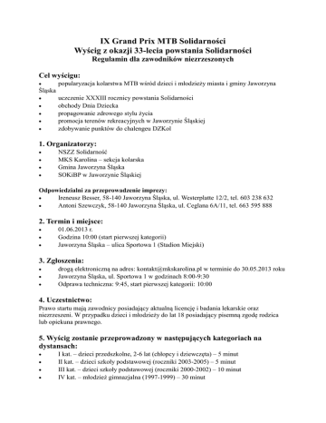 IX Grand Prix MTB Solidarności Wyścig z okazji 33-lecia powstania Solidarności Regulamin dla zawodników niezrzeszonych Cel wyścigu: popularyzacja kolarstwa MTB wśród dzieci i młodzieży miasta i gminy Jaworzyna Śląska uczczenie XXXIII rocznicy powstania Solidarności obchody Dnia Dziecka propagowanie zdrowego stylu życia promocja terenów rekreacyjnych w Jaworzynie Śląskiej zdobywanie punktów do chalengeu DZKol 1. Organizatorzy: NSZZ Solidarność MKS Karolina – sekcja kolarska Gmina Jaworzyna Śląska SOKiBP w Jaworzynie Śląskiej Odpowiedzialni za przeprowadzenie imprezy: Ireneusz Besser, 58-140 Jaworzyna Śląska, ul. Westerplatte 12/2, tel. 603 238 632 Antoni Szewczyk, 58-140 Jaworzyna Śląska, ul. Ceglana 6A/11, tel. 663 595 888 2. Termin i miejsce: 01.06.2013 r. Godzina 10:00 (start pierwszej kategorii) Jaworzyna Śląska – ulica Sportowa 1 (Stadion Miejski) 3. Zgłoszenia: drogą elektroniczną na adres: [email protected] w terminie do 30.05.2013 roku Jaworzyna Śląska, ul. Sportowa 1 w godzinach 8:00-9:30 Odprawa techniczna: 9:45, start pierwszej kategorii: 10:00 4. Uczestnictwo: Prawo startu mają zawodnicy posiadający aktualną licencję i badania lekarskie oraz niezrzeszeni. W przypadku dzieci i młodzieży do lat 18 posiadający pisemną zgodę rodzica lub opiekuna prawnego. 5. Wyścig zostanie przeprowadzony w następujących kategoriach na dystansach: I kat. – dzieci przedszkolne, 2-6 lat (chłopcy i dziewczęta) – 5 minut II kat. – dzieci szkoły podstawowej (roczniki 2003-2005) – 5 minut III kat. – dzieci szkoły podstawowej (roczniki 2000-2002) – 10 minut IV kat. – młodzież gimnazjalna (1997-1999) – 30 minut cyklosport mężczyźni (1984- 1995)- 45 minut VI kat. – masters, 30 lat i starsi open (1983 i starsi) – 45 minut VII kat. – kobiety open, 15 lat i starsze (1998 i starsze) 6. Sprawy sprzętowe: Do wyścigu zostaną dopuszczeni zawodnicy posiadający sprawny technicznie rower górski MTB zgodny z przepisami PZKol oraz kask ochronny sztywny. 7. Nagrody i zasady finansowania: Koszty organizacji imprezy w tym nagród ponoszą organizatorzy i sponsorzy. Koszty udziału (opłaty startowe) opłacają kluby lub zawodnicy indywidualnie według stawek PZKol. Trzech pierwszych zawodników otrzymuje nagrody rzeczowe i medale. Dyplomu otrzymuje pierwszych pięciu zawodników w każdej kategorii. Uwaga! Ilość wypłacanych nagród uzależniona jest od ilości startujących zawodników w danej kategorii wiekowej tzn: w przypadku startu w danej kategorii wiekowej mniej niż pięciu zawodników, nagrodę otrzymuje tylko zwycięzca, a pozostali dyplomy i medale, nagrody pocieszenia. Wysokość opłat startowych kategorii zawodników niezrzeszonych: • dzieci i młodzież do lat 17 bez opłat cyklosport mężczyzn: 18-29 lat (urodzeni 1995-1984) – opłata 10 złotych masters: 30 lat i starsi open (urodzeni 1983 i starsi) – opłata 20 złotych kobiety open: 15 lat i starsze (urodzone 1998 i starsze) – opłata 10 złotych 8. Sponsorzy: Gmina Jaworzyna Śląska Starostwo Powiatowe w Świdnicy NSZZ Solidarność przy ZPS Karolina MKS Karolina Stowarzyszenie Kultury Fizycznej i Sportu NSZZ Solidarność na dolnym śląsku SOKiBP w Jaworzynie Śląskiej Sponsorzy indywidualnie 9. Komisja sędziowska: skład komisji sędziowskiej wyznaczy DZKol Wrocław na wniosek organizatorów 10. Postanowienia końcowe: wyścig zostanie przeprowadzony zgodnie z przepisami PZKol i niniejszym regulaminem wyścig zostanie przeprowadzony bez względu na warunki atmosferyczne zaginione rzeczy i sprzęt pozostawiony podczas trwania zawodów oraz niezawinione przez organizatora wypadki - organizator nie ponosi odpowiedzialności organizator zastrzega sobie prawo do ewentualnych zmian w programie wyścigu w porozumieniu z sędzią głównym w przypadku małej ilości startujących zawodników w danej kategorii wiekowej organizator zastrzega sobie prawo do zmniejszenia puli nagród opiekę medyczną zapewnia organizator zawodnicy startują na własną odpowiedzialność i tylko w jednej kategorii wiekowej startowe według stawek PZKol zawodnicy odbierający nagrody muszą posiadać swój numer NIP i PESEL zawodnik ma obowiązek zapoznać się z trasą wyścigu przed jego rozpoczęciem zabrania się rozgrzewania na trasie wyścigu w trakcie rozgrywania wyścigów innych kategorii dla zawodników przewidziany jest posiłek regeneracyjny ustala się możliwość łączenia startu kilku grup wiekowych wszyscy zawodnicy zobowiązani są do bezwzględnego przestrzegania zaleceń służb porządkowych szpital dyżurny: Samodzielny Publiczny Zespół Opieki Zdrowotnej w Świdnicy RSS Latawiec w Świdnicy ul. Leśna 27-29 58-140 Świdnica tel. 74 851 7100 11. Program minutowy IX Grand Prix MTB Solidarności: 8:00-9:30 9:45 10:30 12:15 14.00 14:45 15:15 Przyjmowanie zgłoszeń Odprawa techniczna Start kat. młodzieży gimnazjalnej oraz kobiety open Start kat. masters i cyklosport mężczyzn Start przedszkolaki i dzieci szkoły podstawowej Zakończenie wyścigu Wręczenie nagród