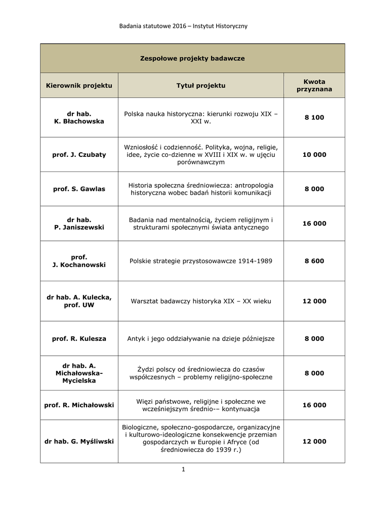 Badania statutowe 2016 – Instytut Historyczny Zespołowe projekty badawcze Kierownik projektu Tytuł projektu Kwota przyznana dr hab. K. Błachowska Polska nauka historyczna: kierunki rozwoju XIX – XXI w. 8 100 prof. J. Czubaty Wzniosłość i codzienność. Polityka, wojna, religie, idee, życie co-dzienne w XVIII i XIX w. w ujęciu porównawczym 10 000 prof. S. Gawlas Historia społeczna średniowiecza: antropologia historyczna wobec badań historii komunikacji 8 000 dr hab. P. Janiszewski Badania nad mentalnością, życiem religijnym i strukturami społecznymi świata antycznego 16 000 prof. J. Kochanowski Polskie strategie przystosowawcze 1914-1989 8 600 dr hab. A. Kulecka, prof. UW Warsztat badawczy historyka XIX – XX wieku 12 000 prof. R. Kulesza Antyk i jego oddziaływanie na dzieje późniejsze 8 000 dr hab. A. MichałowskaMycielska Żydzi polscy od średniowiecza do czasów współczesnych – problemy religijno-społeczne 8 000 prof. R. Michałowski Więzi państwowe, religijne i społeczne we wcześniejszym średnio-– kontynuacja 16 000 dr hab. G. Myśliwski Biologiczne, społeczno-gospodarcze, organizacyjne i kulturowo-ideologiczne konsekwencje przemian gospodarczych w Europie i Afryce (od średniowiecza do 1939 r.) 12 000 1 Badania statutowe 2016 – Instytut Historyczny prof. M. Nagielski Wpływy Zachodu i Wschodu na staropolską sztukę wojenną w XVI – XVIII w. 10 900 dr M. Ptaszyński Kultury pisma i tradycje intelektualne w Koronie i Wielkim Księstwie Litewskim w XV – XVIII w. 19 000 dr hab. P. Skibiński Między ołtarzem a tronem. Polityka i religia w Europie XX w. 10 000 prof. A. Szwarc Główne kierunki modernizacji społecznej na ziemiach polskich w XIX-XX wieku na tle porównawczym. Przemiany ról społecznych kobiet 11 800 prof. R. Turkowski Wieś w Europie Środkowowschodniej i na terenie ZSRR w świetle źródeł archiwalnych, mediów oraz historiografii (1944-1956) 6 000 dr. hab. Piotr Węcowski Król a poddani w Polsce Jagiellonów i Wazów 6 000 prof. A. Ziółkowski Wizje przeszłości w starożytności 12 000 RAZEM 182 400 Publikacje w ramach BSt. prof. M. Karpińskiej Publikacje Przyznano prof. A. Bartoszewicz/ dr M. Ptaszyński Loca scribendi. Miejsca i środowiska tworzące kulturę pisma w dawnej Rzeczypospolitej XVXVIII stulecia 4 900 dr K. Bobiatyński W walce o hegemonię. Rywalizacja polityczna w Wielkim Księstwie Litewskim w latach 1667-1674 5 000 2 Badania statutowe 2016 – Instytut Historyczny dr D. Kałwa Refleksja metodologiczna nad „oral history” 5 000 prof. J. Kochanowski Through the Back Door. The Black Market in Poland 1944-1989 5 000 dr P. Kroll Elita kozacka w poszukiwaniu własnego państwa. Ukraina w latach 1660-1676 5 000 dr hab. A. Kulecka Archiwa Polski i Europy: wspólne dziedzictwo – różne doświadczenia 3 421 prof. R. Kulesza Akme. Studia historica 6 000 dr A. Markowski Pogrom białostocki 1906 r. Wyobrażenia społeczne a praktyka przemocy zbiorowej w Rosji początku XX wieku 5 000 dr M. Ptaszyński Andrzej Frycz-Modrzewski. Reformacja w Polsce a późny humanizm 3 000 dr hab. Ł. NiesiołowskiSpano Palamedes 5 000 Scripta Biblica et Orientalia 1 800 Przegląd Historyczny 9 000 dr hab. P. Węcowski Aleksander Gieysztor. Człowiek i dzieło 5 000 dr hab. R. Wiśniewski U schyłku starożytności. Studia Źródłoznawcze 3 000 dr hab. M. Wojtyński Świadkowie dziejów. Relacje rejestrowane dla Telewizji Polskiej 3879 dr hab. Ł. NiesiołowskiSpano 3 Badania statutowe 2016 – Instytut Historyczny Konferencje w ramach BSt prof. M. Karpińskiej Konferencje Przyznano prof. A. Bartoszewicz Warsztat podsumowujący działanie ZHKS w 2016 r. 1 000 dr hab. K. Błachowska Perspektywy historii mówionej w kształceniu uniwersyteckim 600 prof. M. Karpińska I Ogólnopolska konferencja historyków XIX wieku 6 000 prof. A. Kulecka Gieysztoriana. Aleksander Gieysztor i środowisko naukowe Warszawy. Konferencja z cyklu Warszawska Jesień Archiwalna 2 000 prof. A. Kulecka Gieysztoriana. Dni pamięci Aleksandra Gieysztora 2 000 prof. R. Kulesza Badania nad historią starożytną w Polsce 535 dr hab. Ł. NiesiołowskiSpanò XI Sympozjum naukowe: Starożytny Bliski Wschód i jego dziedzictwo 1 500 dr M. Ptaszyński Warsztat podsumowujący działanie ZHKS w 2016 r. 1 000 dr hab. P. Skibiński Między historią a historią religijności. Nowe perspektywy badawcze dziejów Kościoła w XX wieku 6 250 prof. A. Szwarc Seminarium im. Prof. Anny Żarnowskiej. Biografie kobiet jako przedmiot badań historycznych 2 000 prof. A. Szwarc Seminarium warsztatowe: artefakt jako hasło. Koncepcja słownika historii kobiet na ziemiach polskich od końca XVIII do końca XX wieku 1 000 Badania statutowe Instytutu Historycznego w 2016 r. Zespołowe projekty badawcze 182 400 prof. M. Karpińska Biblioteka 75000. Rezerwa na wydatki wspólne IH Dofinansowanie konferencji i publikacji IH. Rezerwa na wydatki wspólne IH. dr hab. K. Skwierczyński Sprawy studenckie. Rezerwa na wydatki wspólne IH 35 000 dr hab. J. Pysiak Sprawy zagraniczne 30 000 prof. D. Kołodziejczyk 100 000 148 068 495 468 RAZEM 4