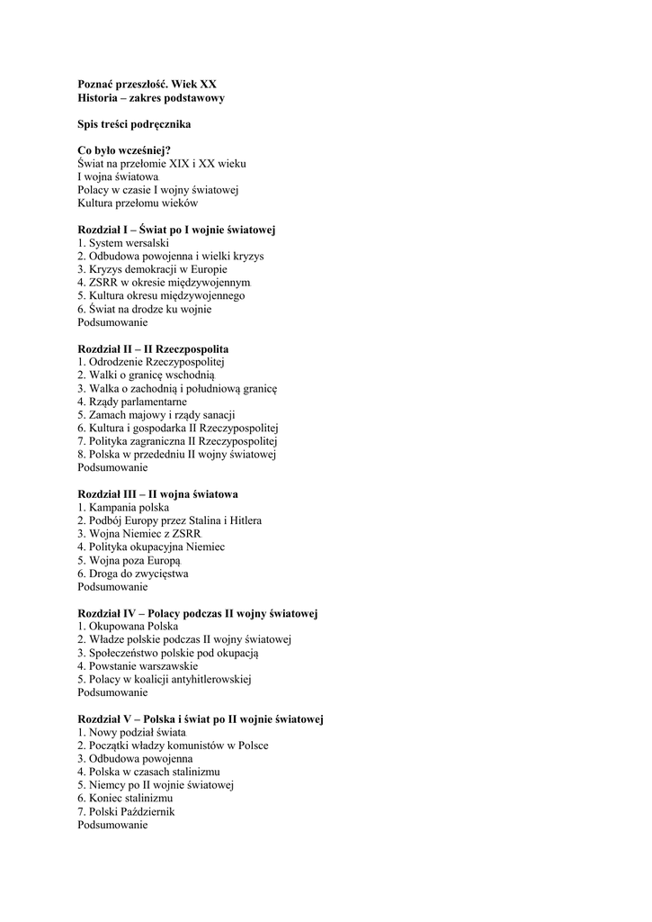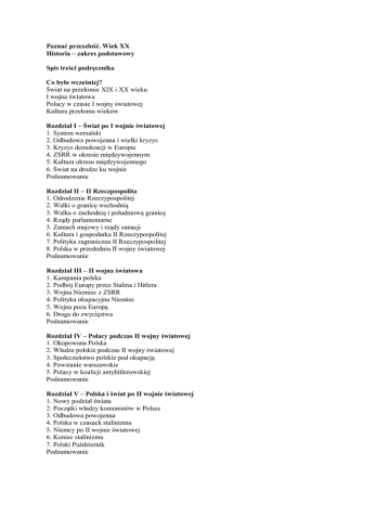 Poznać przeszłość. Wiek XX Historia – zakres podstawowy Spis treści podręcznika Co było wcześniej? Świat na przełomie XIX i XX wieku I wojna światowa. Polacy w czasie I wojny światowej Kultura przełomu wieków Rozdział I – Świat po I wojnie światowej 1. System wersalski 2. Odbudowa powojenna i wielki kryzys 3. Kryzys demokracji w Europie 4. ZSRR w okresie międzywojennym. 5. Kultura okresu międzywojennego 6. Świat na drodze ku wojnie Podsumowanie Rozdział II – II Rzeczpospolita 1. Odrodzenie Rzeczypospolitej 2. Walki o granicę wschodnią. 3. Walka o zachodnią i południową granicę 4. Rządy parlamentarne 5. Zamach majowy i rządy sanacji 6. Kultura i gospodarka II Rzeczypospolitej 7. Polityka zagraniczna II Rzeczypospolitej 8. Polska w przededniu II wojny światowej Podsumowanie Rozdział III – II wojna światowa 1. Kampania polska 2. Podbój Europy przez Stalina i Hitlera 3. Wojna Niemiec z ZSRR. 4. Polityka okupacyjna Niemiec 5. Wojna poza Europą. 6. Droga do zwycięstwa Podsumowanie Rozdział IV – Polacy podczas II wojny światowej 1. Okupowana Polska 2. Władze polskie podczas II wojny światowej 3. Społeczeństwo polskie pod okupacją 4. Powstanie warszawskie 5. Polacy w koalicji antyhitlerowskiej Podsumowanie Rozdział V – Polska i świat po II wojnie światowej 1. Nowy podział świata. 2. Początki władzy komunistów w Polsce 3. Odbudowa powojenna 4. Polska w czasach stalinizmu 5. Niemcy po II wojnie światowej 6. Koniec stalinizmu 7. Polski Październik Podsumowanie Rozdział VI – Polska i świat w II połowie XX wieku 1. Droga ku wspólnej Europie 2. Daleki Wschód po II wojnie światowej 3. Rozpad systemu kolonialnego 4. Konflikty na Bliskim Wschodzie. 5. Blok wschodni w latach 60. i 70. 6. Przemiany społeczne i kulturowe lat 60. 7. Mała stabilizacja 8. Rządy Edwarda Gierka Podsumowanie Rozdział VII – Upadek komunizmu – świat w nowej epoce 1. Kryzys i upadek komunizmu w Europie 2. Polska droga do wolności 3. Polska po 1989 roku 4. Europa i świat na przełomie XX i XXI wieku 5. Wyzwania współczesnego świata Podsumowanie Tablice chronologiczne Indeks