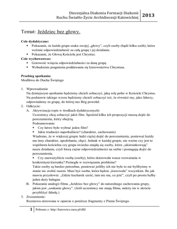 Diecezjalna Diakonia Formacji Diakonii Ruchu Światło-Życie Archidiecezji Katowickiej 2013 Temat: Jeździec bez głowy. Cele dydaktyczne: Pokazanie, że każda grupa szuka swojej „głowy”, czyli osoby (bądź kilku osób), która weźmie odpowiedzialność za całą grupę i jej działania. Pokazanie, że Głową Kościoła jest Chrystus. Cele wychowawcze: Gotowość wzięcia odpowiedzialności za daną grupę. Wzbudzenie pragnienia poddawania się kierownictwu Chrystusa. Przebieg spotkania: Modlitwa do Ducha Świętego 1. Wprowadzenie Na dzisiejszym spotkaniu będziemy chcieli zobaczyć, jaką rolę pełni w Kościele Chrystus. Na podstawie takiego wzoru będziemy chcieli zobaczyć też, że również my, jako liderzy, odpowiadamy za grupę, do której nas Bóg powołał. 2. Odkrycie: A. Aktywizacja (opis w środkach dydaktycznych) Uczestnicy chcą zobaczyć jakiś film. Spośród kilku ich propozycji muszą dojść do porozumienia, który obejrzą. Podsumowanie: Czy łatwo było wybrać jeden film? Jakie trudności napotkaliście? (charakter, zachowanie) Wiadomo, że w większej grupie ludzi ciężej dojść do porozumienia, ponieważ każdy ma inny charakter, upodobania, chęci. Jednak w każdej grupie, nie ważne czy jest to wspólnota kościelna czy grupa świecka znajdą się osoby, które „ukierunkowują” nasze działania, czyli biorą ciężar odpowiedzialności na siebie i pomagają dojść do porozumienia. Czy zauważyliście osobę (osoby), która skierowała wasze rozważania w konkretnym kierunku? Pomogła w rozwiązaniu problemu? Takie osoby są bardzo potrzebne, ponieważ jeśliby ich nie było to nie bylibyśmy w stanie nic zrobić razem. Musi być osoba, która będzie „kierowała” wszystkim. Bo jak mawia przysłowie: „Gdzie kucharek sześć, tam nie ma, co jeść”, czyli po prostu byłby jeden duży bałagan. B. Pokazanie analogii filmu „Jeździec bez głowy” do naturalnego zachowania grupy, jakim jest „szukanie głowy”. (Jeśli uczestnicy nie znają filmu, należy im w skrócie przybliżyć fabułę.) 3. Zrozumienie: Rozmowa sterowana w oparciu o poniższe fragmenty z Pisma Świętego. 1 Pobrano z: http://katowice.oaza.pl/dfd Diecezjalna Diakonia Formacji Diakonii Ruchu Światło-Życie Archidiecezji Katowickiej 2013 A. 1 Kor 12, 12-14 Jedno ciało – Kościół, składające się z wielu członków – wiernych, którego spoiwem jest Chrystus. B. Ef 1, 22-23 Chrystus – Głowa Kościoła, Kościół Ciało Chrystusa, w którym działa Jego łaska. C. J 15, 1-9 Zjednoczenie z Chrystusem, trwanie w Jego nauce i miłości, przyniesienie owocu, stanie się uczniami Jezusa. 4. Zastosowanie: A. Krótkie dzielenie dotyczące tego, w jaki sposób możemy odnieść te wnioski do naszego życia. B. Propozycja postanowienia: W najbliższym czasie podjąć się wzięcia odpowiedzialności na siebie za jakąś rzecz. Modlitwa w intencji, aby nigdy nie zabrakło odpowiedzialnych ludzi, którzy nie boją się pokierować daną grupą. 5. Modlitwa na zakończenie – rozważanie wybranej tajemnicy Różańca 2 Pobrano z: http://katowice.oaza.pl/dfd