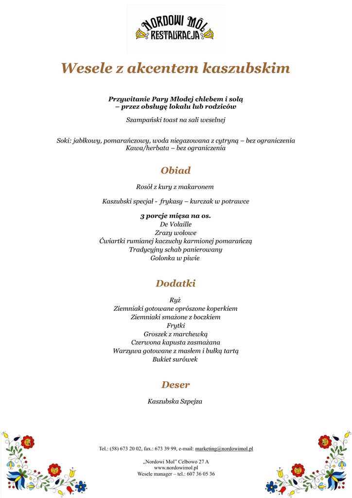 Wesele z akcentem kaszubskim Przywitanie Pary Młodej chlebem i solą – przez obsługę lokalu lub rodziców Szampański toast na sali weselnej Soki: jabłkowy, pomarańczowy, woda niegazowana z cytryną – bez ograniczenia Kawa/herbata – bez ograniczenia Obiad Rosół z kury z makaronem Kaszubski specjał - frykasy – kurczak w potrawce 3 porcje mięsa na os. De Volaille Zrazy wołowe Ćwiartki rumianej kaczuchy karmionej pomarańczą Tradycyjny schab panierowany Golonka w piwie Dodatki Ryż Ziemniaki gotowane oprószone koperkiem Ziemniaki smażone z boczkiem Frytki Groszek z marchewką Czerwona kapusta zasmażana Warzywa gotowane z masłem i bułką tartą Bukiet surówek Deser Kaszubska Szpejza Tel.: (58) 673 20 02, fax.: 673 39 99, e-mail: [email protected] „Nordowi Mol” Celbowo 27 A www.nordowimol.pl Wesele manager – tel.: 607 36 05 36 Ciasta: Puszysty sernik Soczysty jabłecznik Owocowe z galaretką Snickers Kokosanka z ananasem Tort weselny Zakąski zimne i specjały z naszej wędzarni i spiżarni: Platery swojskich wędlin (wyrób własny restauracji): Kiełbasa polska , kiełbasa nordowa , kiełbasa niedźwiedzia , kiełbasa z kija , szynka wędzona na surowo , pasztet drobiowy , zylc , ogórki kiszone , smalec Platery ryb wędzonych (wyrób własny restauracji): Łosoś na zimno wędzony , węgorz wędzony , pstrąg wędzony Pstrąg tęczowy w galarecie Śledzik w oleju z cebulką i ogórkiem Sałata jarzynowa w otulinie szynki Kruche babeczki z pastą pomidorową i chorizo Pieczona rolada z gęsi z żurawiną Polędwica wieprzowa faszerowana grzybami leśnymi Szmurowana wieprzowina nadziewana boczkiem wędzonym Barszcz czysty pieczywo , masło Przed północą Pieczona szynka z dzika z staropolskim bigosem( 100g/os.) – serwowany przez kucharza w stroju galowym Po północy Flaki wołowe Tel.: (58) 673 20 02, fax.: 673 39 99, e-mail: [email protected] „Nordowi Mol” Celbowo 27 A www.nordowimol.pl Wesele manager – tel.: 607 36 05 36 Wystrój weselny wliczony w cenę: białe pokrowce krzeseł, białe drapery, świeże kwiaty, dekoracje stołów w subtelnej scenerii wybranego koloru: biel, łosoś, złoto, srebro, zieleń, wrzos, róż, błękit, chaber, bordo Alkohol własny gości bez wpłaty „korkowego” Dzieci do lat 3 – gratis Dzieci od 4 do 12 lat – połowa stawki Dodatkowe atrakcje: -„Stół wiejski” (wyroby własne restauracji) - 15zł/os. - Powitalna salwa armatnia – 100 zł - Fontanna czekoladowa – 15 zł/os. W razie uwag dokonamy zmian w przedstawionej ofercie, aby sprostać Państwa oczekiwaniom Ceny obowiązują w roku 2015 i 2016 Tel.: (58) 673 20 02, fax.: 673 39 99, e-mail: [email protected] „Nordowi Mol” Celbowo 27 A www.nordowimol.pl Wesele manager – tel.: 607 36 05 36
