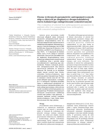 PRACE ORYGINALNE ORIGINAL PAPERS 1 Tomasz SZAPORÓW Edward GOLEC 2 Ocena wybranych parametrów antropometrycznych stóp u chorych po aloplastyce dwuprzedziałowej stawu kolanowego endoprotezami cementowanymi The evaluation of selected feet anthropometric parameters in patients after two compartment knee arthroplasty with cemented endoprosthesis 1 Zakład Rehabilitacji w Ortopedii, Katedra Rehabilitacji Klinicznej, Wydział Rehabilitacji Ruchowej, Akademia Wychowania Fizycznego im. Bronisława Czecha, Aleja Jana Pawła II 78, 31-571 Kraków. Kierownik Zakładu: dr hab. n. med. Edward Golec prof. nadzw. 2 Klinika Chirurgii Urazowej i Ortopedii 5 Wojskowego Szpitala Klinicznego z Polikliniką SPZOZ, ul. Wrocławska 1-3, 30-901 Kraków. Kierownik Kliniki: dr hab. n. med. Edward Golec prof. nadzw. Słowa kluczowe: aloplastyka dwuprzedziałowa stawu kolanowego, wskaźniki antropometryczne stóp Key words: cemented total knee replacement posterior stabilised, anthropometric parameters Adres do korespondencji: Edward Golec Klinika Chirurgii Urazowej i Ortopedii 5 Wojskowego Szpitala Klinicznego z Polikliniką SPZOZ, ul. Wrocławska 1-3, 30-901 Kraków FAX: 12/ 632-53-01 e-mail:[email protected] OSTRY DYŻUR 2013 . tom 6 . numer 3 Autorzy pracy prezentują wyniki obserwacji odległych zmian wybranych parametrów antropometrycznych stóp po aloplastyce dwuprzedziałowej stawu kolanowego endoprotezami cementowanymi ze stabilizacją tylną implantu. Dokonują tego w oparciu o materiał obejmujący lata od 2005 do 2010 roku. Stanowi go 52 chorych, w tym 42 kobiety, czyli 80,2% oraz 10 mężczyzn, co daje 19,2%. U 9 włączonych do badania kobiet, czyli u 17,3% zabiegi te wykonano obustronnie. Chorych tych zakwalifikowano do aloplastyki dwuprzedziałowej stawu kolanowego endoprotezami cementowanymi ze stabilizacją tylną z powodu zmian zwyrodnieniowych i szpotawego jego zniekształcenia. Pomiaru wybranych parametrów antropometrycznych stóp kończyn operowanych dokonano na skanerze stykowym 2D. Pozwala on na określenie między innymi wartości kąta Clarka, wskaźnika Sztritera-Godunowa, kąta piętowego gamma i kąta piętowego. Pomiary te wykonano w okresie czasu od 1 do 7 dni przed zabiegiem operacyjnym, a następnie po 3 i 6 miesiącach. Największą dynamikę zmian w analizowanych parametrach zaobserwowano po 3 miesiącach od dnia wykonania zabiegu operacyjnego, a dotyczyła ona przede wszystkim wartości kąta gamma oraz kąta piętowego. W badaniu wykonanym po 6 miesiącach zarejestrowano stabilizację wartości kąta gamma i kąta piętowego z istotnymi zmianami wartości wskaźnika Sztritera-Godunowa i kąta Clarka charakterystycznymi dla stopy płaskiej. The authors of the paper present outcomes of distant observations of selected feet anthropometric parameters changes after two compartment knee arthroplasty with cemented posterior stabilized endoprosthesis. It was done basing on clinical material of 2005 – 2010 years, consist of 52 patients, 42 women – 80,2% and 10 men – 19,2%. In 9 women – 17,3% included to the research operations were performed bilateral. All patients were qualified for two compartment knee arthroplasty with cemented posterior stabilized endoprosthesis because of osteoarthritis changes and varus deformity. The estimation of selected feet anthropometric parameters of operated extremities was done using 2D contact scanner. It allows to assess inter alia value of Clark angle, SztriterGodunow index, calcaneal gamma angle and calcaneal angle. These measurements were done in period from 1 to 7 days before operation and then after 3 and 6 months. The most changes dynamics of analyzed parameters was observed after 3 months from the day of performed operation and involve most of all the value of gamma angle as well as calcaneal angle. In study performed after 6 months was recorded stabilization of gamma angle and calcaneal angle with significant value changes of Sztriter-Godunow index and Clark angle characterizing flat food. Wstęp Zwyrodnienie stawu kolanowego, a zwłaszcza ze szpotawym zniekształceniem jego osi stanowi z pewnością jedno ze wskazań do wykonania aloplastyki różnego rodzaju endoprotezami. Jej celem jest między innymi przywrócenie właściwej osi, stabilności i oczekiwanego zakresu ruchomości operowanego stawu, poprawa wydolności i estetyki chodu oraz zmniejszenie lub całkowite wykluczenie istniejących dolegliwości bólowych [1,2,3,4]. Zwyrodnienie stawu kolanowego stanowi jedno z ogniw kinematycznego patologicznego łańcucha skutkującego tożsamymi zmianami obejmującymi sąsiadujące z nim inne odcinki narządu ruchu. Z pewnością należą do nich stawy biodrowe, stawy stóp czy też kręgosłupa [5,6]. W przebiegu choroby zwyrodnieniowej stawu kolanowego obserwowane są różnego rodzaju i ekspresji klinicznej zniekształcenia 81 stóp, a przede wszystkim sklepienia poprzecznego i podłużnego oraz koślawa deformacja palucha z młotkowatym zniekształceniem pozostałych palców, a zwłaszcza palca drugiego [7,8,9]. Upoważnionym staje się więc domniemanie, że obraz i przebieg kliniczny zwyrodnienia stawu kolanowego uwarunkowany jest także dynamiką zmian pozostałych odcinków narządu ruchu, w tym stóp. Powstaje zatem pytanie czy skorygowanie osi zwyrodniałego stawu kolanowego w przebiegu aloplastyki dwuprzedziałowej zmienia określone ich parametry antropometryczne? Cel pracy Celem prezentowanych badań była ocena wybranych parametrów antropometrycznych stóp w przebiegu choroby zwyrodnieniowej stawu kolanowego, a przede wszystkim udzielenie odpowiedzi na następujące pytania: 1. Jaką charakterystykę wykazują wybrane parametry antropometryczne stóp u chorych zakwalifikowanych do aloplastyki dwuprzedziałowej stawu kolanowego endoprotezami cementowanymi ze stabilizacja tylną, z powodu ich zwyrodnienia i szpotawej deformacji? 2. Czy operacyjna korekcja szpotawego zniekształcenia stawu kolanowego w przebiegu jego choro
