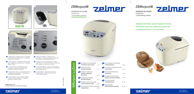 1 2 ZBM0900W ZBM0900W WYPIEKACZ DO CHLEBA хлебопечка / bread baking machine WYPIEKACZ DO CHLEBA хлебопечка / bread baking machine Wypiekacz do chleba o prostej i wygodnej obsłudze Хлебопечка с простым и удобным управлением Convenient and easy-to-use bread maker 4 PL 1. Moc: 660 W 2. Wyjmowana misa i mieszadło 3. Elektroniczny panel sterowania 4. Regulacja przyrumienienia wypieku RU 1. Мощность: 660 Вт 2. Съемная чаша и тестомес 3. Электронная панель управления 4. Регулировка поджаривания корочки CZ 1. Příkon: 660 W 2. Vyjímatelná miska a hnětací hák 3. Elektronický ovládací panel 4. Regulace připečení kůrky BG 1. Мощност: 660 W 2. Изваждане на купата и бъркалката 3. Електронен панел за управление 4. Регулиране на препичане на печене 1. Výkon: 660 W 2. Odoberateľná miska a miešadlo 3. Elektronický ovládací panel 4. Nastavenie intenzity prepečenia UA 1. Teljesítmény: 660 W 2. Kivehető tál és keverő 3. Elektronikus vezérlőpanel 4. A kisütött cipó barnításának szabályozása EN SK HU RO 1. Потужність: 660 Вт 2. З’ємна чаша і мішалка 3. Електронна панель керування 4. Регулювання підрум’янення випічки 1. Power: 660 W 2. Removable mould and kneading paddle 3. Electronic control panel 4. Crust colour regulation 43Z011-001_v04 1. Putere: 660 W 2. Vas şi malaxor detaşabil 3. Panou de control electronic 4. Ajustarea gradului de rumenire al pâinii Zelmer Pro Sp. z o.o. ul. Hoffmanowej 19, 35-016 Rzeszów, POLAND www.zelmer.pl www.zelmer.com BM0900/43Z011 3 PL INSTRUKCJA UŻYTKOWANIA WYPIEKACZ DO CHLEBA BG ИНСТРУКЦИЯ ЗА УПОТРЕБА CZ NÁVOD K POUŽITÍ DOMÁCÍ PEKÁRNA ХЛІБОПІЧКА 68–77 LT VARTOJIMO INSTRUKCIJA DUONKEPĖ 22–30 78–85 LV LIETOŠANAS INSTRUKCIJA MAIZES CEPŠANAS MAŠĪNA 86–93 HU HASZNÁLATI UTASÍTÁS KENYÉRSÜTŐGÉP 31–39 RO INSTRUCŢIUNI DE UTILIZARE CUPTOR PENTRU PÂINE 40–48 RU ИНСТРУКЦИЯ ПО ЭКСПЛУАТАЦИИ ХЛЕБОПЕЧКА 59–67 UA ІНСТРУКЦІЯ З ВИКОРИСТАННЯ 13–21 SK NÁVOD NA OBSLUHU DOMÁCA PEKÁREŇ NA CHLIEB ХЛЕБОПЕКАРНА 4–12 ET KASUTUSJUHEND LEIVAKÜPSETAJA 94–101 EN USER MANUAL BREAD BAKING MACHINE 102–109 49–58 www.zelmer.pl www.zelmer.com A PL 1 3 2 4 8 9 7 6 11 5 18 17 16 14 12 Gratulujemy wyboru naszego urządzenia i witamy wśród użytkowników produktów Zelmer. Prosimy o uważne przeczytanie niniejszej instrukcji obsługi. Szczególną uwagę należy poświęcić wskazówkom bezpieczeństwa. Instrukcję prosimy zachować, aby można było korzystać z niej również w trakcie późniejszego użytkowania wyrobu. Wskazówki dotyczące bezpieczeństwa i właściwego użytkowania Przed rozpoczęciem użytkowania urządzenia zapoznaj się z treścią całej instrukcji obsługi. 13 15 Szanowni Klienci! NIEBEZPIECZEŃSTWO! / OSTRZEŻENIE! 10 Nieprzestrzeganie grozi obrażeniami B 1 2 3 4 5 6 7 8 9 10 11 12 13 14 15 16 ● Niniejszy sprzęt może być użytkowany przez dzieci w wieku co najmniej 8 lat i przez osoby o obniżonych możliwościach fizycznych, umysłowych i osoby o braku doświadczenia i znajomości sprzętu, jeżeli zapewniony zostanie nadzór lub instruktaż odnośnie do użytkowania sprzętu w bezpieczny sposób i zrozumiałe związane z tym zagrożenia. Dzieci nie powinny bawić się sprzętem. Czyszczenie urządzenia oraz wykonywanie czynności konserwacyjnych nie powinny być wykonywane przez dzieci, chyba że ukończyły 8 lat i zapewni się nad nimi odpowiedni nadzór. ● Urządzenie wraz z przewodem przyłączeniowym należy przechowywać w miejscu niedostępnym dla dzieci poniżej 8 roku życia. ● Nie uruchamiaj urządzenia, jeśli przewód zasilający jest uszkodzony lub obudowa jest w sposób widoczny uszkodzona. 4 ● Jeżeli przewód zasilający nieodłączalny ulegnie uszkodzeniu, to powinien on być wymieniony u wytwórcy lub u pracownika zakładu serwisowego albo przez wykwalifikowaną osobę w celu uniknięcia zagrożenia. ● Napraw urządzenia może dokonywać jedynie przeszkolony personel. Nieprawidłowo wykonana naprawa może spowodować poważne zagrożenia dla użytkownika. W razie wystąpienia usterek zwróć się do specjalistycznego punktu serwisowego. ● Odłącz urządzenie od gniazdka sieci elektrycznej, gdy nie jest używane oraz przed rozpoczęciem czyszczenia. ● Odłącz urządzenie od gniazdka sieci elektrycznej przed zbliżeniem do części będących w ruchu podczas użytkowania. ● Przewód zasilający nie może zwisać nad brzegiem stołu lub blatu ani dotykać gorącej powierzchni. ● Podczas wyjmowania z urządzenia pojemnika do wypieku wraz z upieczonym chlebem używaj do tego specjalnych rękawic lub tkanin zabezpieczających przed poparzeniem, ponieważ pojemnik i chleb są bardzo gorące. ● Nie dotykaj gorących powierzchni urządzenia oraz otoczenia otworów wentylacyjnych. Stosuj rękawice kuchenne. Po zakończonym procesie pieczenia urządzenie jest bardzo gorące. ● Temperatura dostępnych powierzchni może być wyższa gdy sprzęt pracuje. ● Pozostaw urządzenie do ochłodzenia przed demontażem i czyszczeniem. Urządzenie wyposażone jest w termo izolowaną obudowę. Metalowe części urządzenia nagrzewają się podczas pracy. 43Z011-001_v04 ● ● ● ● ● ● ● ● ● If leaven powder with a different concentration is used (100g packet for 1 kg of flour) the quantity of flour must be reduced by 80g for 1 kg of flour. You can also use liquid leaven. Follow the doses indicated on the package. Fill the measuring beaker with the liquid leaven and top it up with other liquid ingredients in the right doses as specified in the r