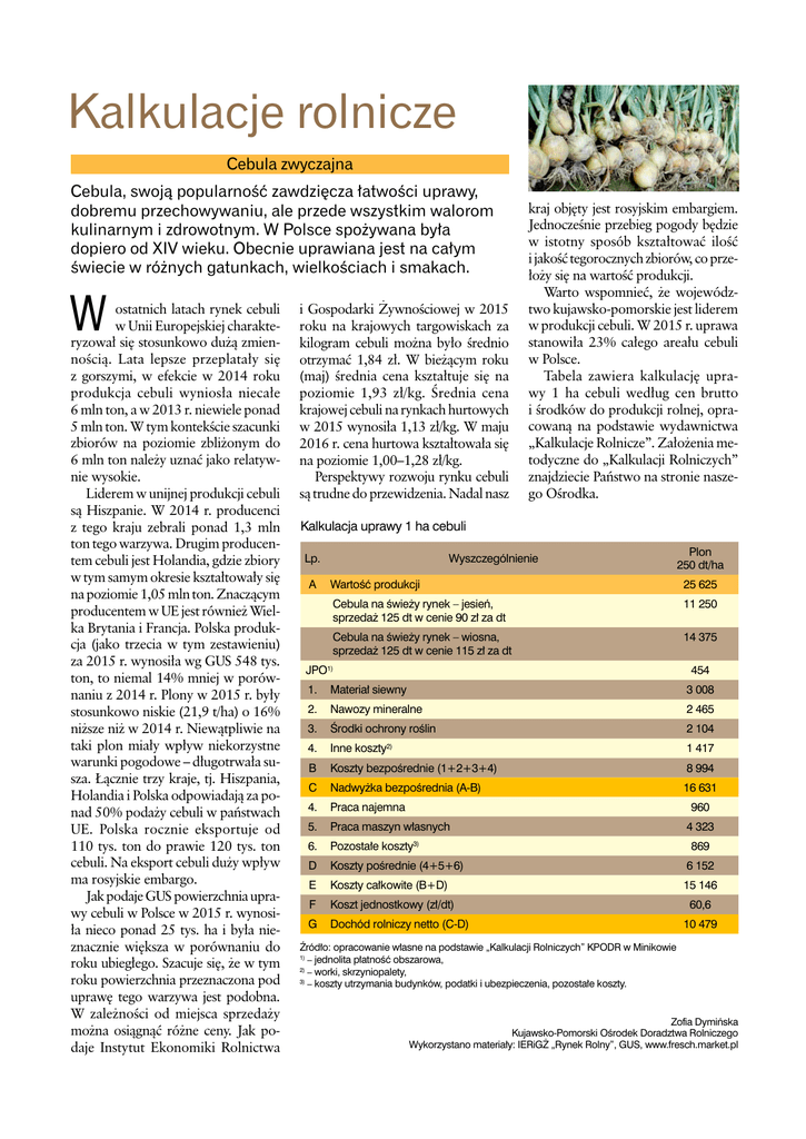 Kalkulacje rolnicze Cebula zwyczajna Cebula, swoją popularność zawdzięcza łatwości uprawy, dobremu przechowywaniu, ale przede wszystkim walorom kulinarnym i zdrowotnym. W Polsce spożywana była dopiero od XIV wieku. Obecnie uprawiana jest na całym świecie w różnych gatunkach, wielkościach i smakach. W ostatnich latach rynek cebuli w Unii Europejskiej charakteryzował się stosunkowo dużą zmiennością. Lata lepsze przeplatały się z gorszymi, w efekcie w 2014 roku produkcja cebuli wyniosła niecałe 6 mln ton, a w 2013 r. niewiele ponad 5 mln ton. W tym kontekście szacunki zbiorów na poziomie zbliżonym do 6 mln ton należy uznać jako relatywnie wysokie. Liderem w unijnej produkcji cebuli są Hiszpanie. W 2014 r. producenci z tego kraju zebrali ponad 1,3 mln ton tego warzywa. Drugim producentem cebuli jest Holandia, gdzie zbiory w tym samym okresie kształtowały się na poziomie 1,05 mln ton. Znaczącym producentem w UE jest również Wielka Brytania i Francja. Polska produkcja (jako trzecia w tym zestawieniu) za 2015 r. wynosiła wg GUS 548 tys. ton, to niemal 14% mniej w porównaniu z 2014 r. Plony w 2015 r. były stosunkowo niskie (21,9 t/ha) o 16% niższe niż w 2014 r. Niewątpliwie na taki plon miały wpływ niekorzystne warunki pogodowe – długotrwała susza. Łącznie trzy kraje, tj. Hiszpania, Holandia i Polska odpowiadają za ponad 50% podaży cebuli w państwach UE. Polska rocznie eksportuje od 110 tys. ton do prawie 120 tys. ton cebuli. Na eksport cebuli duży wpływ ma rosyjskie embargo. Jak podaje GUS powierzchnia uprawy cebuli w Polsce w 2015 r. wynosiła nieco ponad 25 tys. ha i była nieznacznie większa w porównaniu do roku ubiegłego. Szacuje się, że w tym roku powierzchnia przeznaczona pod uprawę tego warzywa jest podobna. W zależności od miejsca sprzedaży można osiągnąć różne ceny. Jak podaje Instytut Ekonomiki Rolnictwa i Gospodarki Żywnościowej w 2015 roku na krajowych targowiskach za kilogram cebuli można było średnio otrzymać 1,84 zł. W bieżącym roku (maj) średnia cena kształtuje się na poziomie 1,93 zł/kg. Średnia cena krajowej cebuli na rynkach hurtowych w 2015 wynosiła 1,13 zł/kg. W maju 2016 r. cena hurtowa kształtowała się na poziomie 1,00–1,28 zł/kg. Perspektywy rozwoju rynku cebuli są trudne do przewidzenia. Nadal nasz kraj objęty jest rosyjskim embargiem. Jednocześnie przebieg pogody będzie w istotny sposób kształtować ilość i jakość tegorocznych zbiorów, co przełoży się na wartość produkcji. Warto wspomnieć, że województwo kujawsko-pomorskie jest liderem w produkcji cebuli. W 2015 r. uprawa stanowiła 23% całego areału cebuli w Polsce. Tabela zawiera kalkulację uprawy 1 ha cebuli według cen brutto i środków do produkcji rolnej, opracowaną na podstawie wydawnictwa „Kalkulacje Rolnicze”. Założenia metodyczne do „Kalkulacji Rolniczych” znajdziecie Państwo na stronie naszego Ośrodka. Kalkulacja uprawy 1 ha cebuli Lp. A Wyszczególnienie Plon 250 dt/ha Wartość produkcji 25 625 Cebula na świeży rynek – jesień, sprzedaż 125 dt w cenie 90 zł za dt 11 250 Cebula na świeży rynek – wiosna, sprzedaż 125 dt w cenie 115 zł za dt 14 375 JPO1) 454 1. Materiał siewny 3 008 2. Nawozy mineralne 2 465 3. Środki ochrony roślin 2 104 4. Inne koszty 1 417 B Koszty bezpośrednie (1+2+3+4) 8 994 16 631 2) C Nadwyżka bezpośrednia (A-B) 4. Praca najemna 5. Praca maszyn własnych 6. Pozostałe koszty D Koszty pośrednie (4+5+6) 6 152 E Koszty całkowite (B+D) 15 146 F Koszt jednostkowy (zł/dt) G Dochód rolniczy netto (C-D) 960 3) 4 323 869 60,6 10 479 Źródło: opracowanie własne na podstawie „Kalkulacji Rolniczych” KPODR w Minikowie 1) – jednolita płatność obszarowa, 2) – worki, skrzyniopalety, 3) – koszty utrzymania budynków, podatki i ubezpieczenia, pozostałe koszty. Zofia Dymińska Kujawsko-Pomorski Ośrodek Doradztwa Rolniczego Wykorzystano materiały: IERiGŻ „Rynek Rolny”, GUS, www.fresch.market.pl