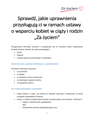 Sprawdź, jakie uprawnienia przysługują ci w ramach ustawy o wsparciu kobiet w ciąży i rodzin „Za życiem” Przygotowany informator pomoże ci przygotować się na narodziny także nieuleczalnie chorego dziecka. Dowiesz się, jakie przysługują ci: prawa, badania, rodzaje wsparcia (zdrowotnego i socjalnego). Gdzie jeszcze uzyskasz informację o uprawnieniach Potrzebne informacje otrzymasz: w przychodni, w szpitalu, w ośrodkach pomocy społecznej, w instytucjach wsparcia rodziny, od asystenta rodziny. Kto może skorzystać z uprawnień: każda kobieta, w ciąży i jej rodzina (w zakresie informacji i poradnictwa na temat rozwiązań wspierających rodzinę), rodziny, w których przyjdzie albo przyszło na świat ciężko chore dziecko. Oznacza to: o ciężkie i nieodwracalne upośledzenie albo o nieuleczalną chorobę zagrażającą jego życiu, 1 kobiety, które otrzymały informację o tym, że ich dziecko może umrzeć w trakcie ciąży lub porodu, kobiety, których dziecko umarło bezpośrednio po porodzie na skutek wad wrodzonych, kobiety, które po porodzie nie zabiorą do domu dziecka z powodu: o poronienia, o urodzenia dziecka martwego, o urodzenia dziecka niezdolnego do życia, o urodzenia dziecka obarczonego wadami wrodzonymi albo śmiertelnymi schorzeniami. Jak skorzystać z uprawnień Podstawą do skorzystania z uprawnień jest zaświadczenie, które potwierdza ciężkie i nieodwracalne upośledzenie albo nieuleczalną chorobę zagrażającą życiu. Zaświadczenie o chorobie, powstałej w prenatalnym okresie rozwoju dziecka lub w czasie porodu, możesz otrzymać od lekarza ubezpieczenia zdrowotnego1, który: posiada specjalizację II stopnia lub tytuł specjalisty w dziedzinie: położnictwa i ginekologii, perinatologii lub neonatologii. Ponadto, zaświadczenie wydane przez: lekarza podstawowej opieki zdrowotnej; lekarza ubezpieczenia zdrowotnego, który posiada specjalizację II stopnia lub tytuł specjalisty w dziedzinie: położnictwa i ginekologii, perinatologii lub neonatologii, specjalistę w dziedzinie pediatrii, uprawnia: a) dzieci do 18 r. ż.2 do: skorzystania z wyrobów medycznych, na zasadach określonych „Za życiem”; Lekarza, z którym Narodowy Fundusz Zdrowia zawarł umowę o udzielanie świadczeń opieki zdrowotnej, albo lekarz który jest zatrudniony lub wykonuje zawód w przychodni, z którą NFZ zawarł umowę o udzielanie świadczeń opieki zdrowotnej. 1 Dzieci u których stwierdzono ciężkie i nieodwracalne upośledzenie albo nieuleczalną chorobę zagrażającą życiu, które powstały w prenatalnym okresie rozwoju dziecka lub w czasie porodu. 2 2 korzystania poza kolejnością ze świadczeń opieki zdrowotnej oraz z usług farmaceutycznych udzielanych w aptekach. Pamiętaj też o tym, że każda kobieta w ciąży ma prawo do korzystania poza kolejnością ze świadczeń opieki zdrowotnej oraz z usług farmaceutycznych udzielanych w aptekach. Ważne: wszystkie kobiety w trakcie ciąży mają prawo do świadczeń opieki zdrowotnej finansowanych ze środków publicznych. Co przysługuje kobiecie oczekującej dziecka, dowiesz się z informatora Ministerstwa Zdrowia „Ciąża i Poród”, który dostępny jest na stronie www.mz.gov.pl w zakładce „Zdrowie i profilaktyka” – „Zdrowie matki i dziecka”. Każda kobieta w ciąży i jej rodzina może skorzystać z pomocy i wsparcia asystenta rodziny. Asystent nie tylko odpowie na wszystkie twoje pytania, ale też na podstawie pisemnego upoważnienia będzie mógł załatwiać w twoim imieniu sprawy w różnych instytucjach. Asystent pomoże Ci także rozwiązać problemy opiekuńczo-wychowawcze. Asystent rodziny: udzieli informacji w zakresie dostępu do instrumentów polityki na rzecz rodziny, będzie mógł Ciebie reprezentować przed instytucjami i urzędami, udzieli wsparcia psychologicznego, udzieli pomocy w przezwyciężaniu problemów wychowawczych udzieli pomocy prawnej, będzie Cię wspierał w realizacji codziennych obowiązków. Gdzie możesz się zgłosić się po pomoc asystenta rodziny Asystent rodziny, jest zatrudniony w jednostkach organizacyjnych systemu wspierania rodziny lub w instytucjach pozarządowych działających na zlecenie samorządu gminy. Przykładowe formy wsparcia oferowane przez asystenta rodziny: 3 doradztwo w zakresie form i miejsc wsparcia, poradnictwo oferowane kobietom w ciąży i ich rodzinom, poradnictwo w zakresie pielęgnacji i opieki nad niemowlęciem, pomoc w codziennej organizacji życia rodziny, planowanie sposobów spędzania wspólnie wolnego czasu, nauka sprawnego wykonywania obowiązków domowych, doradztwo w zakresie zarządzania budżetem domowym, informowanie, jak działają urzędy, placówki wsparcia rodziny i dziecka, pomoc w sprawach urzędowych, wspieranie rodziny w kontaktach z pracownikami szkoły, przedszkola, sądu, poradni, przychodni, policji, urzędów i innych instytucji, pomoc w zakresie możliwości podniesienia kwalifikacji zawodowych i poszukiwaniu pracy. Ze wsparcia asystenta rodziny możesz skorzystać w każdej sytuacji, gdy wyrazisz taką wolę. W tym celu będziesz musiał wystąpić z wnioskiem do gminy. W przypadku zaistnienia okoliczności wskazanych w ustawie „Za życiem” nie jest stosowana procedura wymagająca m.in. przeprowadzenia przez pracownika socjalnego rodzinnego wywiadu środowiskowego. Z jakich uprawnień możesz skorzystać dodatkowo: 1. Okres okołoporodowy badania, które wykrywają potencjalne nieprawidłowości w ciąży (diagnostyka prenatalna), od 4 do 9 dodatkowych wizyt położnej w opiece nad dzieckiem (tzw. wizyty patronażowe) oraz większa ilość wizyt poradnictwa edukacji przedporodowej. Od 21 tygodnia ciąży do rozwiązania, położne przygotowywać będą kobiety do porodu i rodzicielstwa. Edukacja przedporodowa dotyczyć będzie porodu, połogu, karmienia piersią i rodzicielstwa, poród w szpitalu na najwyższym specjalistycznym poziomie (III poziom referencyjny) - zgodnie ze ws