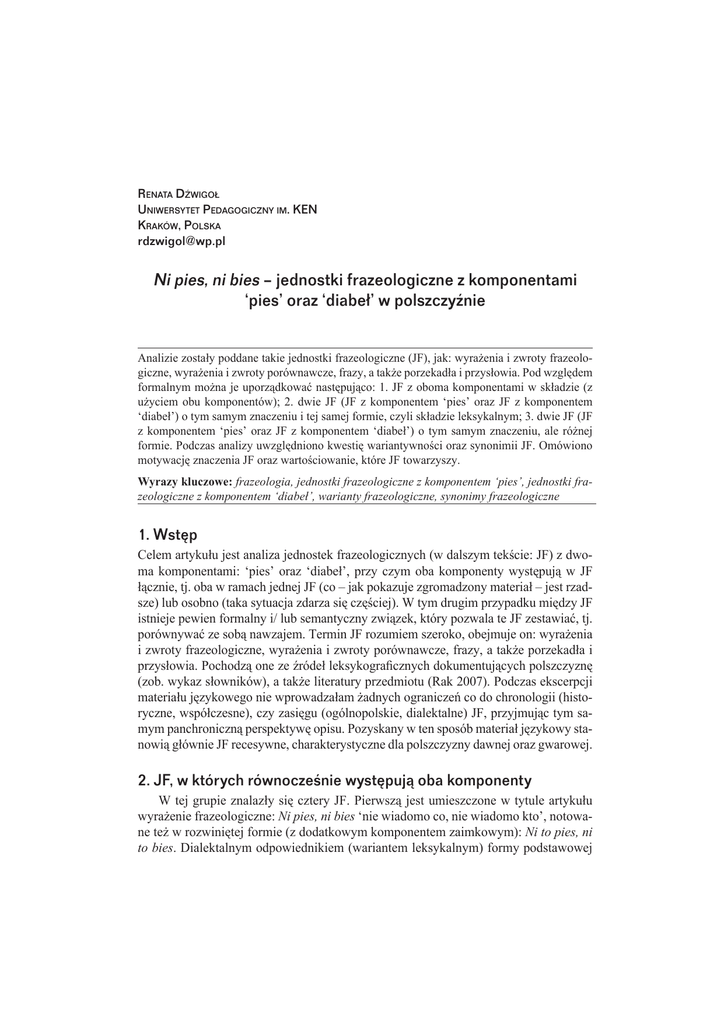 RENATA DŹWIGOŁ UNIWERSYTET PEDAGOGICZNY IM. KEN KRAKÓW, POLSKA [email protected] Ni pies, ni bies – jednostki frazeologiczne z komponentami ‘pies’ oraz ‘diabeł’ w polszczyźnie Analizie zostały poddane takie jednostki frazeologiczne (JF), jak: wyrażenia i zwroty frazeologiczne, wyrażenia i zwroty porównawcze, frazy, a także porzekadła i przysłowia. Pod względem formalnym można je uporządkować następująco: 1. JF z oboma komponentami w składzie (z użyciem obu komponentów); 2. dwie JF (JF z komponentem ‘pies’ oraz JF z komponentem ‘diabeł’) o tym samym znaczeniu i tej samej formie, czyli składzie leksykalnym; 3. dwie JF (JF z komponentem ‘pies’ oraz JF z komponentem ‘diabeł’) o tym samym znaczeniu, ale różnej formie. Podczas analizy uwzględniono kwestię wariantywności oraz synonimii JF. Omówiono motywację znaczenia JF oraz wartościowanie, które JF towarzyszy. Wyrazy kluczowe: frazeologia, jednostki frazeologiczne z komponentem ‘pies’, jednostki frazeologiczne z komponentem ‘diabeł’, warianty frazeologiczne, synonimy frazeologiczne 1. Wstęp Celem artykułu jest analiza jednostek frazeologicznych (w dalszym tekście: JF) z dwoma komponentami: ‘pies’ oraz ‘diabeł’, przy czym oba komponenty występują w JF łącznie, tj. oba w ramach jednej JF (co – jak pokazuje zgromadzony materiał – jest rzadsze) lub osobno (taka sytuacja zdarza się częściej). W tym drugim przypadku między JF istnieje pewien formalny i/ lub semantyczny związek, który pozwala te JF zestawiać, tj. porównywać ze sobą nawzajem. Termin JF rozumiem szeroko, obejmuje on: wyrażenia i zwroty frazeologiczne, wyrażenia i zwroty porównawcze, frazy, a także porzekadła i przysłowia. Pochodzą one ze źródeł leksykograficznych dokumentujących polszczyznę (zob. wykaz słowników), a także literatury przedmiotu (Rak 2007). Podczas ekscerpcji materiału językowego nie wprowadzałam żadnych ograniczeń co do chronologii (historyczne, współczesne), czy zasięgu (ogólnopolskie, dialektalne) JF, przyjmując tym samym panchroniczną perspektywę opisu. Pozyskany w ten sposób materiał językowy stanowią głównie JF recesywne, charakterystyczne dla polszczyzny dawnej oraz gwarowej. 2. JF, w których równocześnie występują oba komponenty W tej grupie znalazły się cztery JF. Pierwszą jest umieszczone w tytule artykułu wyrażenie frazeologiczne: Ni pies, ni bies ‘nie wiadomo co, nie wiadomo kto’, notowane też w rozwiniętej formie (z dodatkowym komponentem zaimkowym): Ni to pies, ni to bies. Dialektalnym odpowiednikiem (wariantem leksykalnym) formy podstawowej Životinje u frazeološkom ruhu 2 jest JF: Ni czort, ni chort [‘chart, rasa psa’] (NKPP II 898: pies 146). Jak widać, w tym przypadku o doborze odpowiednich wyrazów realizujących znaczenia ‘pies’, ‘diabeł’ decydują względy rytmiczne, przede wszystkim rym: pies + bies, chart + czart. Druga JF to rozbudowana forma zwrotu psu oczy sprzedał ‘o człowieku bezwstydnym’: psu oczy przedał, a diabłu / czartowi duszę (NKPP II 724: oko 139). Rozbudowanie zwrotu służy podkreśleniu znaczenia JF – bezwstydność jest grzechem, który obrazowo został tutaj przedstawiony jako zaprzedanie duszy diabłu. O braku rozwagi, brawurze, zbytniej pewności siebie, nieprzewidywaniu konsekwencji swojego postępowania traktuje przysłowie – przestroga: Jako nieboja [‘odważnego, śmiałego’] pies kąsa, tak nieopatrznego [‘nieostrożnego, nierozważnego, lekkomyślnego’] diabeł sidli (NKPP III 444: śmiały 7). Ma ono formę porównania, w którym zestawiono psa i diabła, stanowiących poważne zagrożenie dla człowieka – zarówno dla jego ciała (pies) jak i dla jego duszy (diabeł). Inna paremia przedstawia negatywne konsekwencje małżeńskiej kłótni: W małżeństwie jak się pokłócą, będzie tam albo psie złe, albo diabeł kotny (NKPP II 383: małżeństwo 32). Te negatywne konsekwencje są zapewne długotrwałe, skoro w przysłowiu mowa jest o diable kotnym – dosł. ‘spodziewającym się potomstwa’. 3. Warianty frazeologiczne Tę grupę stanowią pary JF – jedna z komponentem ‘pies’, druga z komponentem ‘diabeł’, które są tożsame pod względem: znaczenia, obrazowania i formy składniowej. Znane są różne stanowiska lingwistów co do wariantywności frazeologicznej (Kozarzewska 1969, Giułumianc 1977, Buttler 1982, Lewicki 1982, Pajdzińska 1982, Rytel 1982, Skorupka 1986, Piela 2006, Pajdzińska 2011). Definicja wariantywności, którą przyjęto w tym artykule, dopuszcza wymianę komponentów niesynonimicznych: ‘pies’, ‘diabeł’. Jest to wariantywność leksykalna. To, że obie JF mają takie samo znaczenie, bywa podkreślane poprzez zastosowanie odpowiedniego zapisu w słowniku, a polega to na definiowaniu jednej JF, które odbywa się z wykorzystaniem definicji synonimicznej, tj. poprzez przywołanie drugiej JF: Cóz u psa starygo! ‘znaczy tyle, co u diabła!’ (NKPP II 887: pies 28). W tym przypadku wariantami frazeologicznymi są jednostki: Co u diabła?! Cóż u psa starego! (NKPP rejestruje formę dialektalną, zmazurzoną). W ostatniej JF nastąpiło wzmocnienie ekspresji, osiągnięte dzięki użyciu partykuły wzmacniającej –ż oraz wprowadzeniu dodatkowego komponentu przymiotnikowego. Inną parą ekspresywizmów, będących wariantami frazeologicznymi, są jednostki: Po kiego diabła?! ‘po co, na co, w jakim celu’ (Skorupka I 170) Po kiego psa ‘ekspresywne wyrażenie’ (Rak 2007: 46). Renata Dźwigoł – NI PIES, NI BIES – JEDNOSTKI FRAZEOLOGICZNE... 3 Podobnie jak w przypadku poprzednich JF, również i tutaj przyczyną powstania wariantu frazeologicznego jest tabuizacja wyrazu diabeł. W drugiej JF komponent pies pojawia się jako jego eufemizm. Zjawisko to należy do tzw. tabu pierwotnego, archaicznego, wierzeniowego. Wiąże się z magią językową, czyli utożsamianiem wypowiadaneg