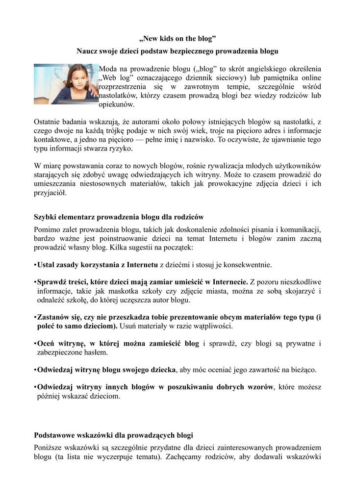 „New kids on the blog” Naucz swoje dzieci podstaw bezpiecznego prowadzenia blogu Moda na prowadzenie blogu („blog” to skrót angielskiego określenia „Web log” oznaczającego dziennik sieciowy) lub pamiętnika online rozprzestrzenia się w zawrotnym tempie, szczególnie wśród nastolatków, którzy czasem prowadzą blogi bez wiedzy rodziców lub opiekunów. Ostatnie badania wskazują, że autorami około połowy istniejących blogów są nastolatki, z czego dwoje na każdą trójkę podaje w nich swój wiek, troje na pięcioro adres i informacje kontaktowe, a jedno na pięcioro — pełne imię i nazwisko. To oczywiste, że ujawnianie tego typu informacji stwarza ryzyko. W miarę powstawania coraz to nowych blogów, rośnie rywalizacja młodych użytkowników starających się zdobyć uwagę odwiedzających ich witryny. Może to czasem prowadzić do umieszczania niestosownych materiałów, takich jak prowokacyjne zdjęcia dzieci i ich przyjaciół. Szybki elementarz prowadzenia blogu dla rodziców Pomimo zalet prowadzenia blogu, takich jak doskonalenie zdolności pisania i komunikacji, bardzo ważne jest poinstruowanie dzieci na temat Internetu i blogów zanim zaczną prowadzić własny blog. Kilka sugestii na początek: •Ustal zasady korzystania z Internetu z dziećmi i stosuj je konsekwentnie. •Sprawdź treści, które dzieci mają zamiar umieścić w Internecie. Z pozoru nieszkodliwe informacje, takie jak maskotka szkoły czy zdjęcie miasta, można ze sobą skojarzyć i odnaleźć szkołę, do której uczęszcza autor blogu. •Zastanów się, czy nie przeszkadza tobie prezentowanie obcym materiałów tego typu (i poleć to samo dzieciom). Usuń materiały w razie wątpliwości. •Oceń witrynę, w której można zamieścić blog i sprawdź, czy blogi są prywatne i zabezpieczone hasłem. •Odwiedzaj witrynę blogu swojego dziecka, aby móc oceniać jego zawartość na bieżąco. •Odwiedzaj witryny innych blogów w poszukiwaniu dobrych wzorów, które możesz później wskazać dzieciom. Podstawowe wskazówki dla prowadzących blogi Poniższe wskazówki są szczególnie przydatne dla dzieci zainteresowanych prowadzeniem blogu (ta lista nie wyczerpuje tematu). Zachęcamy rodziców, aby dodawali wskazówki adekwatnie do potrzeb ich rodziny. Przede wszystkim przekaż dzieciom, że: •Nigdy nie powinny podawać prywatnych informacji takich jak nazwisko, dane kontaktowe, adresy, numery telefonów, nazwa szkoły, adres e-mail, nazwiska przyjaciół i krewnych, nazwy użytkowników w komunikatorach internetowych, wiek lub data urodzenia. •Nigdy nie powinny umieszczać prowokacyjnych zdjęć swoich lub innych osób oraz zdjęć, które mogłyby ujawniać prywatne informacje. Powinny zawsze zwrócić uwagę na tło zdjęcia. •Powinny założyć, że treści umieszczanych w sieci Web nie można usunąć. Każdy użytkownik Internetu może łatwo wydrukować lub zapisać treść blogu na swoim komputerze. •Powinny korzystać z witryn umieszczających blogi, które mają jasno określone warunki użytkowania oraz oferują ochronę hasłem samego blogu, a nie tylko konta użytkownika. (Nawet w takich przypadkach lepiej założyć, że blog będzie dostępny dla każdego.) •Powinny unikać „ścigania się” lub rywalizacji z innymi autorami blogów. •Treści zamieszczane w blogu powinny być pozytywne, a blogów nie powinno się używać do rozpowszechniania nieprawdziwych informacji i atakowania innych.