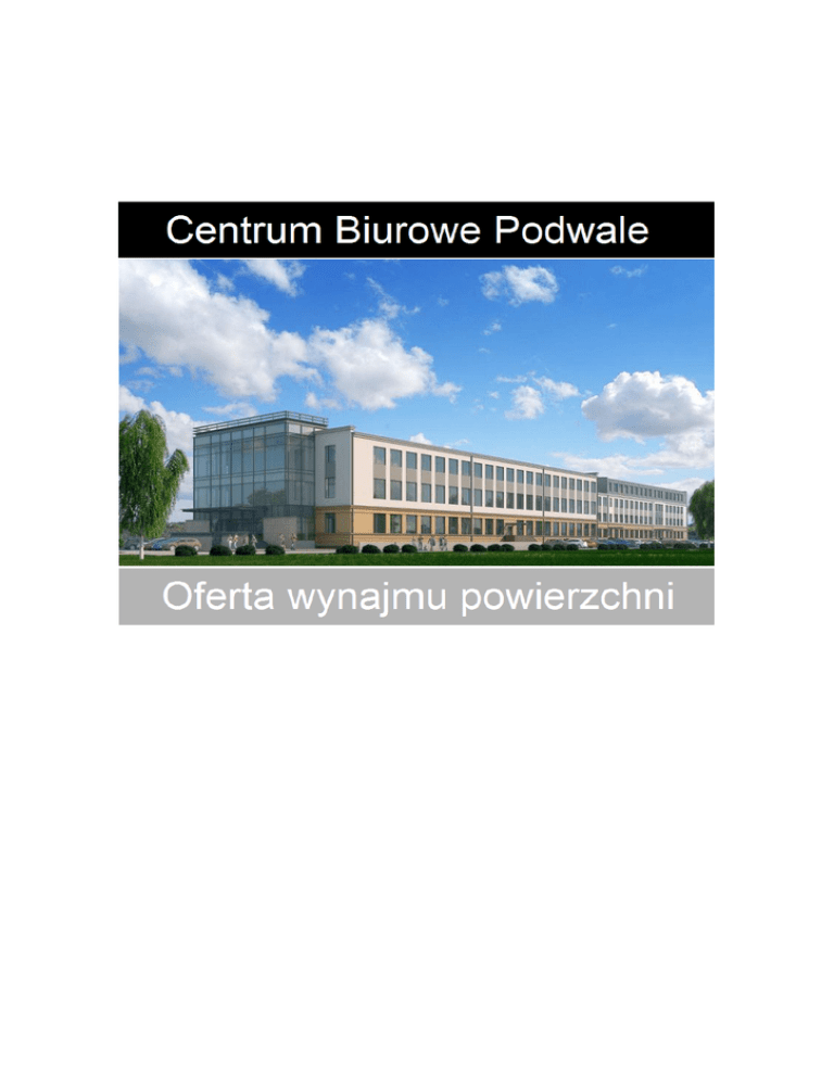 Centrum Biurowe Podwale to nowoczesny biurowiec oferujący 10 500 m² powierzchni biurowej do wynajęcia (13 500m² powierzchni całkowitej), usytuowany w bezpośrednim sąsiedztwie ścisłego centrum Poznania. Obiekt znajduje się w prestiżowej lokalizacji na ulicy Małachowskiego, przy Rondzie Śródka. Bliska odległość do pętli tramwajowej i przystanków autobusowych zapewnia bardzo dobry dojazd do dowolnego punktu w Poznaniu oraz okolicy. Atrakcyjność tego miejsca to także park roztaczający się przed wejściem do biurowca, sklepy, restauracja znajdująca się w obiekcie oraz 276 miejsc parkingowych na zewnątrz i wewnątrz budynku. Biurowiec wykonano przy użyciu najwyższej jakości materiałów, z zastosowaniem najnowszych technologii. Cechuje go energooszczędność, elegancja oraz funkcjonalność. Przyszli najemcy mają możliwość dowolnej aranżacji biur. Unikalny rozkład pięter pozwala na stworzenie kilkutysięcznych powierzchni biurowych typu open space bądź modułowych na jednym poziomie (aż do 3000m² na piętrze). Inwestycję cechuje także dbałość o środowisko naturalne oraz wrażliwość społeczna. Przy wsparciu programu europejskiego w ramach inicjatywy JESSICA inwestor realizuje m.in. projekt założenia parku wraz z chodnikami, ławeczkami i placem zabaw dla dzieci, poprawy i rozbudowy infrastruktury drogowej, objęcia okolicznych ulic monitoringiem. Biurowiec Podwale spełnia techniczne oczekiwania wobec budynków klasy A. Do jego głównych zalet należą: Lokalizacja: - położenie blisko ścisłego centrum Poznania, - bliskość Ronda Śródka i Pierwszej ramy komunikacyjnej miasta – jeden z najważniejszych szlaków komunikacyjnych w mieście, - doskonała komunikacja miejska (pętla tramwajowa, przystanki autobusowe), - tereny zielone (park publiczny) oraz sklepy w bezpośrednim otoczeniu budynku. Jakość: - wysoka jakość materiałów wykończeniowych, - otwierane okna aluminiowe (okna dwuskrzydłowe z jednym elementem stałym, a drugim otwieralnym) o podwyższonych parametrach akustycznych i współczynnika solarnego, - 4 windy szybkobieżne, - podłogi technologiczne – 70% powierzchni biurowca (Budynek B i III piętro Budynku A), - podwieszane sufity. Elastyczność: - możliwość utworzenia wielotysięcznych powierzchni biurowych na jednym poziomie aż do 3000m², - dowolna aranżacja przestrzeni biurowej typu open space bądź komórkowa, - podwyższona nośność stropów: 800 kg/m2, - średnia wysokość pomieszczeń 3m. Bezpieczeństwo: - podwójne zasilanie energetyczne od dwóch niezależnych dostawców ENEA oraz PKP Energetyka, - system kontroli dostępu, - system sygnalizacji włamania i napadu, - system ochrony ppoż. SAP, - monitoring CCTV, - całodobowa ochrona. Udogodnienia: - recepcja w holu głównym, - punkt gastronomiczny w biurowcu, - przechowalnia rowerów z dostępem do szatni z prysznicami, - rozwiązania przyjazne dla niepełnosprawnych, - 276 miejsc parkingowych (46 podziemnych miejsc i 230 naziemnych miejsc parkingowych) Innowacja: - inteligentny system zarządzania budynkiem - energooszczędna, wydajna klimatyzacja i wentylacja (mechaniczna nawiewno-wywiewna z systemem odzyskiwania energii cieplnej) - energooszczędny system oświetlenia, - indywidualne sterowanie ogrzewaniem i chłodzeniem Terminy oddania: Budynek B - WRZESIEŃ 2014, Budynek A – GRUDZIEŃ 2014. LOKALIZACJA Centrum Biurowe Podwale usytuowane jest na dwuhektarowej działce przy ulicy Małachowskiego, w bezpośrednim sąsiedztwie ścisłego centrum Poznania oraz terenów rekreacyjnych wokół jeziora Malta. ZAPRASZAMY DO KONTAKTU: Chętnie udzielimy wszelkich informacji o wynajmie powierzchni w Centrum Biurowym Podwale: Robert Machura Dyrektor ds. Handlowych +48 602-238-680 [email protected] www.centrumpodwale.pl Machura Bros Corporation Sp. J. ul. Chlebowa 4/8 61-003 Poznań + 48 616-529-480 [email protected] www.mbc.poznan.pl