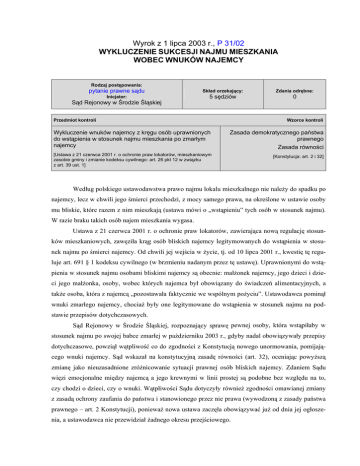 Wyrok z 1 lipca 2003 r., P 31/02 WYKLUCZENIE SUKCESJI NAJMU MIESZKANIA WOBEC WNUKÓW NAJEMCY Rodzaj postępowania: pytanie prawne sądu Inicjator: Sąd Rejonowy w Środzie Śląskiej Skład orzekający: Zdania odrębne: 5 sędziów 0 Przedmiot kontroli Wzorce kontroli Wykluczenie wnuków najemcy z kręgu osób uprawnionych do wstąpienia w stosunek najmu mieszkania po zmarłym najemcy Zasada demokratycznego państwa prawnego Zasada równości [Ustawa z 21 czerwca 2001 r. o ochronie praw lokatorów, mieszkaniowym zasobie gminy i zmianie kodeksu cywilnego: art. 26 pkt 12 w związku z art. 39 ust. 1] [Konstytucja: art. 2 i 32] Według polskiego ustawodawstwa prawo najmu lokalu mieszkalnego nie należy do spadku po najemcy, lecz w chwili jego śmierci przechodzi, z mocy samego prawa, na określone w ustawie osoby mu bliskie, które razem z nim mieszkają (ustawa mówi o „wstąpieniu” tych osób w stosunek najmu). W razie braku takich osób najem mieszkania wygasa. Ustawa z 21 czerwca 2001 r. o ochronie praw lokatorów, zawierająca nową regulację stosunków mieszkaniowych, zawęziła krąg osób bliskich najemcy legitymowanych do wstąpienia w stosunek najmu po śmierci najemcy. Od chwili jej wejścia w życie, tj. od 10 lipca 2001 r., kwestię tę reguluje art. 691 § 1 kodeksu cywilnego (w brzmieniu nadanym przez tę ustawę). Uprawnionymi do wstąpienia w stosunek najmu osobami bliskimi najemcy są obecnie: małżonek najemcy, jego dzieci i dzieci jego małżonka, osoby, wobec których najemca był obowiązany do świadczeń alimentacyjnych, a także osoba, która z najemcą „pozostawała faktycznie we wspólnym pożyciu”. Ustawodawca pominął wnuki zmarłego najemcy, chociaż były one legitymowane do wstąpienia w stosunek najmu na podstawie przepisów dotychczasowych. Sąd Rejonowy w Środzie Śląskiej, rozpoznający sprawę pewnej osoby, która wstąpiłaby w stosunek najmu po swojej babce zmarłej w październiku 2003 r., gdyby nadal obowiązywały przepisy dotychczasowe, powziął wątpliwość co do zgodności z Konstytucją nowego unormowania, pomijającego wnuki najemcy. Sąd wskazał na konstytucyjną zasadę równości (art. 32), oceniając powyższą zmianę jako nieuzasadnione zróżnicowanie sytuacji prawnej osób bliskich najemcy. Zdaniem Sądu więzi emocjonalne między najemcą a jego krewnymi w linii prostej są podobne bez względu na to, czy chodzi o dzieci, czy o wnuki. Wątpliwości Sądu dotyczyły również zgodności omawianej zmiany z zasadą ochrony zaufania do państwa i stanowionego przez nie prawa (wywodzoną z zasady państwa prawnego – art. 2 Konstytucji), ponieważ nowa ustawa zaczęła obowiązywać już od dnia jej ogłoszenia, a ustawodawca nie przewidział żadnego okresu przejściowego. 2 ROZSTRZYGNIĘCIE Zaskarżone unormowanie w zakresie, w jakim dokonało zawężenia kręgu osób uprawnionych do wstąpienia w stosunek najmu po zmarłym najemcy, jest zgodne z art. 2 i 32 Konstytucji. GŁÓWNE TEZY UZASADNIENIA 1. To, że ustawa nowelizująca nie zawiera szczególnej regulacji kwestii intertemporalnych, nie znaczy, iż w tym zakresie istnieje luka w prawie. W takich wypadkach należy przyjąć, że immanentną cechą przepisu zmieniającego (tutaj: art. 26 pkt 12 ustawy z dnia 21 czerwca 2001 r. o ochronie praw lokatorów, wprowadzającego do kodeksu cywilnego art. 691 w nowym brzmieniu) jest nakaz stosowania nowego unormowania do „stosunków w toku”, zgodnie z zasadą bezpośredniego skutku ustawy nowej. 2. Przepis art. 75 Konstytucji jest przepisem programowym, określającym politykę państwa w zakresie „zaspakajania potrzeb mieszkaniowych obywateli”. Nie wskazuje on standardu realizacji tej polityki ani – tym bardziej – nie stanowi podstawy konkretnych roszczeń. Polityka ochrony lokatorów wymaga konkretyzacji poprzez unormowania ustawowe. 3. Chociaż Konstytucja w art. 75 nakłada na państwo obowiązek ochrony trwałości tytułu prawnego lokatorów do zajmowanego lokalu, to nie wynika stąd gwarancja stabilizacji korzystania z lokalu przez lokatora w każdym przypadku. 4. Konstytucyjna ochrona wynajmującego jako dysponenta mieszkania ma podstawę w art. 64, ochrona zaś lokatorów – w art. 75, który dotyczy wszystkich lokatorów. Lokatorzy będący najemcami korzystają także z ochrony najmu jako prawa majątkowego na podstawie art. 64 Konstytucji. Ochrona ta nie obejmuje natomiast lokatorów mieszkających z najemcami, czyli osób, które ewentualnie byłyby zainteresowane wstąpieniem w stosunek najmu po śmierci najemcy. To zaś powoduje, że nie występuje tu konflikt uprawnień dwóch grup podmiotów wywodzących swą ochronę konstytucyjną z art. 64 Konstytucji. Wynajmujący (beneficjent „innego prawa majątkowego” w rozumieniu art. 64 ust. 1 Konstytucji) może podlegać tylko takim ustawowym ograniczeniom, które nie naruszają istoty prawa własności (art. 64 ust. 3 Konstytucji). Natomiast lokator nie będący jeszcze najemcą korzysta tylko z ochrony na płaszczyźnie ustawowej (por. art. 75 ust. 2 Konstytucji). 5. W ocenie konstytucyjnej instytucji „wstąpienia” w stosunek najmu lokalu mieszkalnego osób wskazanych w art. 691 k.c. po śmierci najemcy należy zważyć, że z punktu widzenia wynajmującego sukcesja ta oznacza kontynuację istniejącego stosunku najmu. Wynajmujący z reguły nie ma wpływu na czas trwania tego stosunku, zwłaszcza że możliwość wypowiedzenia przez niego najmu mieszkania jest dopuszczalna tylko z przyczyn restrykcyjnie określonych przez ustawę. Dla drugiej strony, czyli wstępującego w stosunek najmu, sukcesja ta oznacza natomiast korzystną zmianę tytułu prawnego do zajmowanego lokalu, wiążącą się z radykalnym wzmocnieniem jego sytuacji prawnej: status lokatora nie będącego najemcą przekształca się w status najemcy, z którym wiąże się specjalna ochrona stabilizacji najmu. A zatem instytucja wstąpienia w stosunek najmu, stabilizując stosu