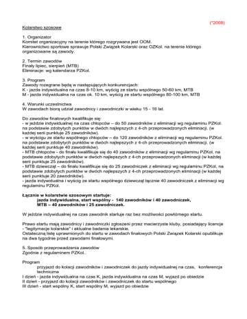 (*2008) Kolarstwo szosowe 1. Organizator Komitet organizacyjny na terenie którego rozgrywana jest OOM. Kierownictwo sportowe sprawuje Polski Związek Kolarski oraz OZKol. na terenie którego organizowane są zawody. 2. Termin zawodów Finały lipiec, sierpień (MTB) Eliminacje: wg kalendarza PZKol. 3. Program Zawody rozegrane będą w następujących konkurencjach: K - jazda indywidualna na czas 8-10 km, wyścig ze startu wspólnego 50-60 km, MTB M - jazda indywidualna na czas ok. 10 km, wyścig ze startu wspólnego 80-100 km, MTB 4. Warunki uczestnictwa W zawodach biorą udział zawodnicy i zawodniczki w wieku 15 - 16 lat. Do zawodów finałowych kwalifikuje się: - w jeździe indywidualnej na czas chłopców – do 50 zawodników z eliminacji wg regulaminu PZKol. na podstawie zdobytych punktów w dwóch najlepszych z 4-ch przeprowadzonych eliminacji. (w każdej serii punktuje 25 zawodników). - w wyścigu ze startu wspólnego chłopców – do 120 zawodników z eliminacji wg regulaminu PZKol. na podstawie zdobytych punktów w dwóch najlepszych z 4-ch przeprowadzonych eliminacji. (w każdej serii punktuje 40 zawodników). - MTB chłopców - do finału kwalifikuje się do 40 zawodników z eliminacji wg regulaminu PZKol, na podstawie zdobytych punktów w dwóch najlepszych z 4-ch przeprowadzonych eliminacji (w każdej serii punktuje 25 zawodników). - MTB dziewcząt – do finału kwalifikuje się do 25 zawodniczek z eliminacji wg regulaminu PZKol, na podstawie zdobytych punktów w dwóch najlepszych z 4-ch przeprowadzonych eliminacji (w każdej serii punktuje 20 zawodników). - jazda indywidualna i wyścig ze startu wspólnego dziewcząt łącznie 40 zawodniczek z eliminacji wg regulaminu PZKol. Łącznie w kolarstwie szosowym startuje: jazda indywidualna, start wspólny - 140 zawodników i 40 zawodniczek, MTB – 40 zawodników i 25 zawodniczek. W jeździe indywidualnej na czas zawodnik startuje raz bez możliwości powtórnego startu. Prawo startu mają zawodnicy i zawodniczki zgłoszeni przez macierzyste kluby, posiadający licencje - "legitymacje kolarskie" i aktualne badania lekarskie. Ostateczną listę uprawnionych do startu w zawodach finałowych Polski Związek Kolarski opublikuje na dwa tygodnie przed zawodami finałowymi. 5. Sposób przeprowadzenia zawodów Zgodnie z regulaminem PZKol.. Program przyjazd do kolacji zawodników i zawodniczek do jazdy indywidualnej na czas, konferencja techniczna I dzień - jazda indywidualna na czas K, jazda indywidualna na czas M, wyjazd po obiedzie II dzień - przyjazd do kolacji zawodników i zawodniczek do startu wspólnego III dzień - start wspólny K, start wspólny M, wyjazd po obiedzie MTB przyjazd do obiadu I dzień - wyścig, wyjazd po obiedzie liczba uczestników: jazda indywidualna i start wspólny – 140 zawodników + 40 zawodniczek, 45 trenerów, sędziów – 12, pzs - 1 MTB – 40 zawodników i 25 zawodniczek, 15 trenerów, sędziów - 8, pzs - 1 6. Zgłoszenia Zgłoszenie do zawodów należy nadsyłać w terminie określonym w komunikacie organizacyjnym Nr 1 dla danej imprezy. 7. Punktacja chłopcy indywid. na czas, MTB Lok. 1 2 3 4-5 6-8 9-12 13-16 17-24 PKT 9 7 6 5 4 3 2 1 72 start wspólny Lok. 1 2 3 4-6 7-10 11-16 17-24 25-48 PKT 9 7 6 5 4 3 2 1 111 dziewczęta start wspólny Lok. 1 2 3 4-5 6-8 9-12 13-16 17-24 PKT 9 7 6 5 4 3 2 1 72 indywidualnie na czas, MTB Lok. 1 2 3 4-5 6-7 8-9 10-12 13-16 PKT 9 7 6 5 4 3 2 1 56 Kolarstwo torowe 1. Organizator Komitet organizacyjny na terenie którego rozgrywana jest OOM. Kierownictwo sportowe sprawuje Polski Związek Kolarski oraz OZKol. na terenie którego organizowane są zawody. 2. Termin zawodów Finały: sierpień Eliminacje: wg kalendarza PZKol. 3. Program Zawody rozegrane będą w następujących konkurencjach: K - sprint, 500 m, 2000 m, wyścig punktowy M - sprint, sprint olimpijski, 500 m, 2 km, drużyna (3 km), wyścig punktowy, madison 4. Warunki uczestnictwa W zawodach biorą udział zawodnicy i zawodniczki w wieku 15 - 16 lat. Do zawodów finałowych chłopców kwalifikuje się - 55 zawodników (sprint, 500 m do 16 zawodników, wyścigu indywidualnego na 2 km do 20 zawodników, wyścig punktowy do 30) wg punktacji PZKol. na podstawie limitów czasowych i punktowych. Konkurencje drużynowe wg regulaminu PZKol. Do wyścigów finałowych dziewcząt kwalifikuje się 25 zawodniczek wg punktacji PZKol na podstawie limitów punktowych. Łącznie w zawodach startuje 55 zawodników i 25 zawodniczek. Prawo startu mają zawodnicy zgłoszeni przez macierzyste kluby, posiadający licencje - "legitymacje kolarskie" i aktualne badania lekarskie. Ostateczną listę uprawnionych do startu w zawodach finałowych Polski Związek Kolarski opublikuje na dwa tygodnie przed zawodami finałowymi. 5. Sposób przeprowadzenia zawodów Zgodnie z regulaminem PZKol. Program przyjazd do kolacji, konferencja techniczna I dzień - zawody II dzień - zawody III dzień - zawody, wyjazd po obiedzie liczba uczestników: zawodników - 80 (25 K + 55 M), trenerów - 25, sędziów - 12, pzs - 2 6. Zgłoszenia Zgłoszenie do zawodów należy nadsyłać w terminie określonym w komunikacie organizacyjnym Nr 1 dla danej imprezy. 7. Punktacja Lok. 1 2 PKT 9 7 3 6 4 5 5 4 6-7 3 8-9 10-12 2 1 44 D. System ocen I. Młodzieżowe Mistrzostwa Polski (Orlik) K/M-19-22 lata 1. Program szosa K - jazda indyw. na czas, start wspólny, MTB tor K - 500 m, 3 km, sprint, wyścig punktowy szosa M - jazda indyw. na czas, start wspólny, MTB tor M - 1 km, 4 km, sprint, sprint olimpijski, wyścig punktowy, drużyna 4 km, madison, kejrin 2. Punktacja indyw. na czas K/M, MTB K/M Lok. 1 2 3 4 5 6 7 8 PKT 25 21 18 16 14 12 10 8 124 start wspólny K Lok. 1 2 3 4 5 6 7 8 9-12 PKT 25 21 18 16 14 12 11 10 8 159 start wspólny M Lok. 1 2 3 4 5 6 7 8 9 10 11-13 14-16 PKT 25 21 18 17 16 15 14 13 12 10 9 8 212 konkurencje torowe K/M Lok. 1 2 3 4 5 6 7 8 PKT 25 21 18 16 14 12 10 8 124 II. Mistrzostwa Polski Juniorów K/M-17-18 lat 1. Program sz