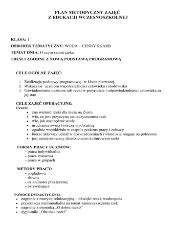 PLAN METODYCZNY ZAJĘĆ Z EDUKACJI WCZESNOSZKOLNEJ KLASA: 1 OŚRODEK TEMATYCZNY: WODA – CENNY SKARB TEMAT DNIA: O czym szumi rzeka TREŚCI ZGODNE Z NOWĄ PODSTAWĄ PROGRAMOWĄ CELE OGÓLNE ZAJĘĆ: 1. Realizacja podstawy programowej w klasie pierwszej. 2. Wskazanie uczniom współzależności człowieka i środowiska 3. Uświadomienie uczniom roli rzeki w przyrodzie i odpowiedzialności człowieka za jej stan CELE ZAJĘĆ OPERACYJNE: Uczeń: zna wartość rzeki dla życia na Ziemi wie, co jest przyczyną zanieczyszczania rzek wie, jak oszczędzać wodę uruchamia swoją twórczą wyobraźnię zgodnie współdziała w zespole podczas pracy i zabawy bierze aktywny udział w doświadczeniach i właściwie reaguje na polecenia jest zainteresowany dziedzictwem kulturowym rzeki FORMY PRACY UCZNIÓW: - praca indywidualna - praca zbiorowa - praca w grupach METODY PRACY: - poglądowa - słowna - działalności praktycznej - aktywizująca POMOCE DYDAKTYCZNE: nagranie z muzyką relaksacyjną – dźwięki rzeki, wodospadu prezentacja multimedialna na temat zanieczyszczenia rzek nagranie z piosenką „O dobra rzeko” dyplomiki „Obrońca rzeki” przeźroczyste szklanki, przegotowana woda, sok owocowy, cytryna, sól rozsypanka sylabowa zeszyt przedmiotowy PRZEBIEG ZAJĘĆ 1. Podanie uczniom celów zajęć. 2. Wprowadzenie do zajęć – ćwiczenia wyobraźni N. zaprasza dzieci na dywan. N.: Połóż się na plecach z rękoma wzdłuż tułowia i lekko rozchylonymi stopami. Zamknij oczy i spróbuj zrelaksować swoje ciało. Zacznij od palców stóp. Poruszaj nimi na wszystkie strony, aż staną się rozluźnione. Rozluźnij swoje nogi, brzuch i klatkę piersiową. Wdychaj i wydychaj powoli i głęboko powietrze przez nos. Teraz pozwól odpocząć swoim rękom, ramionom i szyi. Czy słyszysz delikatny szum wody, trawy kołyszące się na wietrze? Czy czujesz lekki chłód niosący się od wody? Czy słyszysz śpiew ptaków i rechot żab? Wyobraź sobie, że na moment posiadłeś cudowny dar - rozumiesz o czym szumi rzeka. Słuchaj uważnie i zapamiętaj. Ćwiczenie odbywa się przy dźwiękach muzyki relaksacyjnej. 3. Rozmowa na temat wyobrażeń Uczniowie siadają w kręgu i dzielą się swoimi refleksjami. N. zadaje uczniom pytania: - co dzieci robiły nad rzeką, z kim dzieci przyszły nad rzekę, jakie zwierzęta obserwowały dzieci, jakie rośliny zauważyły nad wodą, jak wyglądała woda, jaki miała zapach, co „mówiła” rzeka, czy na coś się skarżyła? N. kieruje rozmowę na temat czystości rzek, dostrzeżenia problemu zanieczyszczania rzek przez człowieka (przemysł, rolnictwo, gospodarstwa domowe). 4. Badanie wody. Uczniowie zostają podzieleni na grupy. Każda grupa otrzymuje do skosztowania czystą, przegotowaną wodę. Uczniowie badają jej smak, kolor i zapach. Następnie mieszają wodę z sokiem owocowym, cytryna , solą i oliwą. Każda grupa opisuje wygląd, smak i zapach wody po zmieszaniu jej z przydzielonym składnikiem. N. zadaje pytanie – od czego zależy smak, kolor, zapach wody? Uczniowie wysnuwają wniosek – smak, zapach i wygląd wody zależy od dodanego do niej składnika. 5. Pokaz prezentacji multimedialnej na temat zanieczyszczenia rzek na świecie. 6. Układanie zdania z rozsypanki sylabowej: Woda to skarb. 7. Przepisanie zdania do zeszytu przedmiotowego 8. Postawienie pytania problemowego: Co możemy zrobić, aby nasze rzeki były czyste? Uczniowie wspólnie z N. formułują wnioski: woda jest bezcennym skarbem, bez którego na Ziemi nie istniałoby życie dlatego musimy wiedzieć jak ją chronić. Możemy to robić na wiele sposobów – tych małych i dużych. Używajmy codziennie wody „z głową” – w czasie kąpieli, sprzątania, zabawy; dbajmy o najbliższą nam rzekę, nie pozwalajmy na jej zanieczyszczanie, obserwujmy żyjące tam zwierzęta i rośliny, informujmy dorosłych o zauważonych zagrożeniach. 9. Słuchanie utworu „O dobra rzeko” . N. opowiada uczniom o tym, że rzeka od zawsze była ważnym tematem dla pisarzy, poetów, malarzy, muzyków. To wokół rzek powstawały największe miasta i rozwijały się największe cywilizacje. Z rzekami wiąże się wiele obrzędów i zwyczajów. 10. Praca domowa: zapytaj dorosłych w jakiej odległości od Twojego domu znajduje się najbliższa rzeka, jak się nazywa; przynieś do szkoły zdjęcia, mapy, ryciny, na których widnieje lokalna rzeka (zapytaj o nie rodziców, dziadków, sąsiadów). Z tych materiałów powstanie klasowa wystawa. 9.Podsumowanie zajęć oraz ocena pracy uczniów na zajęciach – wręczenie dyplomików – „Obrońca rzeki” i wklejenie go zeszytu przedmiotowego.