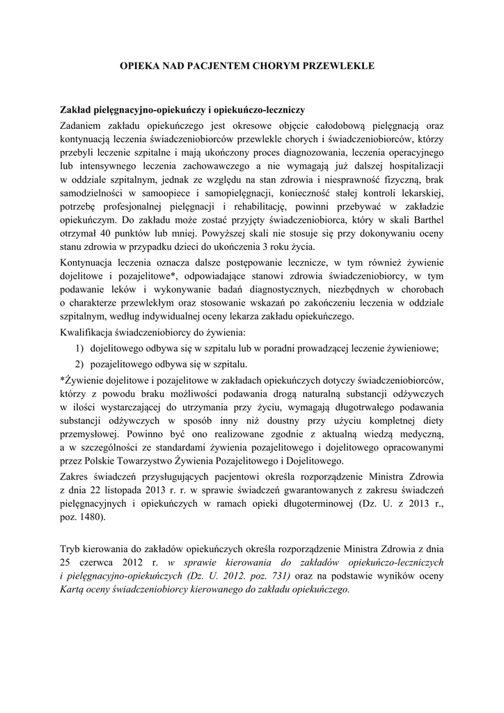 OPIEKA NAD PACJENTEM CHORYM PRZEWLEKLE Zakład pielęgnacyjno-opiekuńczy i opiekuńczo-leczniczy Zadaniem zakładu opiekuńczego jest okresowe objęcie całodobową pielęgnacją oraz kontynuacją leczenia świadczeniobiorców przewlekle chorych i świadczeniobiorców, którzy przebyli leczenie szpitalne i mają ukończony proces diagnozowania, leczenia operacyjnego lub intensywnego leczenia zachowawczego a nie wymagają już dalszej hospitalizacji w oddziale szpitalnym, jednak ze względu na stan zdrowia i niesprawność fizyczną, brak samodzielności w samoopiece i samopielęgnacji, konieczność stałej kontroli lekarskiej, potrzebę profesjonalnej pielęgnacji i rehabilitację, powinni przebywać w zakładzie opiekuńczym. Do zakładu może zostać przyjęty świadczeniobiorca, który w skali Barthel otrzymał 40 punktów lub mniej. Powyższej skali nie stosuje się przy dokonywaniu oceny stanu zdrowia w przypadku dzieci do ukończenia 3 roku życia. Kontynuacja leczenia oznacza dalsze postępowanie lecznicze, w tym również żywienie dojelitowe i pozajelitowe*, odpowiadające stanowi zdrowia świadczeniobiorcy, w tym podawanie leków i wykonywanie badań diagnostycznych, niezbędnych w chorobach o charakterze przewlekłym oraz stosowanie wskazań po zakończeniu leczenia w oddziale szpitalnym, według indywidualnej oceny lekarza zakładu opiekuńczego. Kwalifikacja świadczeniobiorcy do żywienia: 1) dojelitowego odbywa się w szpitalu lub w poradni prowadzącej leczenie żywieniowe; 2) pozajelitowego odbywa się w szpitalu. *Żywienie dojelitowe i pozajelitowe w zakładach opiekuńczych dotyczy świadczeniobiorców, którzy z powodu braku możliwości podawania drogą naturalną substancji odżywczych w ilości wystarczającej do utrzymania przy życiu, wymagają długotrwałego podawania substancji odżywczych w sposób inny niż doustny przy użyciu kompletnej diety przemysłowej. Powinno być ono realizowane zgodnie z aktualną wiedzą medyczną, a w szczególności ze standardami żywienia pozajelitowego i dojelitowego opracowanymi przez Polskie Towarzystwo Żywienia Pozajelitowego i Dojelitowego. Zakres świadczeń przysługujących pacjentowi określa rozporządzenie Ministra Zdrowia z dnia 22 listopada 2013 r. r. w sprawie świadczeń gwarantowanych z zakresu świadczeń pielęgnacyjnych i opiekuńczych w ramach opieki długoterminowej (Dz. U. z 2013 r., poz. 1480). Tryb kierowania do zakładów opiekuńczych określa rozporządzenie Ministra Zdrowia z dnia 25 czerwca 2012 r. w sprawie kierowania do zakładów opiekuńczo-leczniczych i pielęgnacyjno-opiekuńczych (Dz. U. 2012. poz. 731) oraz na podstawie wyników oceny Kartą oceny świadczeniobiorcy kierowanego do zakładu opiekuńczego. Domowa opieka nad pacjentami wentylowanymi mechanicznie Domowa opieka nad pacjentami wentylowanymi mechanicznie jest to opieka nad obłożnie chorymi z niewydolnością oddechową, wymagającymi stosowania inwazyjnej, prowadzonej przy pomocy respiratora (przez rurkę tracheotomijną) bądź nieinwazyjnej (prowadzonej przez różnorodne ustniki, maski czy hełmy) ciągłej lub okresowej terapii oddechowej. Ten rodzaj opieki przeznaczony jest dla pacjentów niewymagających hospitalizacji w oddziałach intensywnej terapii lub pobytu w zakładach opieki całodobowej, jednak wymagających stałego specjalistycznego nadzoru lekarza, profesjonalnej pielęgnacji i rehabilitacji, którzy wyrażą świadomą zgodę na ten typ leczenia. W przypadku dzieci wymagana jest zgoda opiekunów prawnych. Domową opieką nad pacjentami wentylowanymi mechanicznie mogą być objęci chorzy, którzy mają zapewnione odpowiednie warunki domowe i przeszkoloną rodzinę (opiekunów prawnych) w zakresie pielęgnacji i obsługi aparatury medycznej i udzielania pierwszej pomocy, aby mogło być zapewnione bezpieczeństwo pacjenta podczas terapii. Zasady prowadzenia wentylacji w warunkach domowych: wyposażenie chorych w niezbędny sprzęt medyczny, stworzenie poczucia bezpieczeństwa chorym i ich najbliższym poprzez zabezpieczenie dostępu do świadczeń opieki zdrowotnej przez 24 h na dobę we wszystkie dni w tygodniu. Ciągłą lub okresową terapią oddechową przy pomocy respiratora, w warunkach domowych, mogą być objęci pacjenci: z udokumentowanym zakończonym leczeniem przyczynowym, w pełni zdiagnozowani (wykonane wszelkie niezbędne badania diagnostyczne, uzasadniające rozpoznanie i potwierdzające niemożność stosowania innej formy terapii niż ciągła wentylacja). Pacjenci wentylowani mechanicznie w warunkach domowych nie mogą być jednocześnie objęci opieką paliatywną i hospicyjną oraz świadczeniami w zakresie pielęgniarskiej opieki długoterminowej. Podstawą do objęcia opieką pacjenta wentylowanego mechanicznie w warunkach domowych jest skierowanie lekarza ubezpieczenia zdrowotnego. Do skierowania należy dołączyć: kartę informacyjną z leczenia szpitalnego, wyniki badań świadczeniobiorcy, kwalifikację do objęcia opieką w warunkach domowych: a) w przypadku świadczeniobiorców z przewlekłą niewydolnością oddechową, wymagających stosowania inwazyjnej wentylacji mechanicznej – wydaną przez specjalistę anestezjologii i intensywnej terapii zatrudnionego w szpitalu, w którym zakończono leczenie świadczeniobiorcy, b) w przypadku świadczeniobiorców z przewlekłą niewydolnością oddechową, wymagających stosowania nieinwazyjnej wentylacji mechanicznej – wydaną przez specjalistę anestezjologii i intensywnej terapii lub lekarza specjalistę chorób płuc zatrudnionego w szpitalu, w którym zakończono leczenie świadczeniobiorcy. Pielęgniarska opieka długoterminowa (domowa) Pielęgniarska opieka długoterminowa jest to opieka nad obłożnie i przewlekle chorymi przebywającymi w domu. Pacjenci objęci tą opieką nie wymagają hospitalizacji w oddziałach lecznictwa stacjonarnego, ale ze względu na istniejące problemy zdrowotne, wymagają systematycznej i inte