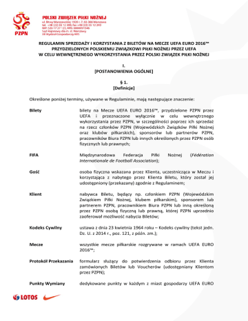 REGULAMIN SPRZEDAŻY I KORZYSTANIA Z BILETÓW NA MECZE UEFA EURO 2016™ PRZYDZIELONYCH POLSKIEMU ZWIĄZKOWI PIŁKI NOŻNEJ PRZEZ UEFA W CELU WEWNĘTRZNEGO WYKORZYSTANIA PRZEZ POLSKI ZWIĄZEK PIŁKI NOŻNEJ I. [POSTANOWIENIA OGÓLNE] § 1. [Definicje] Określone poniżej terminy, używane w Regulaminie, mają następujące znaczenie: Bilety bilety na Mecze UEFA EURO 2016™, przydzielone PZPN przez UEFA i przeznaczone wyłącznie w celu wewnętrznego wykorzystania przez PZPN, w szczególności poprzez ich sprzedaż na rzecz członków PZPN (Wojewódzkich Związków Piłki Nożnej oraz klubów piłkarskich), sponsorów lub partnerów PZPN, pracowników Biura PZPN lub innych określonych przez PZPN osób fizycznych lub prawnych; FIFA Międzynarodowa Federacja Piłki Internationale de Football Association); Gość osoba fizyczna wskazana przez Klienta, uczestnicząca w Meczu i korzystająca z nabytego przez Klienta Biletu, który został jej udostępniony (przekazany) zgodnie z Regulaminem; Klient nabywca Biletu, będący np. członkiem PZPN (Wojewódzkim Związkiem Piłki Nożnej, klubem piłkarskim), sponsorem lub partnerem PZPN, pracownikiem Biura PZPN lub inną określoną przez PZPN osobą fizyczną lub prawną, której PZPN uprzednio zaoferował możliwość nabycia Biletów; Kodeks Cywilny ustawa z dnia 23 kwietnia 1964 roku – Kodeks cywilny (tekst jedn. Dz. U. z 2014 r., poz. 121, z późn. zm.); Mecze wszystkie mecze piłkarskie rozgrywane w ramach UEFA EURO 2016™; Protokół Przekazania formularz służący do potwierdzenia odbioru przez Klienta zamówionych Biletów lub Voucherów (udostępniany Klientom przez PZPN); Punkty Wymiany dedykowane punkty w każdym z miast gospodarzy UEFA EURO Nożnej (Fédération Voucherów 2016™, w którym Klienci lub Goście będą mogli wymieniać swoje Vouchery na Bilety przed odpowiednim Meczem, jeśli Piłkarska Reprezentacja Polski mężczyzn prowadzona przez PZPN zakwalifikuje się do kolejnego etapu fazy pucharowej UEFA EURO 2016™ (tj. do Meczów 1/8, 1/4 i 1/2 finału UEFA EURO 2016™ lub Meczu finałowego UEFA EURO 2016™); PZPN Polski Związek Piłki Nożnej z siedzibą w Warszawie (02-366, ul. Bitwy Warszawskiej 1920 r. nr 7), numer KRS: 0000091546, NIP: 526-17-27-123, będący polskim związkiem sportowym w rozumieniu przepisów ustawy z dnia 25 czerwca 2010 roku o sporcie (tekst jedn. Dz. U. z 2014 r., poz. 715, z późn. zm.), wyłącznie uprawnionym do powołania kadry narodowej w piłce nożnej (Piłkarskiej Reprezentacji Polski mężczyzn) oraz przygotowania jej m.in. do mistrzostw Europy; Regulamin niniejszy regulamin; Regulaminy Stadionów przepisy obowiązujące na Stadionach podczas UEFA EURO 2016™, dostępne na stronie: www.uefa.com/MultimediaFiles/Download/competitions/Ticketi ng/02/25/56/31/2255631_DOWNLOAD.pdf Siła Wyższa zdarzenie, którego nie można było przewidzieć przy zachowaniu należytej staranności, które jest zewnętrzne w stosunku do PZPN lub UEFA, któremu nie mogli się oni przeciwstawić, działając z należytą starannością; zdarzeniami Siły Wyższej są w szczególności strajk, wojna, zamieszki, katastrofa budowlana, huragan, trzęsienie ziemi, powódź i inne katastrowy naturalne; Stadion całość obiektu jakiegokolwiek z oficjalnych stadionów UEFA EURO 2016™, na którym rozgrywany będzie jakikolwiek Mecz, wliczając wszystkie obszary wymagające posiadania Biletu. Na dzień wejścia w życie Regulaminu oficjalne stadiony UEFA EURO 2016™ to: Stade de Bordeaux; Stade Bollaert-Delelis; Stade Pierre Mauroy; Stade de Lyon; Stade Vélodrome; Stade de Nice; Parc des Princes; Stade de France; Stade Geoffroy Guichard; Stade Municipal de Toulouse; UEFA Unia Europejskich Związków Piłkarskich (Union of European Football Associations), będąca organizatorem UEFA EURO 2016™, której siedziba znajduje się przy Route de Genève 46, 1260 Nyon 2, Szwajcaria i jej dowolna spółka zależna, wliczając, ale nie ograniczając się do UEFA Events S.A.; UEFA EURO 2016™ turniej finałowy Mistrzostw Europy w Piłce Nożnej UEFA™ 201416, który odbędzie się we Francji w dniach od 10 czerwca 2016 do 10 lipca 2016 roku, do którego UEFA posiada powiązane prawa eksploatacji na mocy prawa francuskiego; Vouchery dokumenty, uprawniające do odbioru Biletów na dany Mecz (dotyczące w szczególności Meczów fazy pucharowej UEFA EURO 2016™, tj. Meczów 1/8, 1/4 i 1/2 finału UEFA EURO 2016™ oraz Meczu finałowego UEFA EURO 2016™), które muszą być wymienione na Bilety przed odpowiednimi Meczami w wyznaczonym miejscu (Punkcie Wymiany Voucherów), w celu umożliwienia Klientowi lub Gościowi wstępu na Mecze; Vouchery są wyłączną własnością PZPN lub UEFA i nie dają prawa wstępu na Mecze; Zamówienie formularz służący do złożenia przez Klienta zamówienia na zakup Biletów (udostępniany Klientom przez PZPN). § 2. [Przedmiot Regulaminu] 1. Niniejszy Regulamin określa zasady sprzedaży i korzystania z Biletów podczas Meczów UEFA EURO 2016™. 2. Regulamin jest jedynym wiążącym dokumentem określającym warunki umowy sprzedaży i korzystania z Biletów, zawieranej przez Klienta z PZPN (wzorcem umowy w rozumieniu art. 384 Kodeksu Cywilnego). § 3. [Bilety] 1. Bilety są dostępne dla osób, którym PZPN uprzednio zaoferował możliwość ich nabycia. 2. Ogólna liczba (pula) Biletów, jak również liczba (pula) biletów na poszczególne Mecze oraz liczba (pula) Biletów dostępnych dla poszczególnych kategorii podmiotów określonych w ust. 1 powyżej, są ograniczone. 3. Ceny Biletów, wyrażone nominalnie w euro (EUR), będą płatne przez Klientów w złotych polskich (PLN), zgodnie z przedstawionymi Klientom przez PZPN ofertami dotyczącymi nabycia Biletów. 4. Ceny Biletów są cenami brutto i uwzględniają podatek VAT, należny zgodnie z obowiązującymi przepisami. 5. W przypadku Biletów na Mecze fazy pucharowej UEFA EURO 2016™ (tj. Mecze 1/8, 1/4 i 1/2 finał
