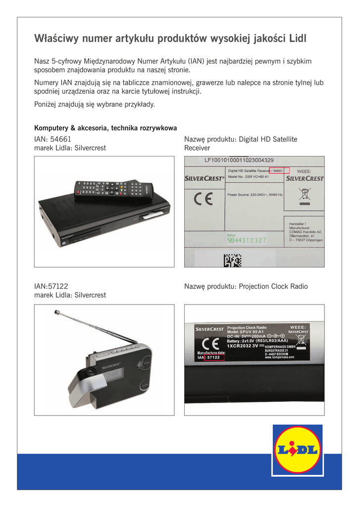 Właściwy numer artykułu produktów wysokiej jakości Lidl Nasz 5-cyfrowy Międzynarodowy Numer Artykułu (IAN) jest najbardziej pewnym i szybkim sposobem znajdowania produktu na naszej stronie. Numery IAN znajdują się na tabliczce znamionowej, grawerze lub nalepce na stronie tylnej lub spodniej urządzenia oraz na karcie tytułowej instrukcji. Poniżej znajdują się wybrane przykłady. Komputery & akcesoria, technika rozrywkowa IAN: 54661 marek Lidla: Silvercrest Nazwę produktu: Digital HD Satellite Receiver IAN:57122 marek Lidla: Silvercrest Nazwę produktu: Projection Clock Radio Ogród & majsterkowanie IAN: 56393 marek Lidla: Florabest Nazwę produktu: Elektro-Kettensäge IAN: 30296 marek Lidla: Powerfix Nazwę produktu: Mini Laser Level Mieszkanie, kuchnia, gospodarstwo domowe, łazienka IAN: 56431 marek Lidla: Silvercrest Nazwę produktu: Mixer IAN:53437 marek Lidla: Livarno Lux Nazwę produktu: LED Ceiling Lamp Sport, czas wolny & hobby IAN: 56081 marek Lidla: Powerfix Nazwę produktu: Bicycle Hoist IAN: 53472 marek Lidla: Livarno Nazwę produktu: Disco Ball