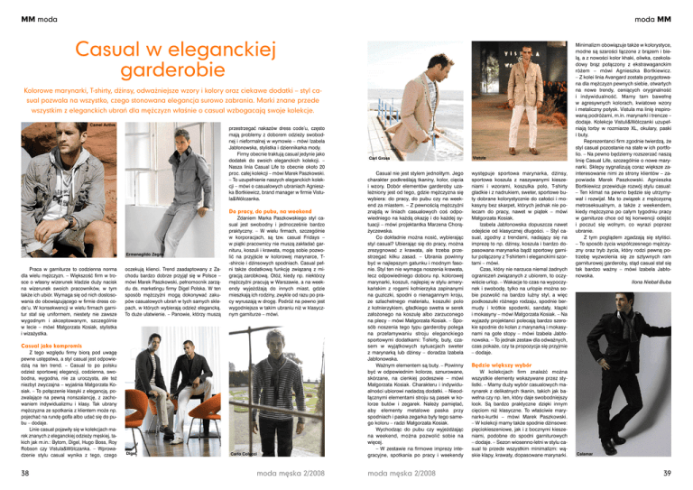 MM moda moda MM Casual w eleganckiej garderobie Kolorowe marynarki, T-shirty, d˝insy, odwa˝niejsze wzory i kolory oraz ciekawe dodatki – styl casual pozwala na wszystko, czego stonowana elegancja surowo zabrania. Marki znane przede wszystkim z eleganckich ubraƒ dla m´˝czyzn w∏aÊnie o casual wzbogacajà swoje kolekcje. Camel Active przestrzegaç nakazów dress code’u, cz´sto majà problemy z doborem odzie˝y swobodnej i nieformalnej w wymowie – mówi Izabela Jab∏onowska, stylistka i dziennikarka mody. Firmy obecnie traktujà casual jedynie jako dodatek do swoich eleganckich kolekcji. – Nasza linia Casual Life to obecnie oko∏o 20 proc. ca∏ej kolekcji – mówi Marek Paszkowski. – To uzupe∏nienie naszych eleganckich kolekcji – mówi o casualowych ubraniach Agnieszka Bortkiewicz, brand manager w firmie Vistula&Wólczanka. Do pracy, do pubu, na weekend Ermenegildo Zegna Praca w garniturze to codzienna norma dla wielu m´˝czyzn. – Wi´kszoÊç firm w trosce o w∏asny wizerunek k∏adzie du˝y nacisk na wizerunek swoich pracowników, w tym tak˝e ich ubiór. Wymaga si´ od nich dostosowania do obowiàzujàcego w firmie dress code’u. W konsekwencji w wielu firmach garnitur sta∏ si´ uniformem, niestety nie zawsze wygodnym i akceptowanym, szczególnie w lecie – mówi Ma∏gorzata Kosiak, stylistka i wiza˝ystka. oczekujà klienci. Trend zaadaptowany z Zachodu bardzo dobrze przyjà∏ si´ w Polsce – mówi Marek Paszkowski, pe∏nomocnik zarzàdu ds. marketingu firmy Digel Polska. W ten sposób m´˝czyêni mogà dokonywaç zakupów casualowych ubraƒ w tych samych sklepach, w których wybierajà odzie˝ eleganckà. To du˝e u∏atwienie. – Panowie, którzy muszà Zdaniem Marka Paszkowskiego styl casual jest swobodny i jednoczeÊnie bardzo praktyczny. – W wielu firmach, szczególnie w korporacjach, sà tzw. casual Fridays – w piàtki pracownicy nie muszà zak∏adaç garnituru, koszuli i krawata, mogà sobie pozwoliç na przyjÊcie w kolorowej marynarce, T-shircie i d˝insowych spodniach. Casual pe∏ni tak˝e dodatkowà funkcj´ zwiàzanà z migracjà zarobkowà. Otó˝, kiedy np. niektórzy m´˝czyêni pracujà w Warszawie, a na weekendy wyje˝d˝ajà do innych miast, gdzie mieszkajà ich rodziny, zwykle od razu po pracy wyruszajà w drog´. Podró˝ na pewno jest wygodniejsza w takim ubraniu ni˝ w klasycznym garniturze – mówi. Casual jako kompromis Z tego wzgl´du firmy biorà pod uwag´ pewne ust´pstwa, a styl casual jest odpowiedzià na ten trend. – Casual to po polsku odzie˝ sportowej elegancji, codzienna, swobodna, wygodna, nie za uroczysta, ale te˝ niezbyt zwyczajna – wyjaÊnia Ma∏gorzata Kosiak. – To po∏àczenie klasyki z elegancjà, pozwalajàce na pewnà nonszalancj´, z zachowaniem indywidualizmu i klasy. Tak ubrany m´˝czyzna ze spotkania z klientem mo˝e np. pojechaç na rund´ golfa albo udaç si´ do pubu – dodaje. Linie casual pojawi∏y si´ w kolekcjach marek znanych z eleganckiej odzie˝y m´skiej, takich jak m.in.: Bytom, Digel, Hugo Boss, Roy Robson czy Vistula&Wólczanka. – Wprowadzenie stylu casual wynika z tego, czego 38 Digel Carlo Colucci moda m´ska 2/2008 Carl Gross Casual nie jest stylem jednolitym. Jego charakter podkreÊlajà tkaniny, kolor, ci´cia i wzory. Dobór elementów garderoby uzale˝niony jest od tego, gdzie m´˝czyzna si´ wybiera: do pracy, do pubu czy na weekend za miastem. – Z pewnoÊcià m´˝czyêni znajdà w liniach casualowych coÊ odpowiedniego na ka˝dà okazj´ i do ka˝dej sytuacji – mówi projektantka Marzena Chorà˝yczewska. Co dok∏adnie mo˝na nosiç, wybierajàc styl casual? Ubierajàc si´ do pracy, mo˝na zrezygnowaç z krawata, ale trzeba przestrzegaç kilku zasad. – Ubrania powinny byç w najlepszym gatunku i modnym fasonie. Styl ten nie wymaga noszenia krawata, lecz odpowiedniego doboru np. kolorowej marynarki, koszuli, najlepiej w stylu amerykaƒskim z rogami ko∏nierzyka zapinanymi na guziczki, spodni o nienagannym kroju, ze szlachetnego materia∏u, koszulki polo z ko∏nierzykiem, g∏adkiego swetra w serek za∏o˝onego na koszul´ albo zarzuconego na plecy – mówi Ma∏gorzata Kosiak. – Sposób noszenia tego typu garderoby polega na prze∏amywaniu stroju eleganckiego sportowymi dodatkami: T-shirty, buty, czasem w wyjàtkowych sytuacjach sweter z marynarkà lub d˝insy – doradza Izabela Jab∏onowska. Wa˝nym elementem sà buty. – Powinny byç w odpowiednim kolorze, sznurowane, skórzane, na cienkiej podeszwie – mówi Ma∏gorzata Kosiak. Charakteru i indywidualnoÊci ubiorowi nadadzà dodatki. – Nieod∏àcznymi elementami stroju sà pasek w kolorze butów i zegarek. Nale˝y pami´taç, aby elementy metalowe paska przy spodniach i paska zegarka by∏y tego samego koloru – radzi Ma∏gorzata Kosiak. Wychodzàc do pubu czy wyje˝d˝ajàc na weekend, mo˝na pozwoliç sobie na wi´cej. – W zestawie na firmowe imprezy integracyjne, spotkania po pracy i weekendy moda m´ska 2/2008 Vistula wyst´puje sportowa marynarka, d˝insy, sportowa koszula z naszywanymi kieszeniami i wzorami, koszulka polo, T-shirty g∏adkie i z nadrukiem, sweter, sportowe buty dobrane kolorystycznie do ca∏oÊci i mokasyny bez skarpet, których jednak nie polecam do pracy, nawet w piàtek – mówi Ma∏gorzata Kosiak. Izabela Jab∏onowska dopuszcza nawet odejÊcie od klasycznej d∏ugoÊci. – Styl casual, zgodny z trendami, nadajàcy si´ na imprez´ to np. d˝insy, koszula i bardzo dopasowana marynarka bàdê sportowy garnitur po∏àczony z T-shirtem i eleganckimi szortami – mówi. Czas, który nie narzuca niemal ˝adnych ograniczeƒ zwiàzanych z ubiorem, to oczywiÊcie urlop. – Wakacje to czas na wypoczynek i swobod´, tylko na urlopie mo˝na sobie pozwoliç na bardzo luêny styl, a wi´c podkoszulki ró˝nego rodzaju, spodnie bermudy i krótkie spodenki, sanda∏y, klapki i mokasyny – mówi Ma∏gorzata Kosiak. – Na wyjazdy projektanci polecajà ba