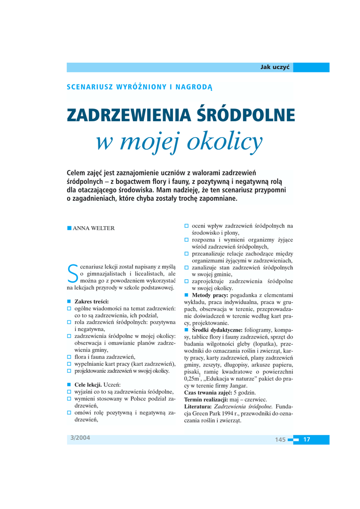 Jak uczyç SCENARIUSZ WYRÓ˚NIONY I NAGRODÑ ZADRZEWIENIA ÂRÓDPOLNE w mojej okolicy Celem zaj´ç jest zaznajomienie uczniów z walorami zadrzewieƒ Êródpolnych – z bogactwem flory i fauny, z pozytywnà i negatywnà rolà dla otaczajàcego Êrodowiska. Mam nadziej´, ˝e ten scenariusz przypomni o zagadnieniach, które chyba zosta∏y troch´ zapomniane. ANNA WELTER oceni wp∏yw zadrzewieƒ Êródpolnych na Êrodowisko i plony, rozpozna i wymieni organizmy ˝yjàce wÊród zadrzewieƒ Êródpolnych, przeanalizuje relacje zachodzàce mi´dzy S cenariusz lekcji zosta∏ napisany z myÊlà o gimnazjalistach i licealistach, ale mo˝na go z powodzeniem wykorzystaç na lekcjach przyrody w szkole podstawowej. Zakres treÊci: ogólne wiadomoÊci na temat zadrzewieƒ: co to sà zadrzewienia, ich podzia∏, rola zadrzewieƒ Êródpolnych: pozytywna i negatywna, zadrzewienia Êródpolne w mojej okolicy: obserwacja i omawianie planów zadrzewienia gminy, flora i fauna zadrzewieƒ, wype∏nianie kart pracy (kart zadrzewieƒ), projektowanie zadrzewieƒ w swojej okolicy. Cele lekcji. Uczeƒ: wyjaÊni co to sà zadrzewienia Êródpolne, wymieni stosowany w Polsce podzia∏ za- drzewieƒ, omówi rol´ pozytywnà i negatywnà za- drzewieƒ, 3/2004 organizmami ˝yjàcymi w zadrzewieniach, zanalizuje stan zadrzewieƒ Êródpolnych w swojej gminie, zadrzewienia Êródpolne w swojej okolicy. Metody pracy: pogadanka z elementami wyk∏adu, praca indywidualna, praca w grupach, obserwacja w terenie, przeprowadzanie doÊwiadczeƒ w terenie wed∏ug kart pracy, projektowanie. Ârodki dydaktyczne: foliogramy, kompasy, tablice flory i fauny zadrzewieƒ, sprz´t do badania wilgotnoÊci gleby (∏opatka), przewodniki do oznaczania roÊlin i zwierzàt, karty pracy, karty zadrzewieƒ, plany zadrzewieƒ gminy, zeszyty, d∏ugopisy, arkusze papieru, pisaki, rami´ kwadratowe o powierzchni 2 0,25m , „Edukacja w naturze” pakiet do pracy w terenie firmy Jangar. Czas trwania zaj´ç: 5 godzin. Termin realizacji: maj – czerwiec. Literatura: Zadrzewienia Êródpolne. Fundacja Green Park 1994 r., przewodniki do oznaczania roÊlin i zwierzàt. zaprojektuje 145 17 Jak uczyç TOK ZAJ¢å Faza wprowadzajàca 1. Sprawy organizacyjno-porzàdkowe: zapoznanie uczniów z tematem lekcji, omówienie planu zaj´ç, przypomnienie zasad bezpieczeƒstwa podczas zaj´ç terenowych, podzia∏ klasy na 5 grup, rozdanie materia∏ów. 2. Krótka pogadanka z elementami wyk∏adu na temat, co to sà zadrzewienia Êródpolne, rodzaje i typy zadrzewieƒ (foliogramy). 3. Krótka dyskusja na temat wp∏ywu zadrzewieƒ na Êrodowisko (wnioski uczniów zapisane na arkuszu papieru). Faza realizacyjna 1. DojÊcie lub dojazd do miejsca zadrzewieƒ Êródpolnych. 2. Rozdanie kart pracy wczeÊniej ustalonym grupom, omówienie miejsc pracy: Grupa I: badanie wilgotnoÊci gleby w zadrzewieniach i kilka metrów od zadrzewieƒ. Grupa II: badanie intensywnoÊci wiatru za pomocà choràgiewki, kierunku wiatru za pomocà kompasu w zadrzewieniach i poza nimi. Grupa IIÎ: badanie flory w zadrzewieniach na podstawie przewodników i kluczy do oznaczania roÊlin. Grupa IV: badanie fauny w zadrzewieniach na podstawie przewodników i kluczy do oznaczania zwierzàt. Grupa V: badanie intensywnoÊci wegetacji i zag´szczenia roÊlin woko∏o zadrzewieƒ za pomocà linijki i ramienia kwadra2 towego o powierzchni 0,25m . 3. Szkicowanie planu badanego zadrzewienia Êródpolnego przez ka˝dà z grup. Zbieranie danych przez grupy, wst´pne omówienie w terenie i powrót do szko∏y. 4. Wspólne omówienie zebranych danych i opracowanie wniosków z zadaƒ. Liderzy grup omawiajà doÊwiadczenia, jakie przeprowadzano w terenie i przedstawiajà wnioski. Ka˝da grupa przedstawia swoje wyniki i wnioski w formie plakatu. 18 146 5. Wspólne wype∏nianie karty zadrzewieƒ badanego terenu. 6. Podzia∏ klasy na 4 grupy. Ka˝da grupa otrzymuje plany zadrzewienia cz´Êci terenu gminy. Analizowanie terenu pod wzgl´dem iloÊciowym i jakoÊciowym zadrzewieƒ Êródpolnych. Faza podsumowujàca 1. Dyskusja na temat pozytywnej i negatywnej roli zadrzewieƒ Êródpolnych. Porównanie ze stwierdzeniami zapisanymi przed wyjÊciem w teren. 2. Praca do domu: wype∏nianie karty zadrzewieƒ Êródpolnych w swojej najbli˝szej okolicy. 3. Podzi´kowanie za wspólnà prac´, zakoƒczenie lekcji. Zasi´g penetracji zwierzàt zamieszkujàcych zadrzewienia (Na podstawie Zadrzewienia Êródpolne, 1994) Zwierz´ Zasi´g penetracji Mrówka Biegacz Ropucha Dzie˝ba Trznadel Ryjówka ¸asica Je˝ Gronostaj Kuna domowa Lis 50 m 50 m 150 m 50 m 150 m 200 m 150 m 250 m 300 m 1 km 2-3 km I. PODZIA¸ ZADRZEWIE¡ 1. Pojedyncze – drzewa i krzewy sadzone luêno i niezale˝nie od siebie. 2. Grupowe – drzewa i krzewy wyst´pujà w k´pach do kilkudziesi´ciu sztuk, a ich powierzchnia nie przekracza 10 arów. 3. Rz´dowe – drzewa i krzewy wyst´pujà w jednym rz´dzie o dowolnej d∏ugoÊci. 4. Pasowe – drzewa i krzewy wyst´pujà w dwóch i wi´cej równoleg∏ych rz´dach, o szerokoÊci do 10 m. 5. Powierzchniowe – zajmujà obszar powy˝ej 10 arów. biologia w szkole Jak uczyç KARTA PRACY I Badanie wilgotnoÊci gleby 1. OczyÊç fragment gleby (odgarnij, oczyÊç z roÊlinnoÊci) wewnàtrz zadrzewienia Êródpolnego. 2. Za pomocà ∏opatki wykop troch´ gleby i r´kà sprawdê jej konsystencj´. 3. Zapisz: jakie zabarwienie ma wykopana gleba? ............................................................................... jaki zapach ma gleba? ............................................................................................................ ma konsystencj´: pylastà ............................................., zwi´z∏à ........................................... jest sucha ................................................................................................................................ jest wilgotna .....................................................................