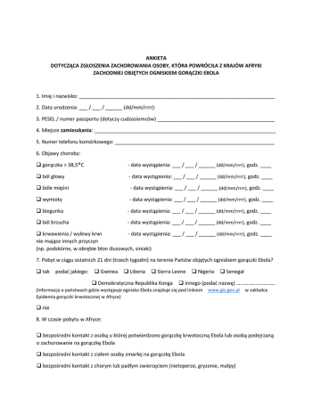 ANKIETA DOTYCZĄCA ZGŁOSZENIA ZACHOROWANIA OSOBY, KTÓRA POWRÓCIŁA Z KRAJÓW AFRYKI ZACHODNIEJ OBJĘTYCH OGNISKIEM GORĄCZKI EBOLA 1. Imię i nazwisko: ______________________________________________________________________ 2. Data urodzenia: ___ / ___ / ______ (dd/mm/rrrr): 3. PESEL / numer paszportu (dotyczy cudzoziemców) __________________________________________ 4. Miejsce zamieszkania: _________________________________________________________________ 5. Numer telefonu komórkowego: _________________________________________________________ 6. Objawy choroby: gorączka > 38,5°C - data wystąpienia: ___ / ___ / ______ (dd/mm/rrrr), godz. ____ ból głowy - data wystąpienia: ___ / ___ / ______ (dd/mm/rrrr), godz. ____ bóle mięśni - data wystąpienia: ___ / ___ / ______ (dd/mm/rrrr), godz. ____ wymioty - data wystąpienia: ___ / ___ / ______ (dd/mm/rrrr), godz. ____ biegunka - data wystąpienia: ___ / ___ / ______ (dd/mm/rrrr), godz. ____ ból brzucha - data wystąpienia: ___ / ___ / ______ (dd/mm/rrrr), godz. ____ krwawienia / wylewy krwi - data wystąpienia: ___ / ___ / ______ (dd/mm/rrrr), godz. ____ nie mające innych przyczyn (np. podskórne, w obrębie błon śluzowych, siniaki) 7. Pobyt w ciągu ostatnich 21 dni (trzech tygodni) na terenie Państw objętych ogniskiem gorączki Ebola? tak podać jakiego: Gwinea Liberia Sierra Leone Demokratyczna Republika Konga Nigeria Senegal innego (podać nazwę) ………………………… (Informacja o państwach gdzie występuje ognisko Ebola znajduje się pod linkiem Epidemia gorączki krwotocznej w Afryce) www.gis.gov.pl w zakładce nie 8. W czasie pobytu w Afryce: bezpośredni kontakt z osobą u której potwierdzono gorączkę krwotoczną Ebola lub osobą podejrzaną o zachorowanie na gorączkę Ebola bezpośredni kontakt z ciałem osoby zmarłej na gorączkę Ebola bezpośredni kontakt z chorym lub padłym zwierzęciem (nietoperze, gryzonie, małpy) 9. Data wyjazdu z kraju objętego ogniskiem Ebola: ___ / ___ / ______ (dd/mm/rrrr): 10. Data powrotu do Polski: ___ / ___ / ______ (dd/mm/rrrr) 11. Trasa podróży międzynarodowej (z międzylądowaniami). 12. Osoby z najbliższego otoczenia Imię i nazwisko Numer telefonu kontaktowego Adres zamieszkania Charakter kontaktu __________________________ data pieczątka i podpis lekarza