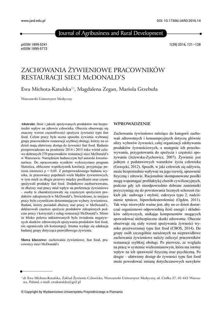 www.jard.edu.pl DOI: 10.17306/JARD.2016.14 Journal of Agribusiness and Rural Development pISSN 1899-5241 eISSN 1899-5772 1(39) 2016, 121–128 ZACHOWANIA ŻYWIENIOWE PRACOWNIKÓW RESTAURACJI SIECI McDONALD’S Ewa Michota-Katulska, Magdalena Zegan, Mariola Grzebuła Warszawski Uniwersytet Medyczny Abstrakt. Ilość i jakość spożywanych produktów ma bezpośredni wpływ na zdrowie człowieka. Obecnie obserwuje się znaczny wzrost częstotliwości spożycia żywności typu fast food. Celem pracy była ocena sposobu żywienia wybranej grupy pracowników restauracji szybkiej obsługi, którzy na co dzień mają ułatwiony dostęp do żywności fast food. Badanie przeprowadzono na przełomie 2014 i 2015 roku wśród celowo dobranych 270 pracowników restauracji sieci McDonald’s w Warszawie. Narzędziem badawczym był autorski kwestionariusz. Do opracowania wyników wykorzystano program Statistica, obliczono współczynnik korelacji, przyjmując poziom istotności p < 0,05. Z przeprowadzonego badania wynika, że pracownicy popełniali wiele błędów żywieniowych, w tym mieli za długie przerwy między posiłkami oraz często spożywali produkty fast food. Dodatkowo zaobserwowano, że dłuższy staż pracy miał wpływ na preferencje żywieniowe – osoby te charakteryzowały się częstszym spożyciem produktów zakupionych w McDonald’s. Stwierdzono, że miejsce pracy było czynnikiem determinującym wybory żywieniowe. Badani, którzy posiadali dłuższy staż pracy w McDonald’s, deklarowali częstsze spożycie produktów zakupionych podczas pracy i korzystali z usług restauracji McDonald’s. Mimo że blisko połowa ankietowanych była świadoma negatywnych skutków zdrowotnych spożywania produktów fast food, nie ograniczała ich konsumpcji. Istotna wydaje się edukacja badanej grupy dotycząca prawidłowego żywienia. Słowa kluczowe: zachowania żywieniowe, fast food, pracownicy sieci McDonald’s WPROWADZENIE Zachowania żywieniowe należące do kategorii zachowań zdrowotnych i konsumpcyjnych dotyczą głównie sfery wyborów żywności, całej organizacji zdobywania produktów żywnościowych, a następnie ich przechowywania, przygotowania do spożycia i częstości spożywania (Jeżewska-Zychowicz, 2007). Żywienie jest jednym z podstawowych warunków życia człowieka (Gawęcki, 2012). Sposób, w jaki człowiek się odżywia, może bezpośrednio wpływać na jego rozwój, sprawność fizyczną i zdrowie. Racjonalnie skomponowane posiłki mogą wspomagać profilaktykę chorób cywilizacyjnych, podczas gdy ich nieodpowiednio dobrane zamienniki przyczyniają się do powstawania licznych schorzeń (takich jak: nadwaga i otyłość, cukrzyca typu 2, nadciśnienie tętnicze, hipercholesterolemia) (Ogden, 2011). Tak więc niezwykle ważne jest, aby na co dzień dostarczać organizmowi odpowiednią ilość energii i składników odżywczych, unikając komponentów mogących spowodować niebezpieczne skutki zdrowotne. Obecnie obserwuje się stały wzrost spożywania żywności wysoko przetworzonej typu fast food (CBOS, 2014). Do grupy osób szczególnie narażonych na nieprawidłowe zachowania żywieniowe należy zaliczyć pracowników restauracji szybkiej obsługi. Po pierwsze, ze względu na pracę w systemie wielozmianowym, która ma istotny wpływ na ich sprawność fizyczną oraz psychiczną. Po drugie – ułatwiony dostęp do żywności typu fast food może powodować zmianę dotychczasowych nawyków dr Ewa Michota-Katulska, Zakład Żywienia Człowieka, Warszawski Uniwersytet Medyczny, ul. Ciołka 27, 01-445 Warszawa, Poland, e-mail: [email protected] © Copyright by Wydawnictwo Uniwersytetu Przyrodniczego w Poznaniu Michota-Katulska, E., Zegan, M., Grzebuła, M. (2016). Zachowania żywieniowe pracowników restauracji sieci McDonald’s. J. Agribus. Rural Dev., 1(39), 121–128. DOI: 10.17306/JARD.2016.14 żywieniowych i spowodować uzależnienie od tego typu produktów (Kessler, 2009). Panująca moda na spożywanie posiłków w placówkach typu fast food dotyczy zwłaszcza restauracji McDonald’s (Levytska, 2011). McDonald’s jest największą na świecie siecią restauracji szybkiej obsługi. Istnieje ponad 35 tysięcy lokali w ponad 100 krajach i łącznie pracuje w nich ponad 1,5 miliona pracowników, którzy codziennie obsługują 70 milionów gości (Pietrak i Rembiałkowska, 2012). W Polsce funkcjonuje więcej niż 350 restauracji McDonald’s w ponad 100 miastach, zatrudniających ponad 17 tysięcy pracowników (McDonald’s, 2015). CHARAKTERYSTYKA WARTOŚCI ODŻYWCZEJ PRODUKTÓW FAST FOOD Żywność typu fast food (z ang. szybka żywność) to rodzaj zazwyczaj taniego pożywienia, które jest w bardzo krótkim czasie przygotowywane i może być podawane na ciepło. Do tej grupy żywności zaliczane są m.in. frytki, hamburgery, hot dogi, kebaby, pizza i różnego rodzaju zapiekanki. Produkty te charakteryzują się wysoką wartością energetyczną, a także znaczną zawartością tłuszczu i nasyconych kwasów tłuszczowych oraz soli kuchennej (Mojska, 2007). Dzienne zalecane spożycie sodu określono na 1,5 g (w przeliczeniu na chlorek sodu: 3,8 g); przyjęto również maksymalny poziom, który nie powoduje niepożądanych efektów i jest to 2,5 g sodu (Szybiński i in., 2010). Porcja wybranych produktów z restauracji McDonald’s w zależności od rodzaju zawiera od 0,5 do 3,6 g soli i realizuje tym samym od 9% do 61% maksymalnego dziennego spożycia soli rekomendowanego przez Światową Organizację Zdrowia (WHO). W paczce frytek ziemniaczanych na zawartość soli wpływ ma, oprócz wielkości porcji, dosalanie frytek po usmażeniu (Michalak-Majewska i in., 2013; Mojska i Świderska, 2011; 2012). Według WHO należy ograniczyć ilość tłuszczu w codziennej diecie tak, aby zawierała ona nie więcej niż 1% kwasów tłuszczowych trans pochodzących z tłuszczów nasyconych. Porcja wybranych produktów z restauracji McDonald’s, w zależności od rodzaju,